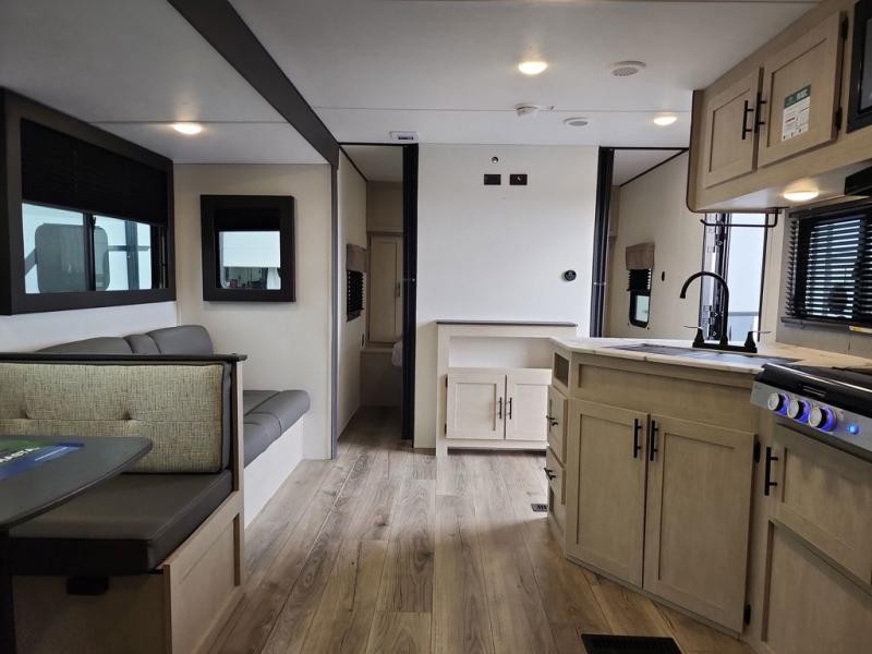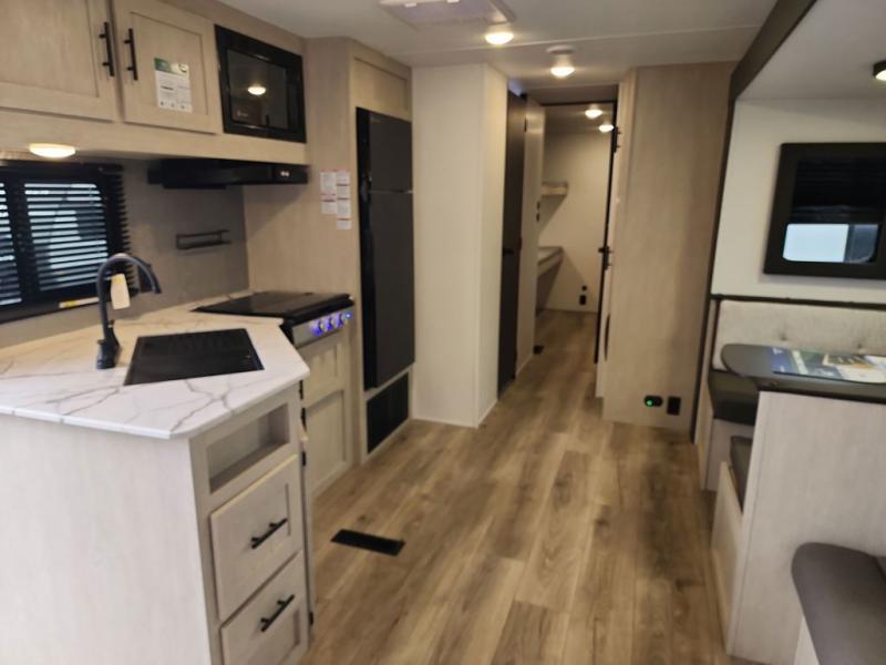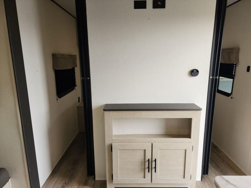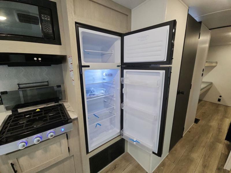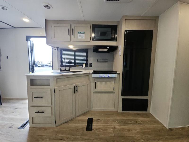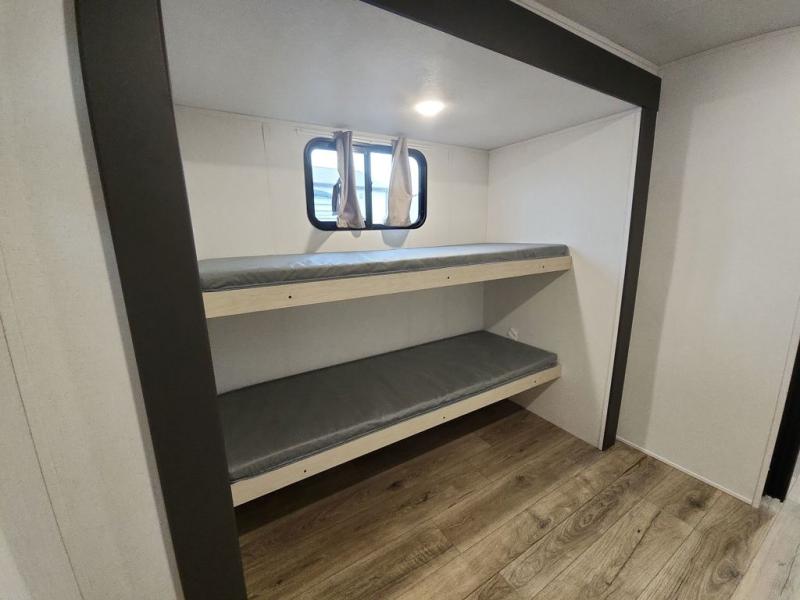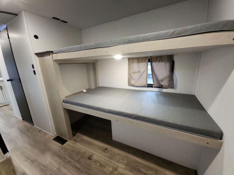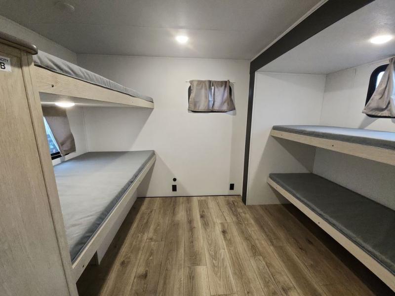 There are a set of 38" x 74" bunks and a set of 26" x 74" bunks in this trailer for lots of sleeping space! This bunkroom also includes a slide out for more space, and you can choose the optional double suite with a 54" x 74" bed if you don't need the bunks. The kitchen is fully equipped for your camping trips featuring a three burner cooktop, an overhead microwave oven, a large sink, and plenty of storage space. You will also love the pantry for all of your canned goods and snacks. The bath features a 24" x 40" shower, toilet, and vanity/sink. In the front of this unit, a private bedroom provides a quiet retreat from the rest of the unit with dual entry doors, and you'll appreciate having dual bedroom wardrobes to keep your clothes organized. Outside, enjoy pass-through storage for all of your outdoor camping gear plus more.