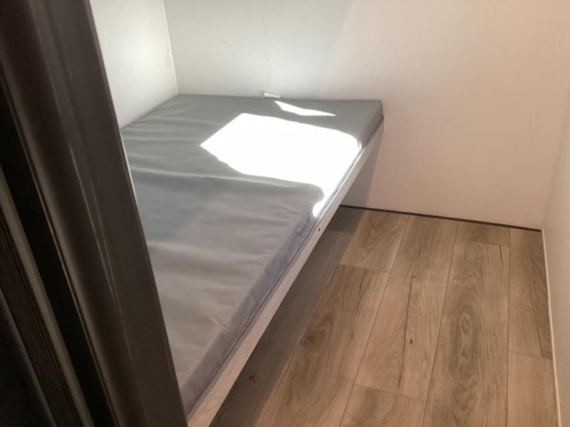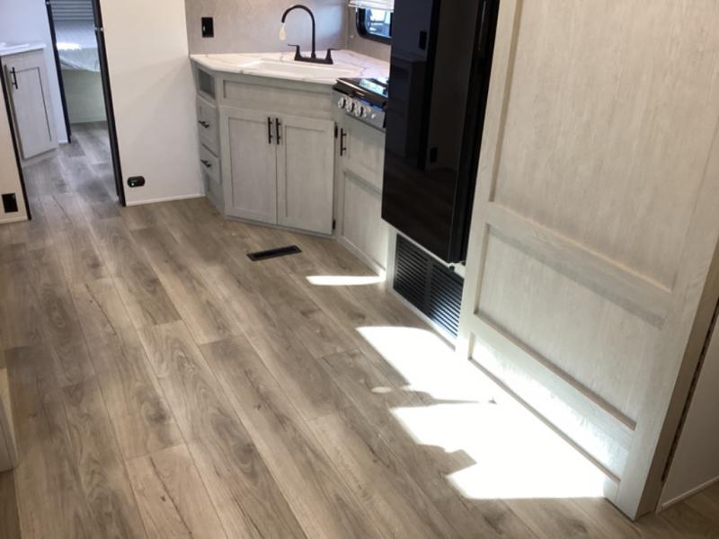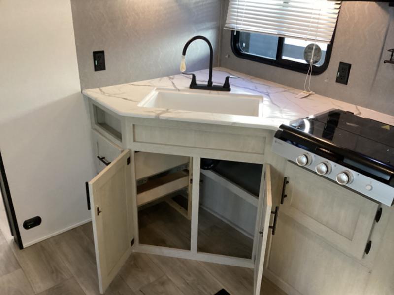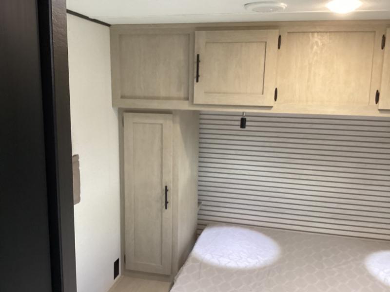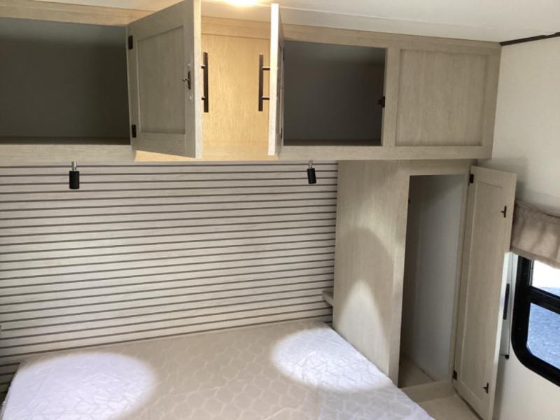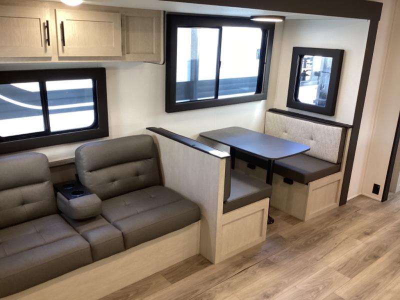 The little ones or your guests will love the bunkhouse in this spacious trailer. There area a set of 48" x 74" bunks in the rear private bunk house they can sleep and relax. You'll find your own space in the front bedroom that includes a walk-around queen bed and overhead cabinets. Everyone can meet in the middle living area and kitchen to dine around the booth dinette or relax on the sofa. The chef will be able to create delicious meals each day on the three burner cooktop, and there is a residential style refrigerator for perishables. And the full bath is sure to come in handy after a day of swimming or hiking!