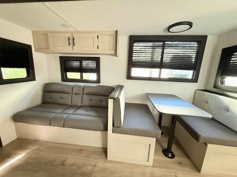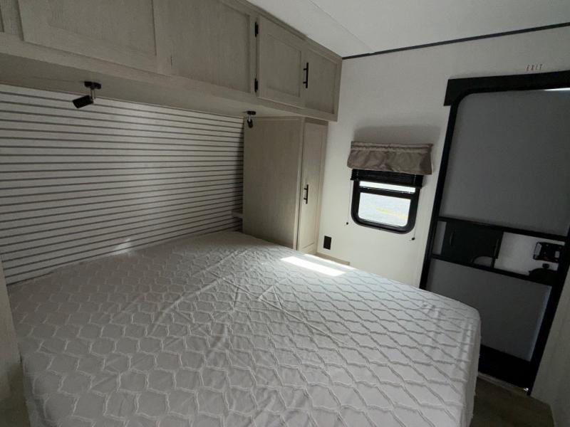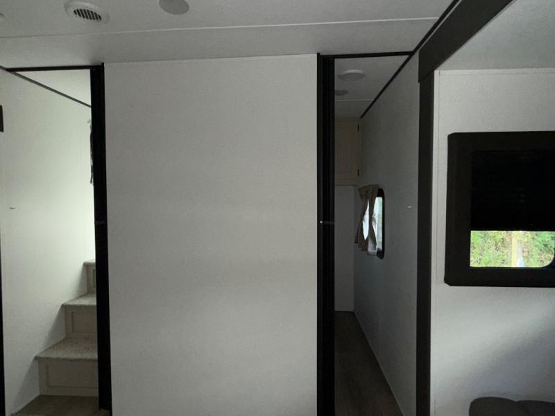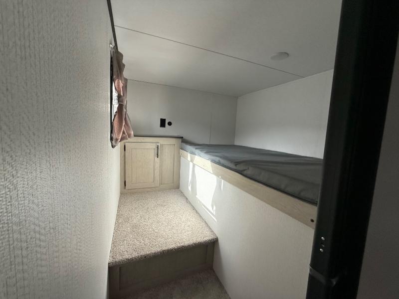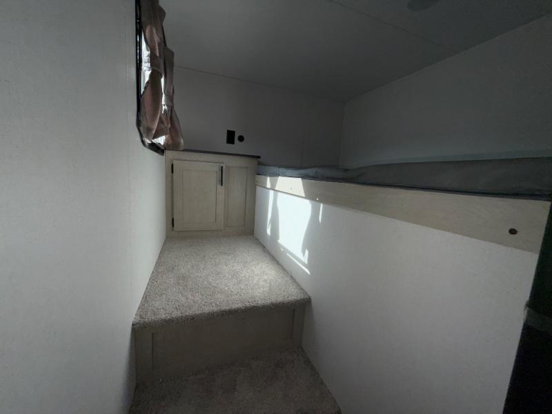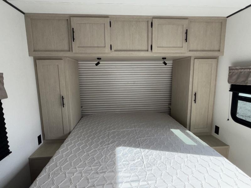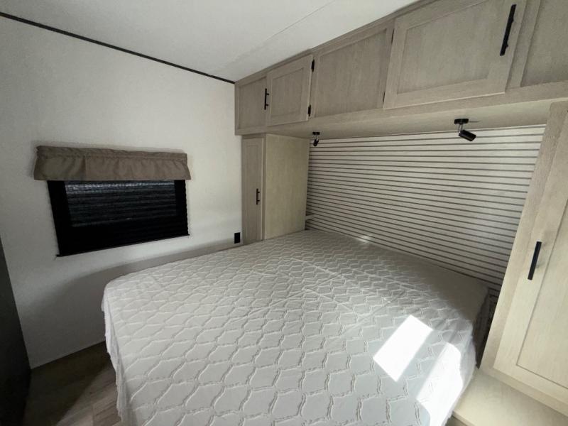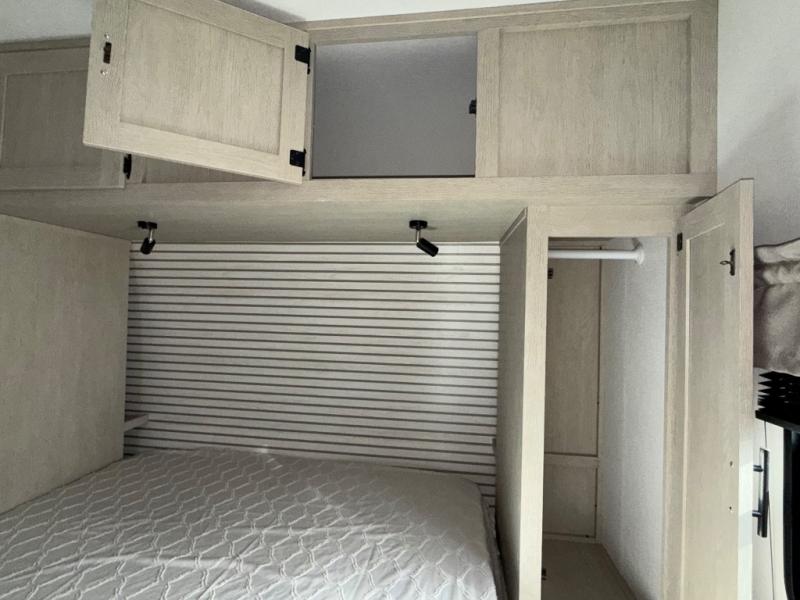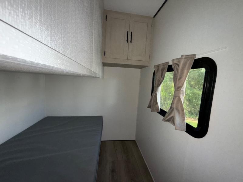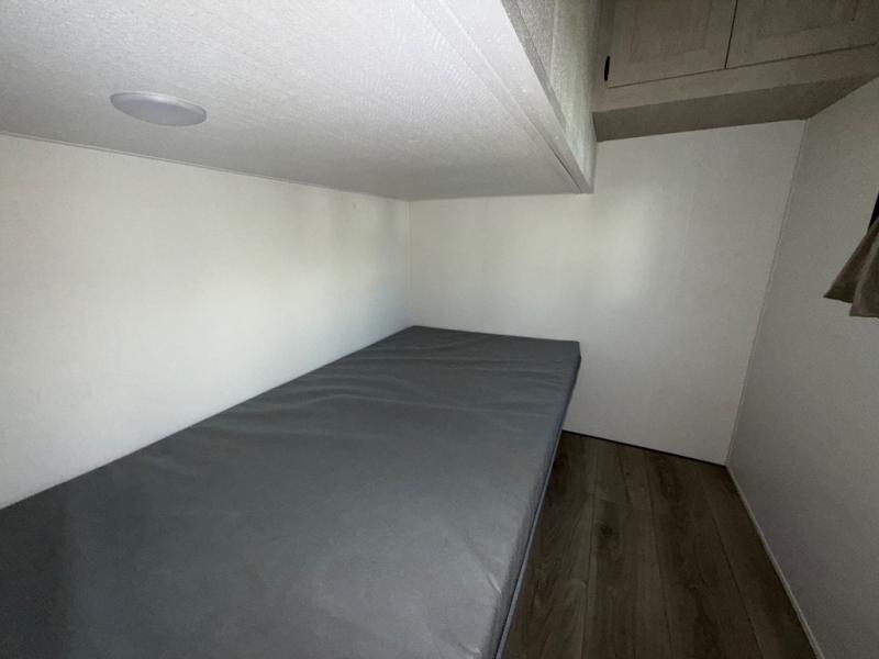private rear bunk spaces. It is designed to sleep up to 8 people. The configuration includes two bunk beds, providing dedicated sleeping areas for children or guests away from the main living area. This private design allows for greater separation and quiet when needed. The master bedroom is located at the front of the travel trailer and offers a private retreat. It features a queen-size bed. The bedroom is separated by an accordion-style door. The area includes under-bed storage with included baskets and blackout shades for privacy. It has curtains/shades, a TV antenna pre-wiring, and is part of a walkthrough bathroom layout