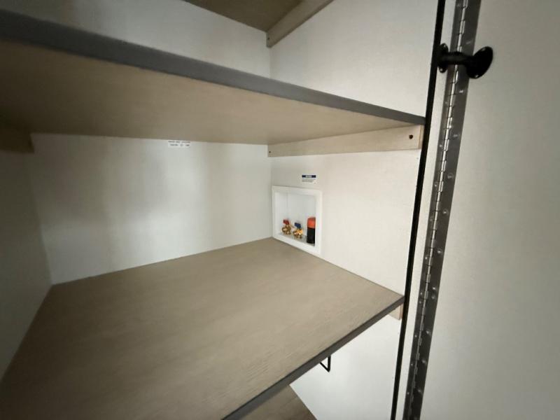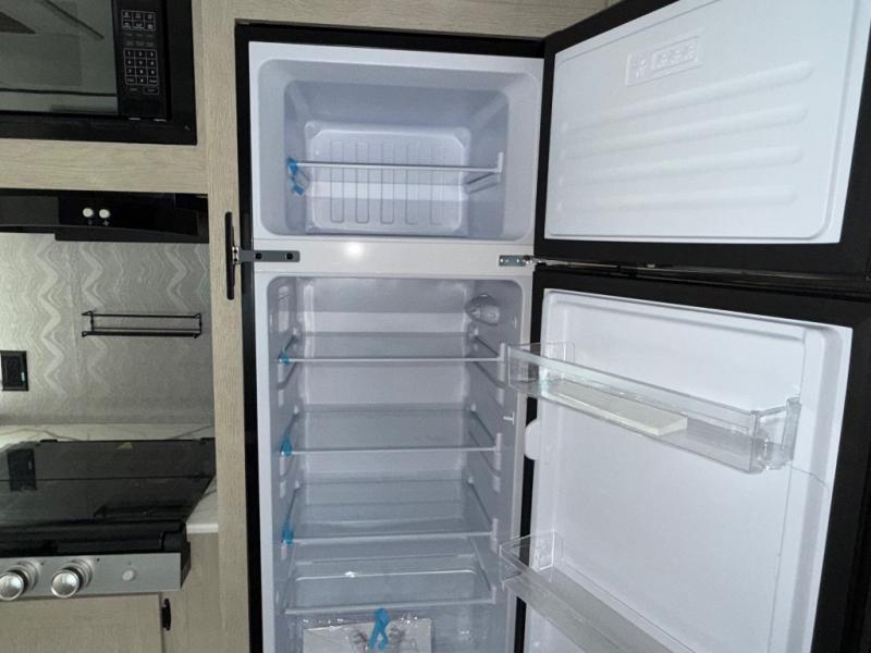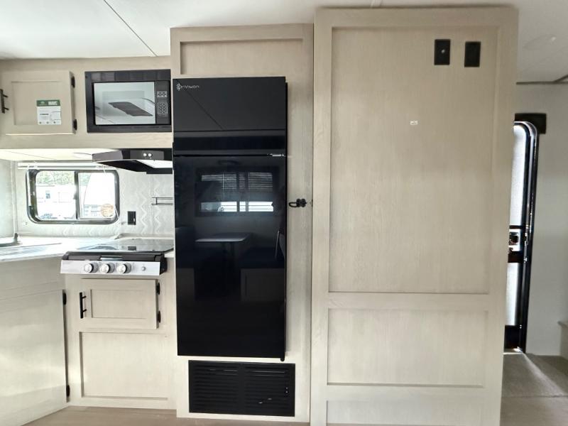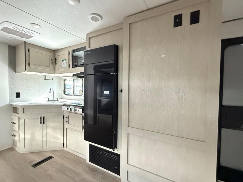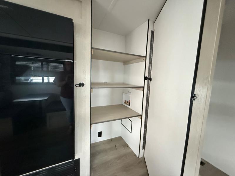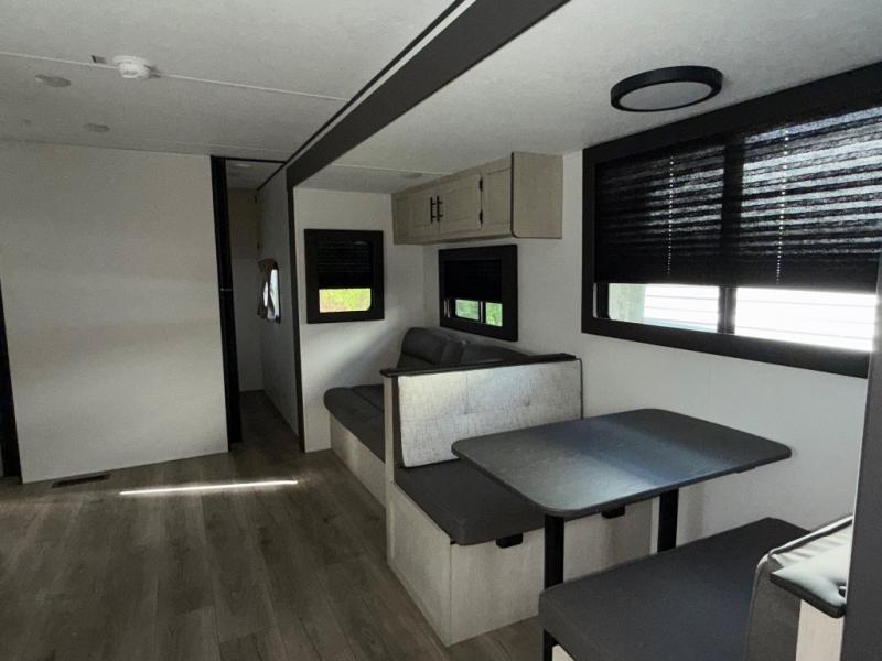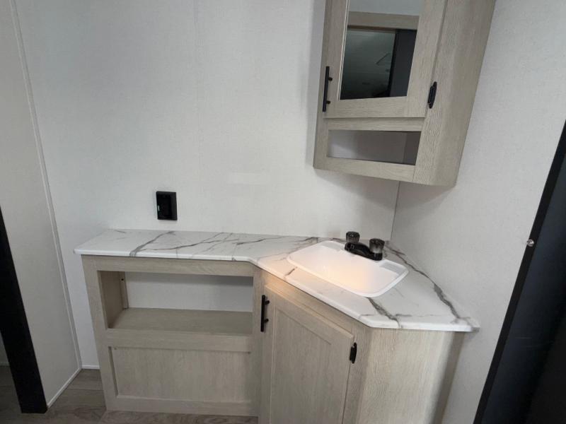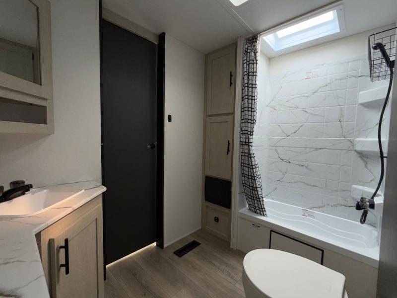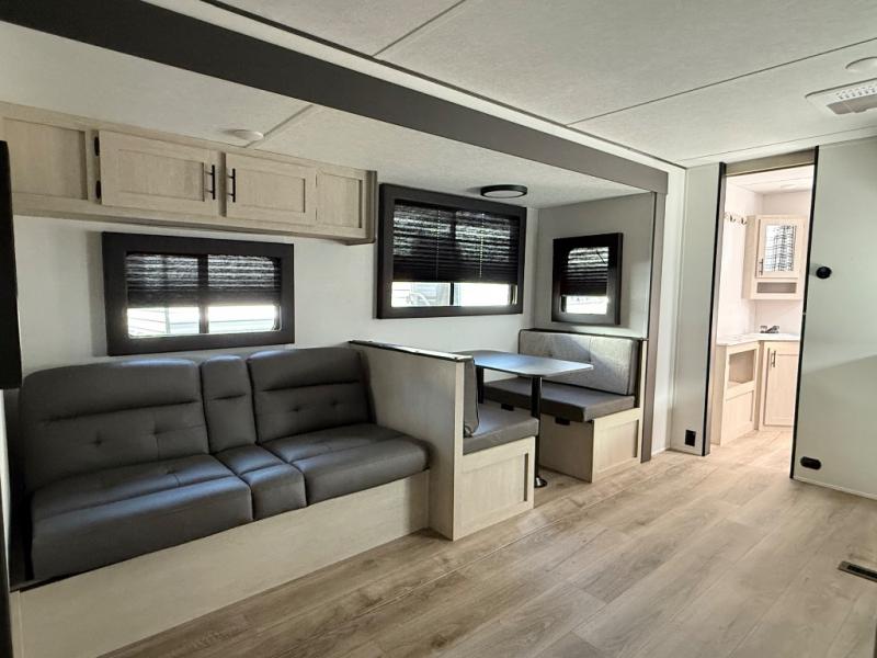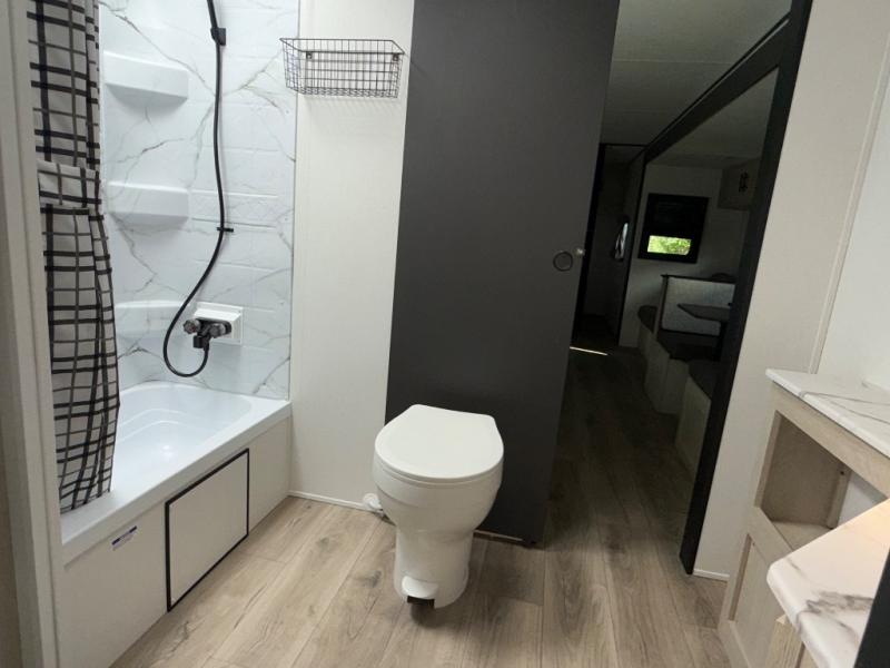 private rear bunk spaces. It is designed to sleep up to 8 people. The configuration includes two bunk beds, providing dedicated sleeping areas for children or guests away from the main living area. This private design allows for greater separation and quiet when needed. The master bedroom is located at the front of the travel trailer and offers a private retreat. It features a queen-size bed. The bedroom is separated by an accordion-style door. The area includes under-bed storage with included baskets and blackout shades for privacy. It has curtains/shades, a TV antenna pre-wiring, and is part of a walkthrough bathroom layout