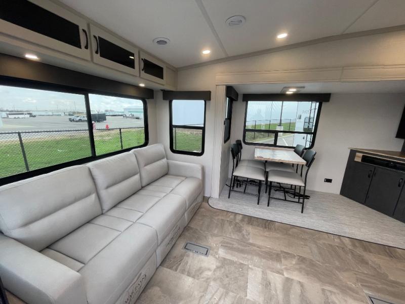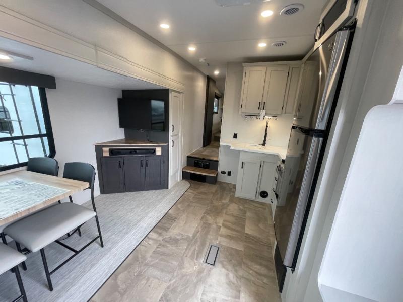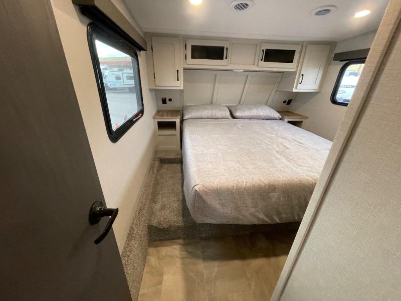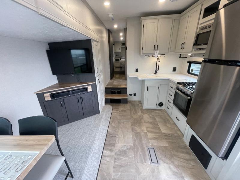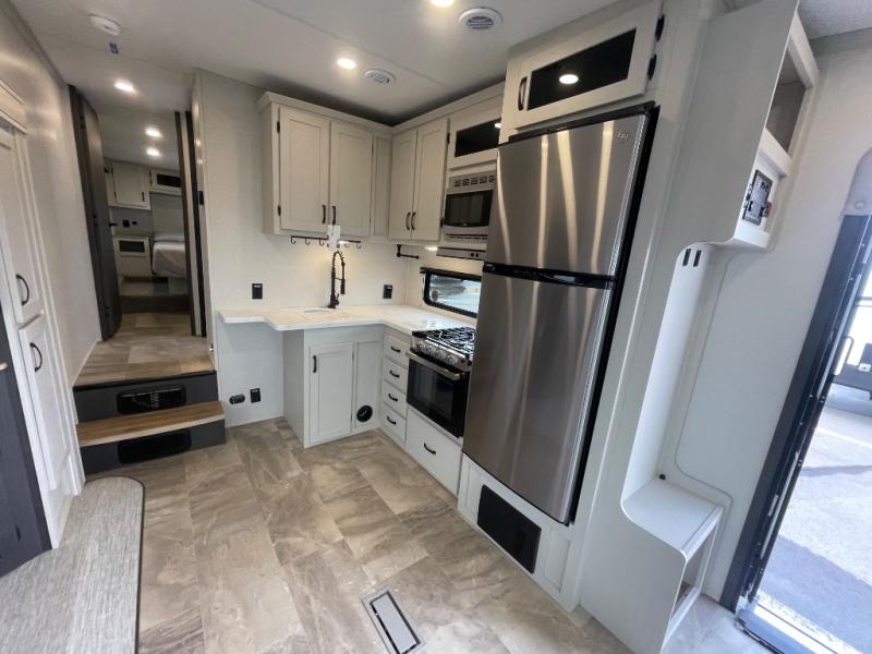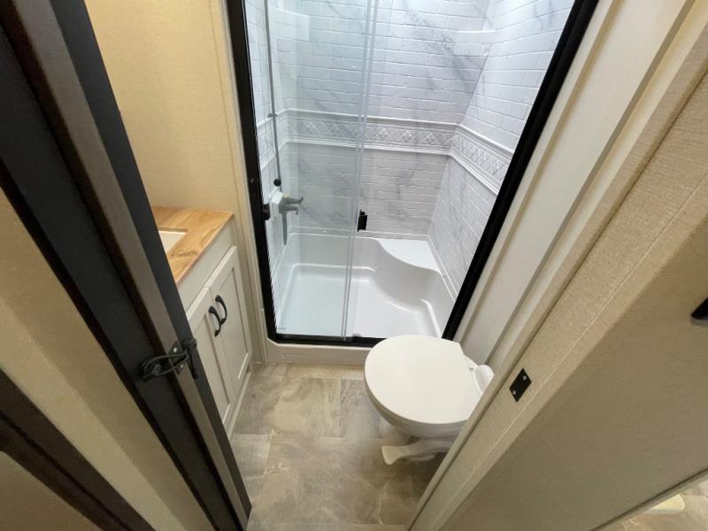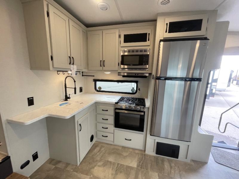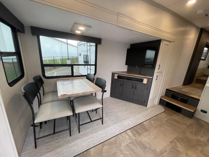 Stand out from all the others with one of these Shasta RVs Phoenix Lite fifth wheels! They are constructed with Weather Shield+ technology, dual-sided Azdel composite sidewall panels, and Tri-Tex powder coated frame technology that is ultra weather resistant. There are also electric front jacks and electric rear stabilizer jacks, an electric awning with LED light strip and one hand pitch adjustment, and a roof mounted solar panel within the Solar Source+ Package. The interior includes USB charging ports, slow rise blackout roller night shades, and a large transom window in the kitchen. You will also enjoy the upgraded GE 13,500 BTU dual ducted main A/C to keep you comfortable throughout your fifth wheel, plus an upgraded 60K BTU on-demand water heater for endless hot showers!