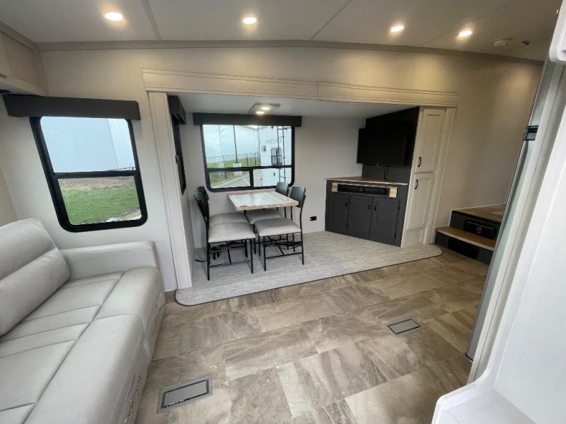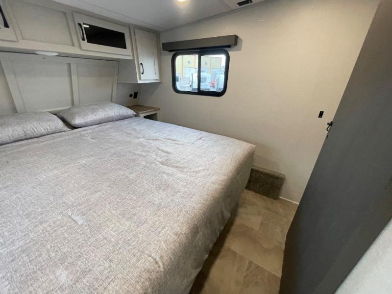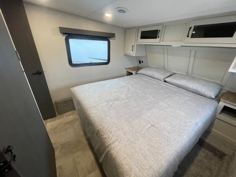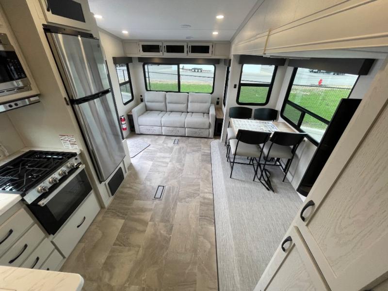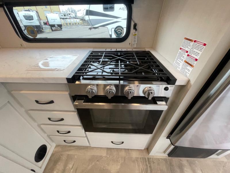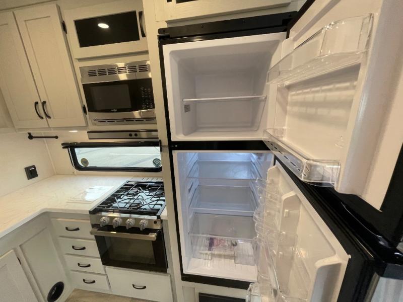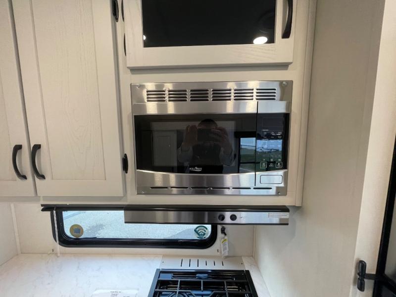 You and your spouse will have a comfortable time camping in this travel trailer! Prepare a delicious meal with the 21" stainless steel oven with a residential cooktop, upgraded stainless steel RV microwave, and 10 cu. ft. GE stainless 12V refrigerator, and enjoy it at the table with chairs. Let your stomach settle as you relax on the rear 78" tri-fold hide-a-bed sofa with tables on either side which can also double as a sleeping space for a guest or two. The full bathroom has a shower with a seat to rinse the sand out of your hair after a fun day at the beach. The front private bedroom has a queen bed to lay your head on at night with nightstands on either side for your electronics and a wardrobe to keep your clothes looking their best!