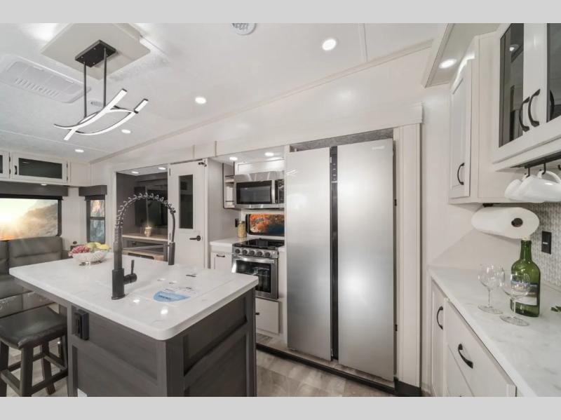 Sit back and relax on the theater seats, the rear tri-fold hide-a-bed sofa or on one of the four chairs at the free standing table. You can enjoy the outdoors through all the windows as you plan your outside activities. The cook may like to whip up a meal using the full kitchen amenities including two pantries, and extra counter space along one wall plus the island which includes two barstools. At night you can get cleaned up in the full bathroom with a shower that includes a seat and sliding glass doors, plus a large linen cabinet. The front bedroom offers privacy when you have overnight guests sleep on the sofa, and extra floor space to move about thanks to the slide. And the front wall wardrobe allows you to keep your clothes wrinkle-free, plus there is washer and dryer prep if you want to add those appliances.