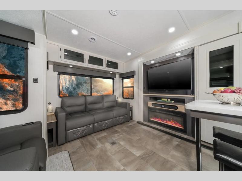With any Phoenix mid-profile fifth wheel by Shasta RVs, the stand out construction features include residential 5" truss rafters, full walk-on roof decking, vacuum bonded and aluminum framed sidewalls with rot proof AZDEL composite sidewall panels. The Weather Shield+ offers cold and hot testing, 12V thermal tank heaters on all tanks, a sectionalized underbelly and heated gate valves and more so you can camp during any season you wish. The Road Armor Suspension by Trail Air will make towing easier than ever, and the upgraded marine-style convenience center includes a black tank flush plus a hot/cold shower to wash off hiking gear. Head inside to find solid surface countertops and sink covers, an upgraded 50" 4K Smart LED TV in the living room, USB/USB-C charging ports, and an upgraded 60K BTU on-demand water heater to name a few comforts!