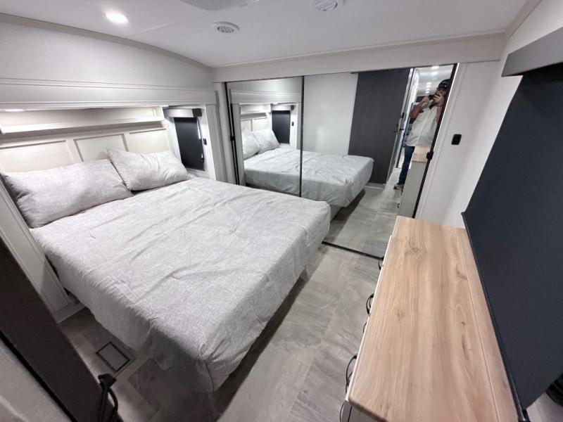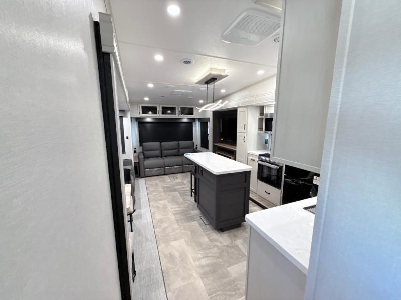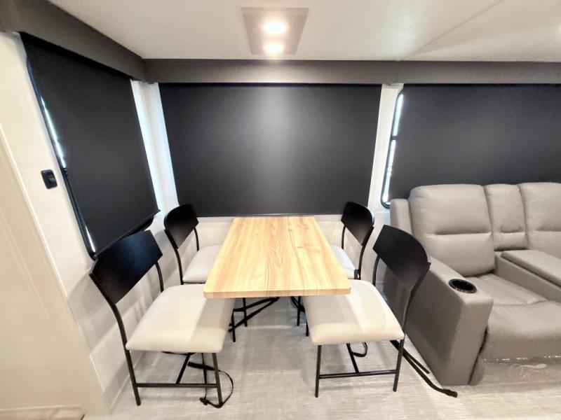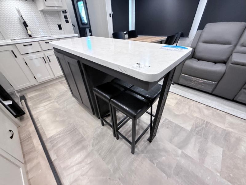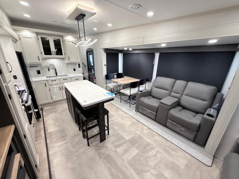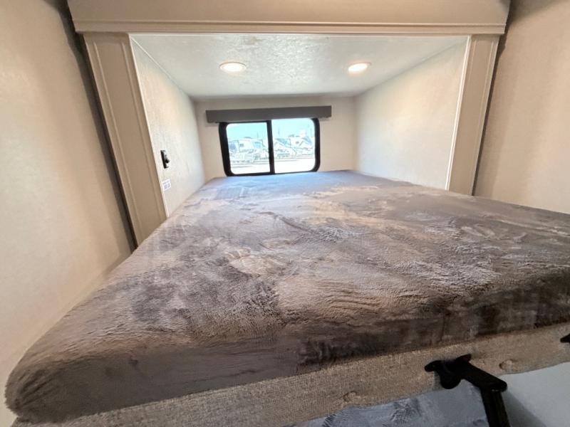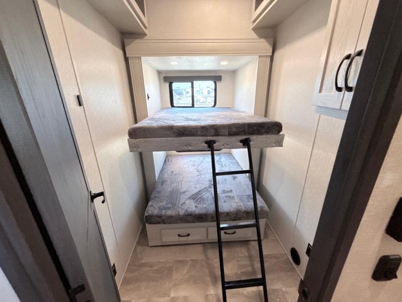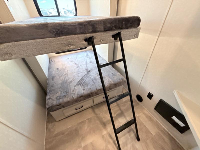 This middle bunkhouse fifth wheel allows you to offer your family or friends privacy when they stay the night with you. The double-size bunks are within a slide providing more floor space in the bunkhouse and there is overhead storage. The full bathroom is located in between the bunkhouse and the front bedroom for convenience, and the bedroom offers a queen bed slide, a large front wall wardrobe with washer/dryer prep, plus a dresser, and a space savings sliding door for privacy. The combined kitchen and living area is also spacious with dual opposing slides, and the furniture is comfortable from the rear tri-fold sofa hide-a-bed sofa, the theater seats and the four chairs with the table. And the cook will love all the kitchen amenities including the island with two bar stools.