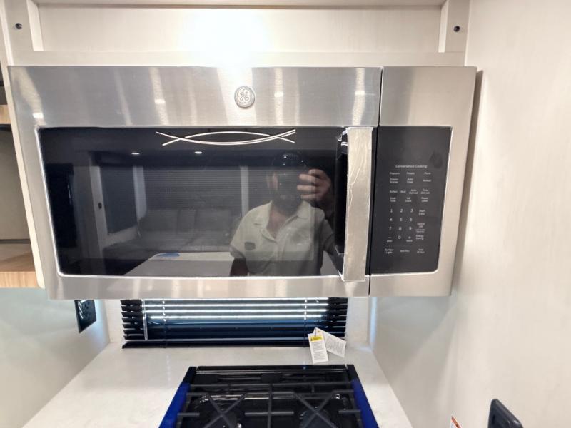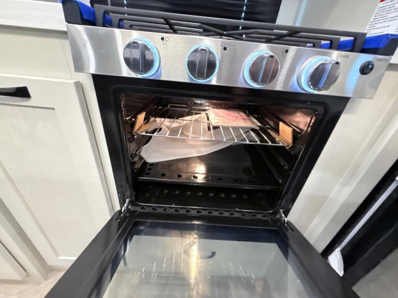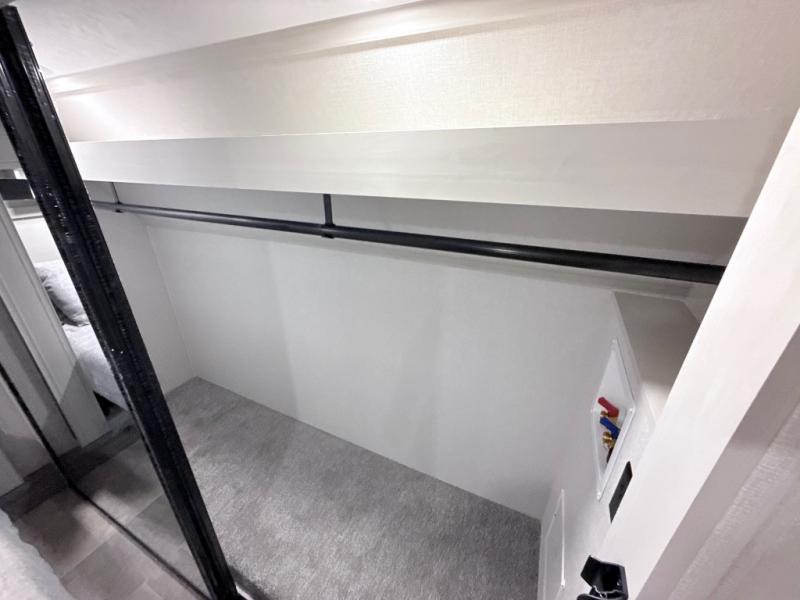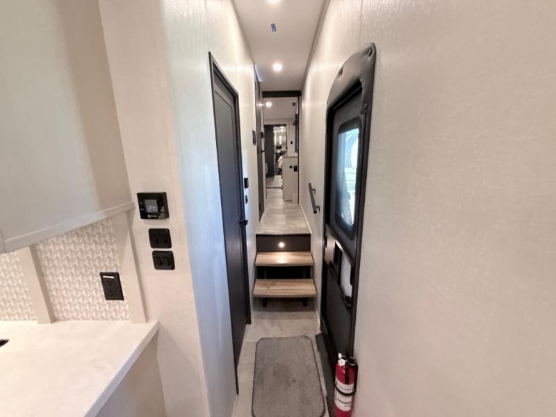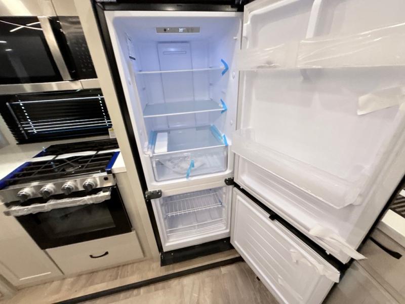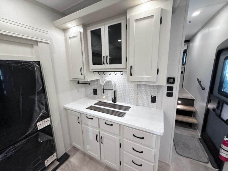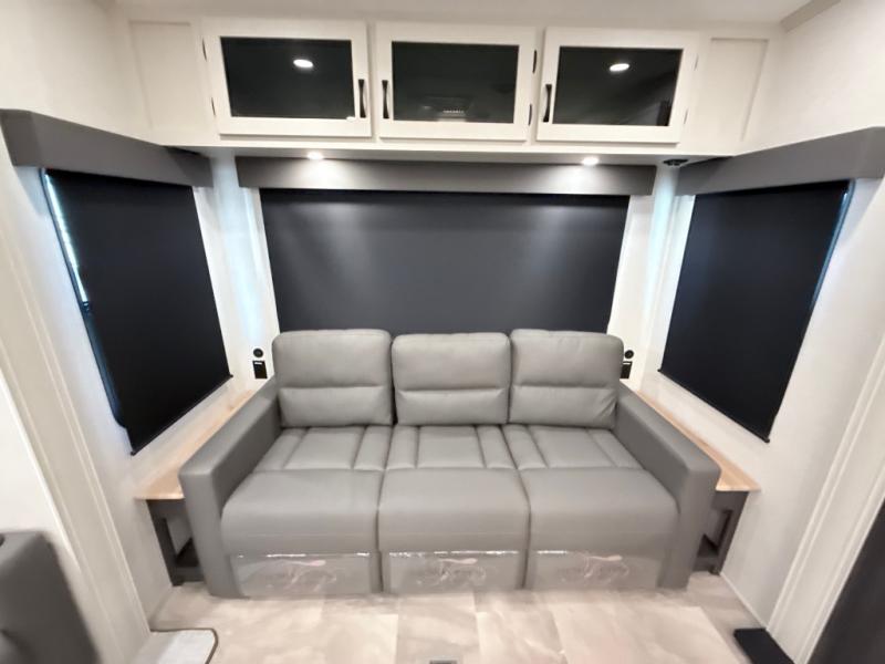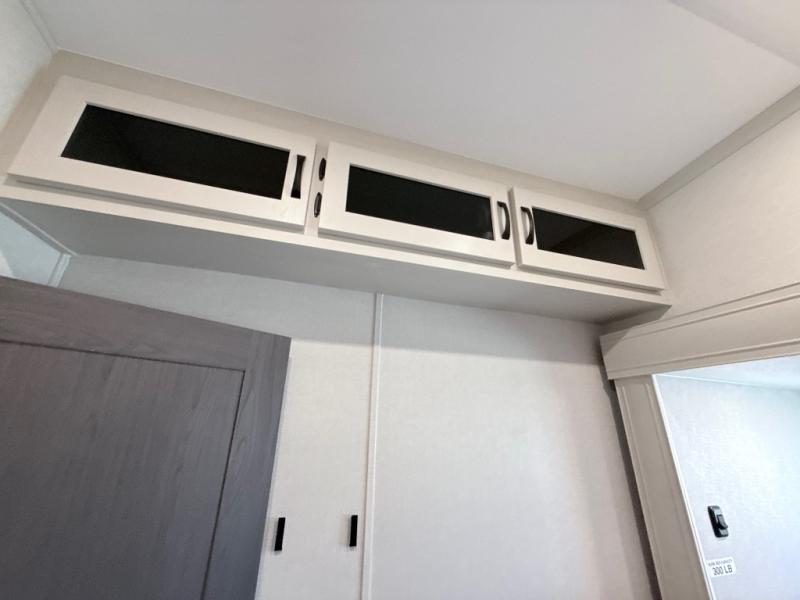 This middle bunkhouse fifth wheel allows you to offer your family or friends privacy when they stay the night with you. The double-size bunks are within a slide providing more floor space in the bunkhouse and there is overhead storage. The full bathroom is located in between the bunkhouse and the front bedroom for convenience, and the bedroom offers a queen bed slide, a large front wall wardrobe with washer/dryer prep, plus a dresser, and a space savings sliding door for privacy. The combined kitchen and living area is also spacious with dual opposing slides, and the furniture is comfortable from the rear tri-fold sofa hide-a-bed sofa, the theater seats and the four chairs with the table. And the cook will love all the kitchen amenities including the island with two bar stools.