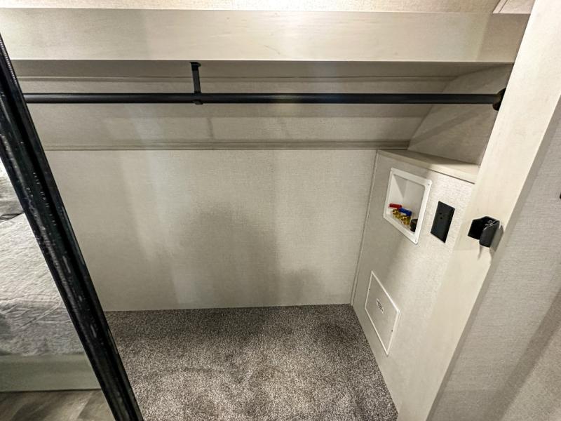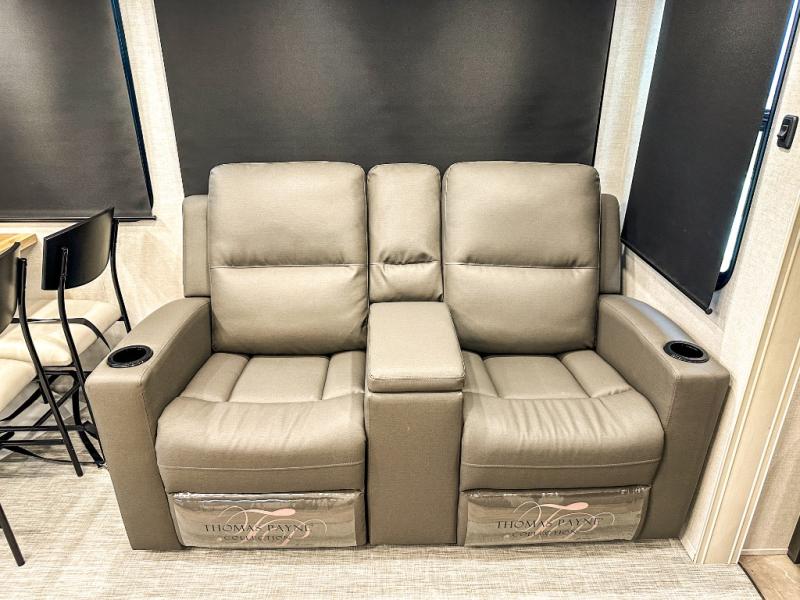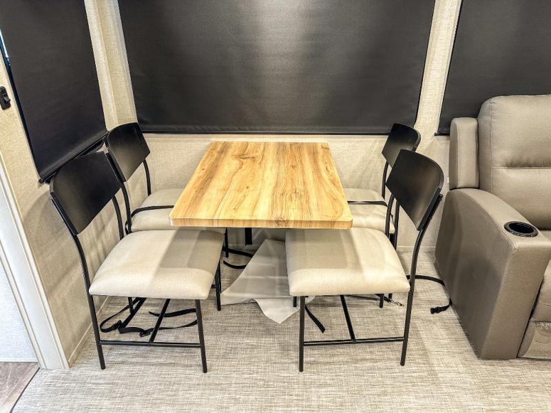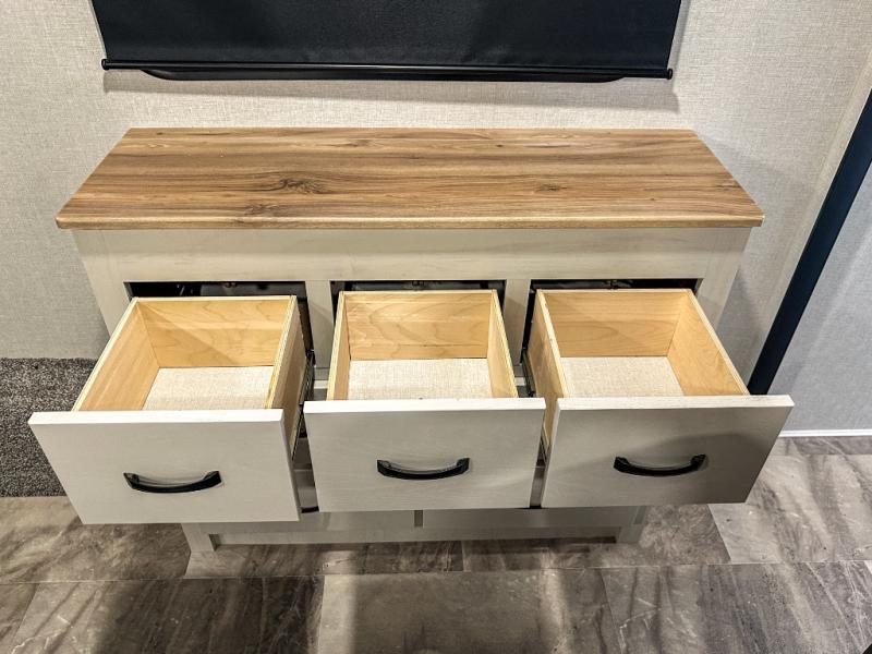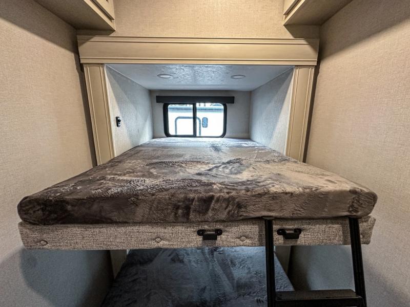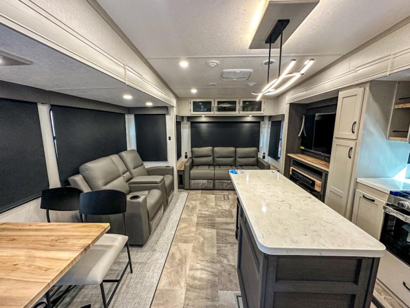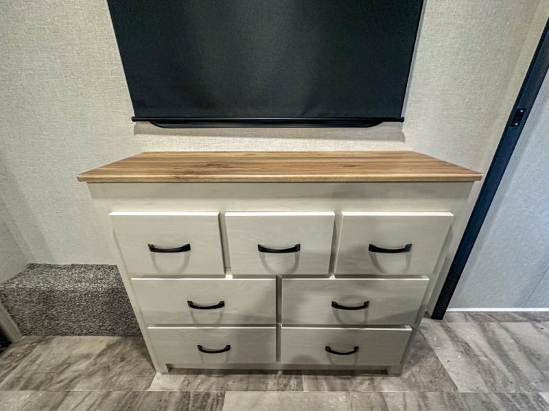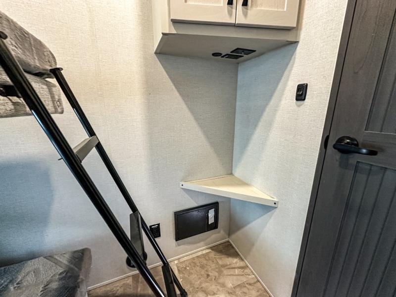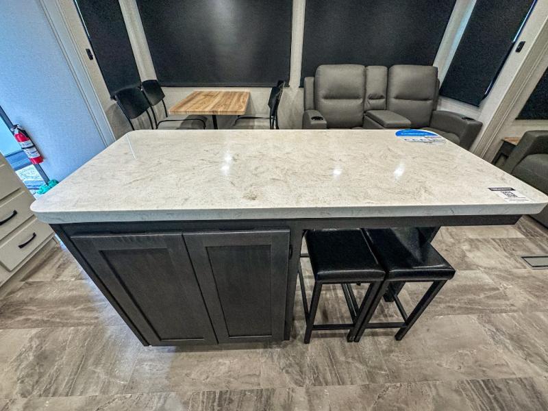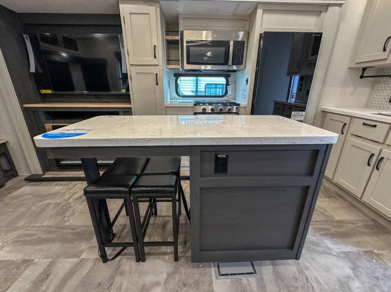 This middle bunkhouse fifth wheel allows you to offer your family or friends privacy when they stay the night with you. The double-size bunks are within a slide providing more floor space in the bunkhouse and there is overhead storage. The full bathroom is located in between the bunkhouse and the front bedroom for convenience, and the bedroom offers a queen bed slide, a large front wall wardrobe with washer/dryer prep, plus a dresser, and a space savings sliding door for privacy. The combined kitchen and living area is also spacious with dual opposing slides, and the furniture is comfortable from the rear tri-fold sofa hide-a-bed sofa, the theater seats and the four chairs with the table. And the cook will love all the kitchen amenities including the island with two bar stools.