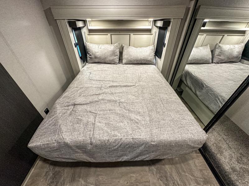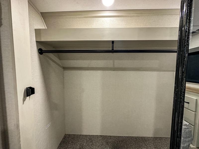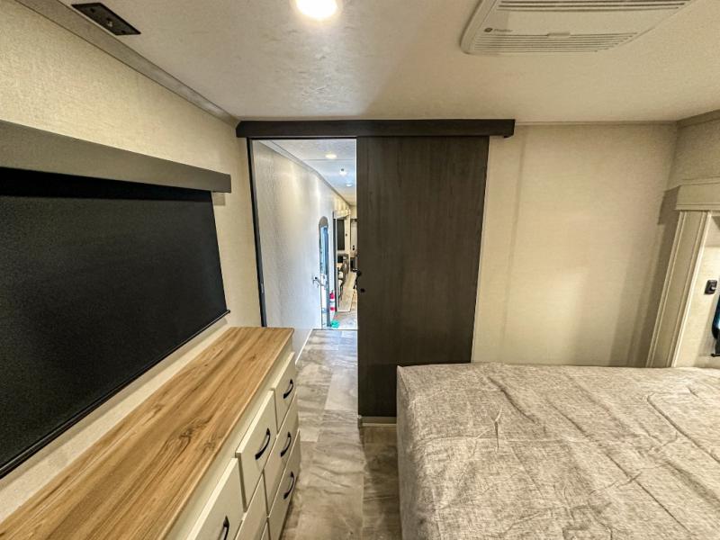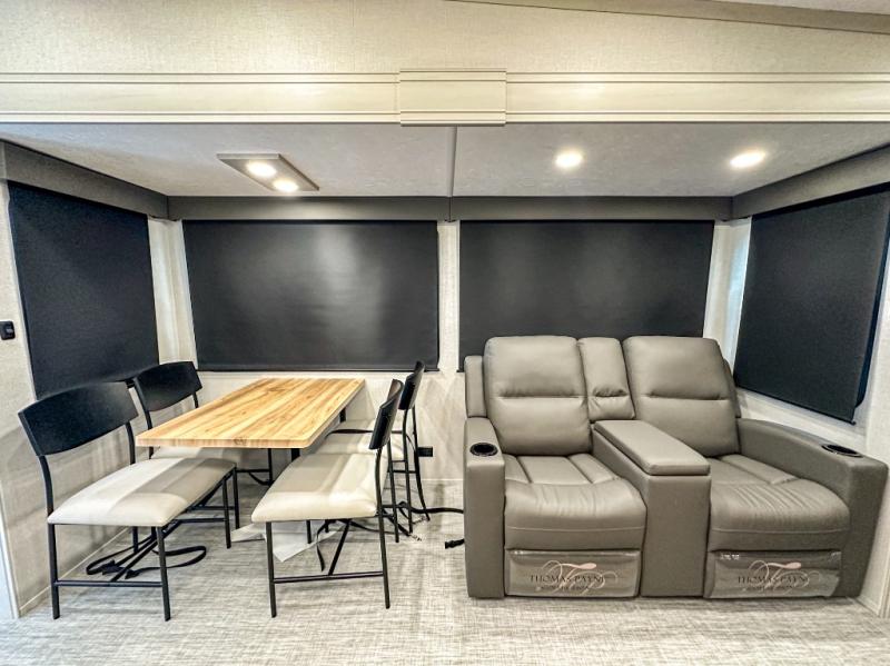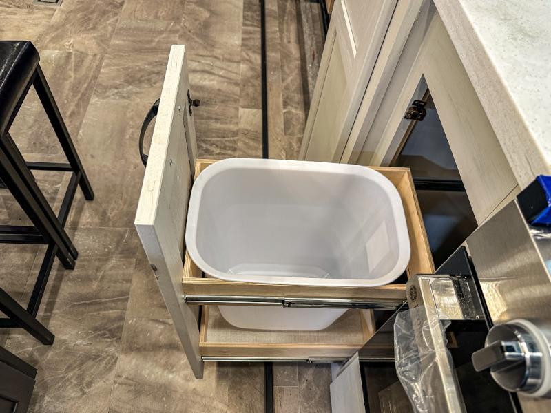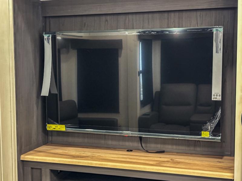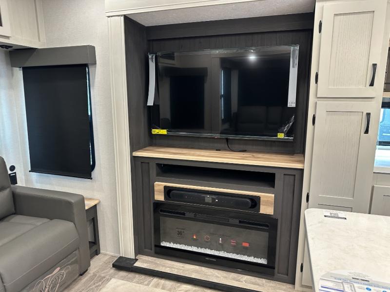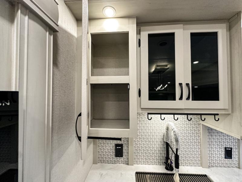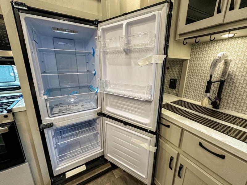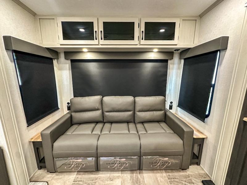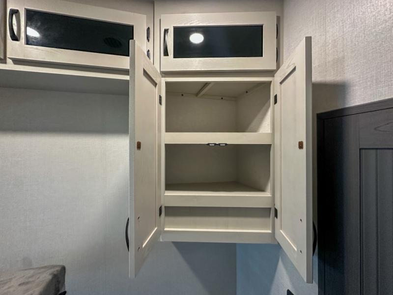 This middle bunkhouse fifth wheel allows you to offer your family or friends privacy when they stay the night with you. The double-size bunks are within a slide providing more floor space in the bunkhouse and there is overhead storage. The full bathroom is located in between the bunkhouse and the front bedroom for convenience, and the bedroom offers a queen bed slide, a large front wall wardrobe with washer/dryer prep, plus a dresser, and a space savings sliding door for privacy. The combined kitchen and living area is also spacious with dual opposing slides, and the furniture is comfortable from the rear tri-fold sofa hide-a-bed sofa, the theater seats and the four chairs with the table. And the cook will love all the kitchen amenities including the island with two bar stools.