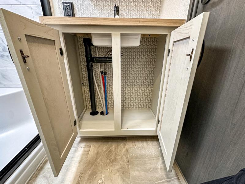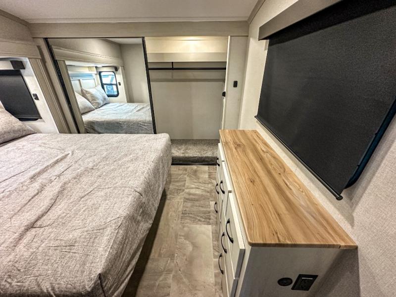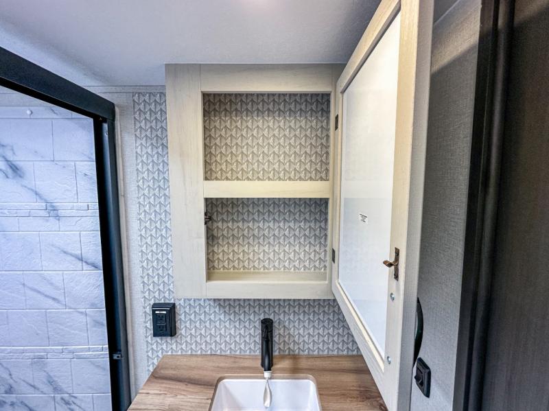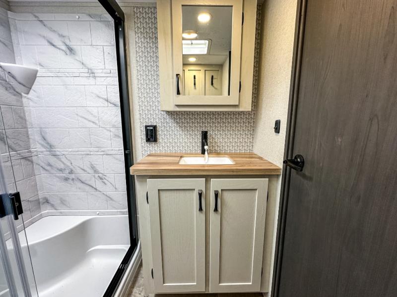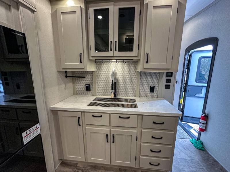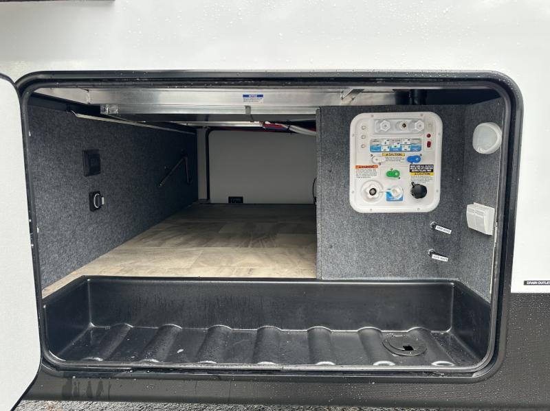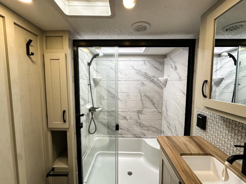 With any Phoenix mid-profile fifth wheel by Shasta RVs, the standout construction features include residential 5" truss rafters, full walk-on roof decking, AZDEL composite sidewall panels. The Weather Shield+ offers cold and hot testing, a sectionalized underbelly and heated gate valves and more so you can camp during more harsh weather if you wish. The Road Armor Suspension by Trail Air will make towing easier than ever, and the upgraded marine-style convenience center includes a black tank flush plus a hot/cold shower to wash off hiking gear. Head inside to find solid surface countertops and sink covers, an upgraded 50" 4K Smart LED TV in the living room, USB/USB-C charging ports in the bedroom, and an upgraded 60K BTU on-demand water heater to name a few comforts!
