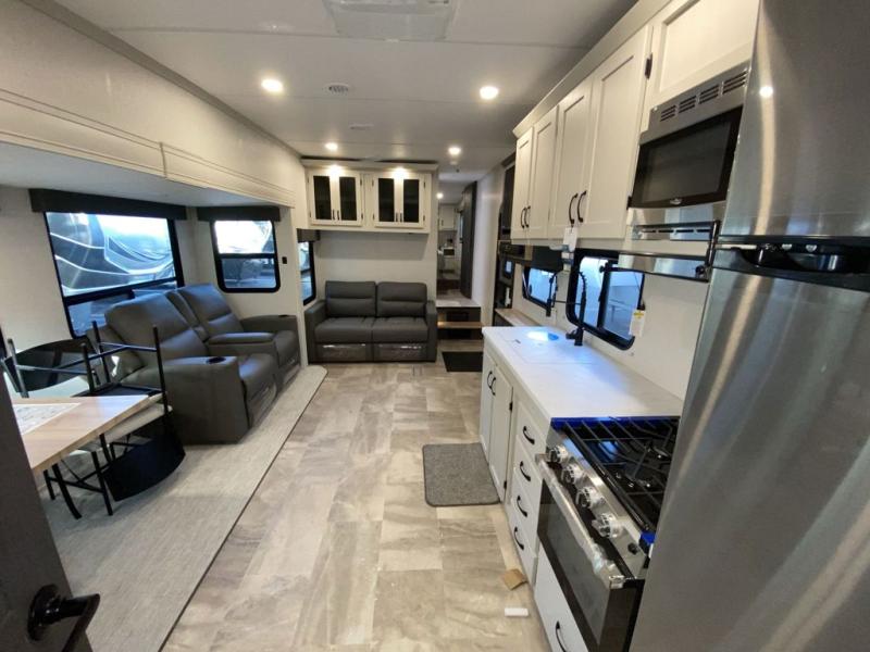 This travel trailer has enough room for the whole family! The kiddos will love having their own private bunkhouse with two 30" x 74" bunks and a full rear bathroom with a wardrobe to store the towels. There is also a front private bedroom with a queen bed that has nightstands on either side for your electronics and a wardrobe to keep your clothes looking nice. Just outside the bedroom is the second full bathroom with a 40" x 30" shower with a seat. You could even transform the tri-fold hide-a-bed sofa into an extra sleeping space. The chef can whip up a delicious home cooked meal with the 21" stainless steel oven with a residential cooktop and store any leftovers in the 10 cu. ft. GE stainless 12V refrigerator after enjoying it at the table with chairs. Plus, there is theater seating and an outside kitchen to cook in the great outdoors!