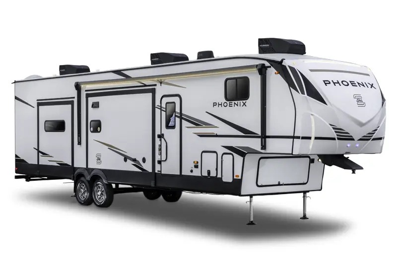 With any Phoenix mid-profile fifth wheel by Shasta RVs, the stand out construction features include residential 5" truss rafters, full walk-on roof decking, vacuum bonded and aluminum framed sidewalls with rot proof AZDEL composite sidewall panels. The Weather Shield+ offers cold and hot testing, 12V thermal tank heaters on all tanks, a sectionalized underbelly and heated gate valves and more so you can camp during any season you wish. The Road Armor Suspension by Trail Air will make towing easier than ever, and the upgraded marine-style convenience center includes a black tank flush plus a hot/cold shower to wash off hiking gear. Head inside to find solid surface countertops and sink covers, an upgraded 50" 4K Smart LED TV in the living room, USB/USB-C charging ports, and an upgraded 60K BTU on-demand water heater to name a few comforts!