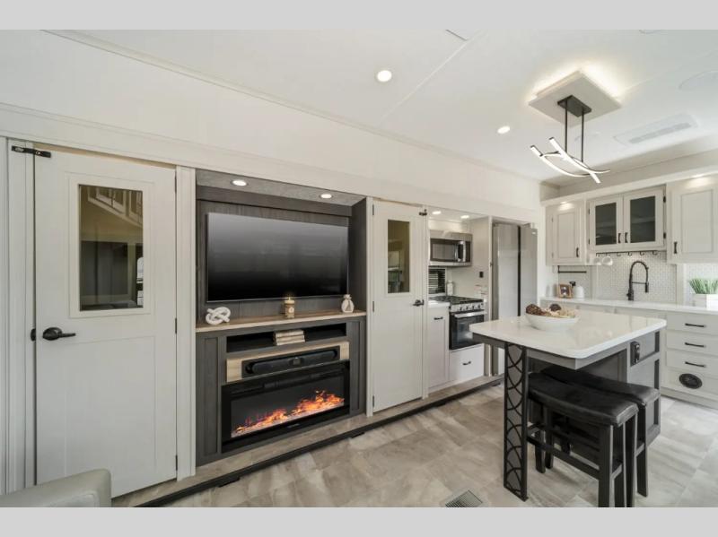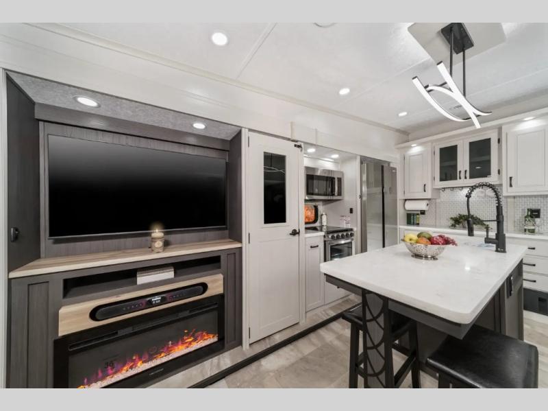 This fifth wheel is decked out in features you will love! Starting with the front private bunkhouse which has a 30" x 74" bunk bed, a 30" x 62" bunk above a cube sofa, washer and dryer prep, and even it's very own full bathroom. The living area has theater seating across from an entertainment center and a tri-fold hide-a-bed sofa for extra sleeping space, plus it is right next to the fully equipped kitchen with an island so you can socialize with the chef while they prepare a delicious home cooked meal. Get a good night's rest in the master suite with the king bed slide, a dresser, wardrobe, and full rear bathroom which has a shower with a seat and a dual sink vanity for two to get ready at once. Plus, above the master suite is a loft for extra sleeping or storage space!