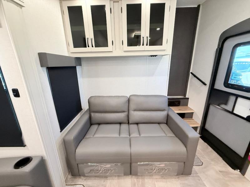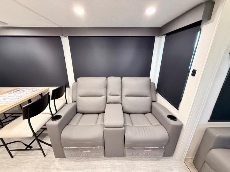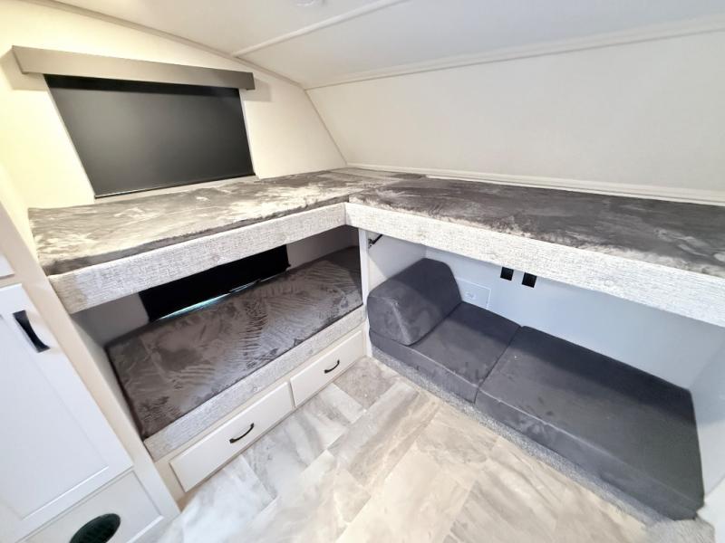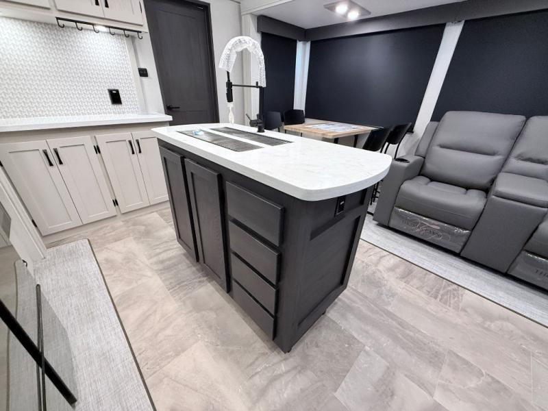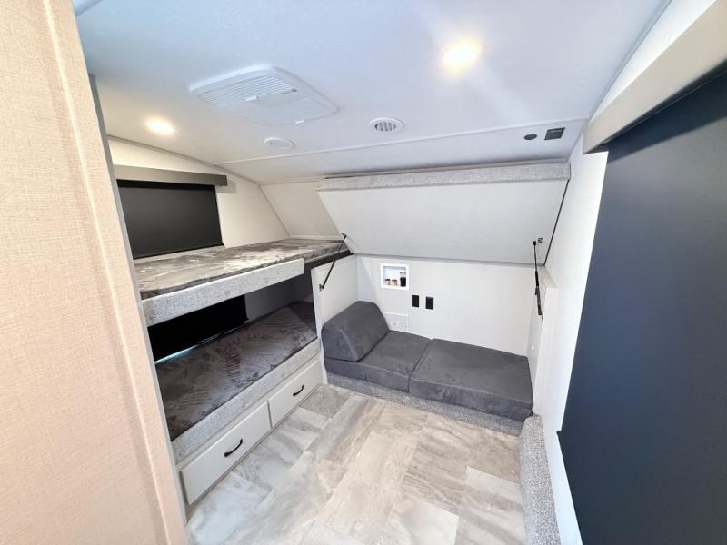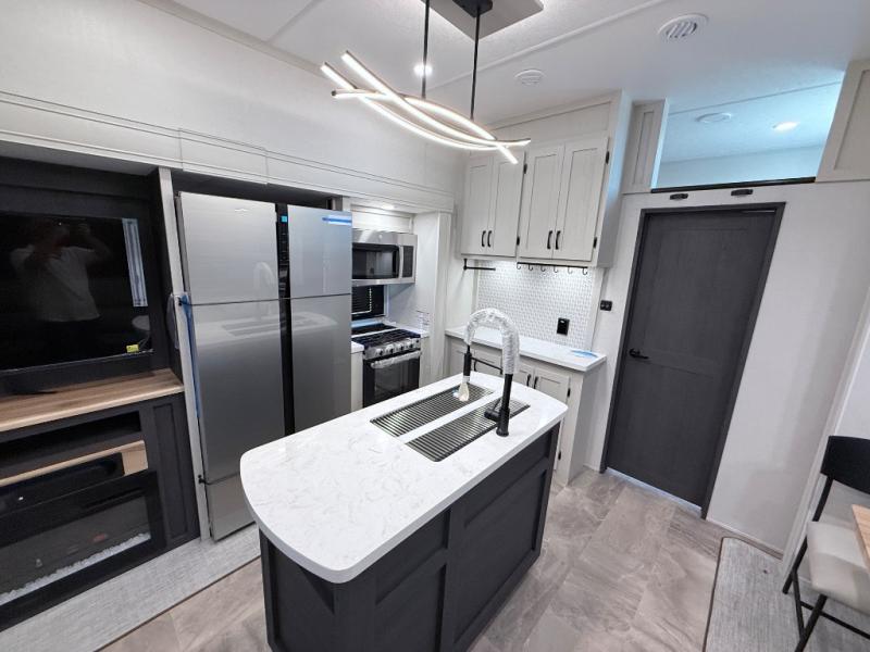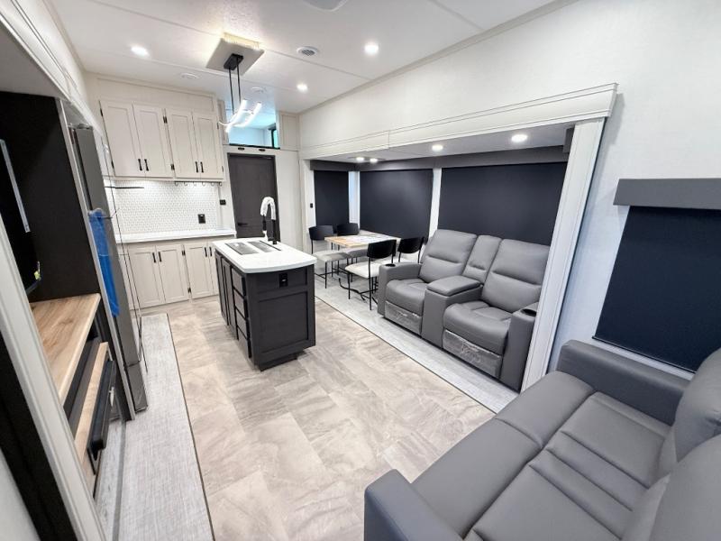 This fifth wheel is decked out in features you will love! Starting with the front private bunkhouse which has a 30" x 74" bunk bed, a 30" x 62" bunk above a cube sofa, washer and dryer prep, and even it's very own full bathroom. The living area has theater seating across from an entertainment center and a tri-fold hide-a-bed sofa for extra sleeping space, plus it is right next to the fully equipped kitchen with an island so you can socialize with the chef while they prepare a delicious home cooked meal. Get a good night's rest in the master suite with the king bed slide, a dresser, wardrobe, and full rear bathroom which has a shower with a seat and a dual sink vanity for two to get ready at once. Plus, above the master suite is a loft for extra sleeping or storage space!