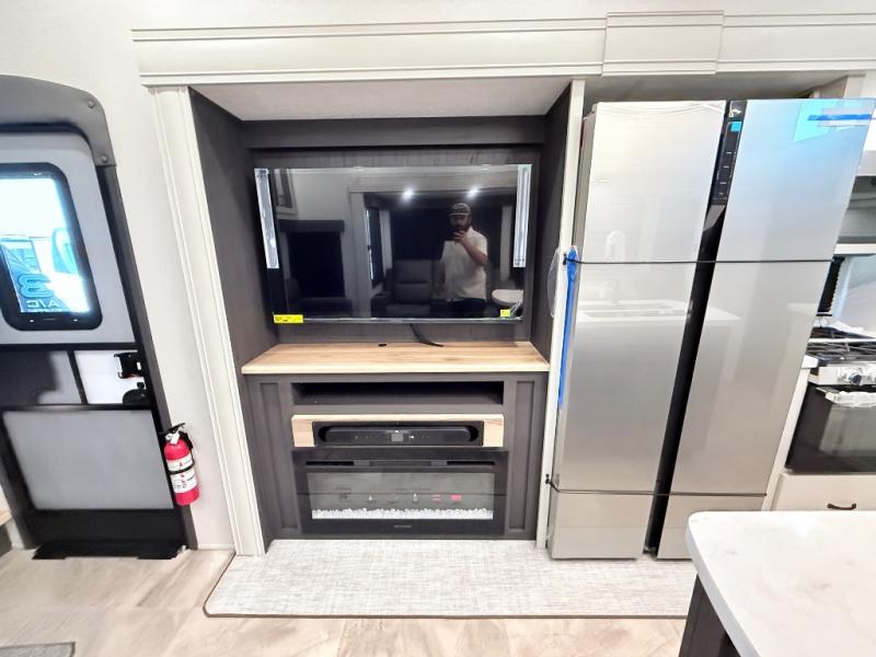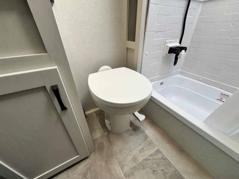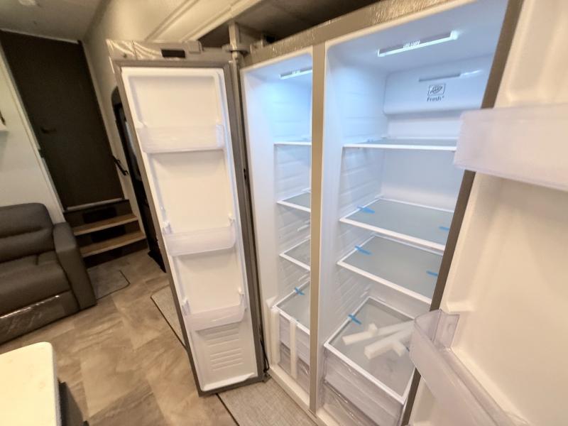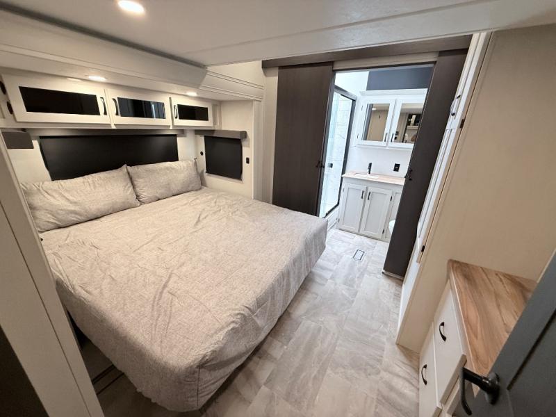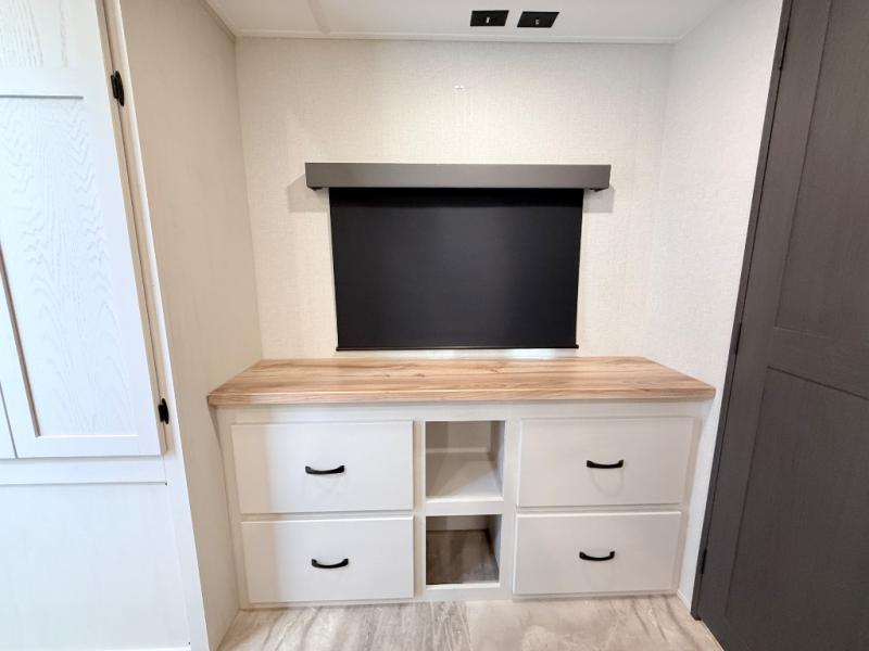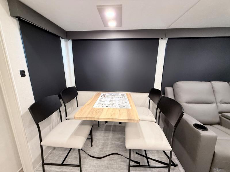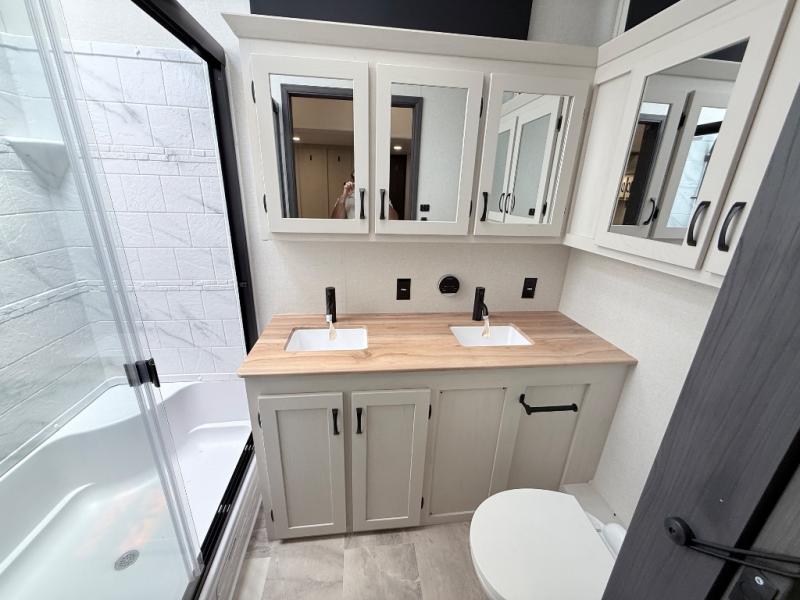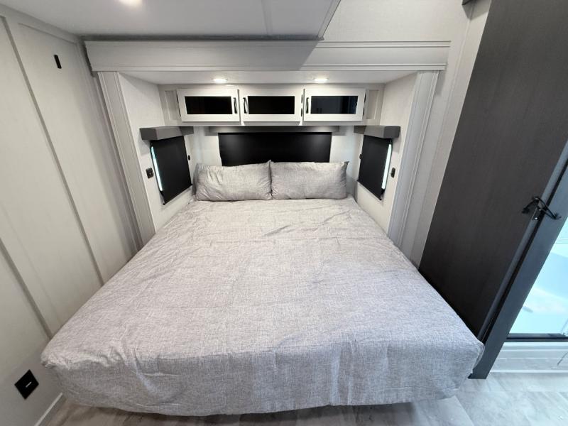 This fifth wheel is decked out in features you will love! Starting with the front private bunkhouse which has a 30" x 74" bunk bed, a 30" x 62" bunk above a cube sofa, washer and dryer prep, and even it's very own full bathroom. The living area has theater seating across from an entertainment center and a tri-fold hide-a-bed sofa for extra sleeping space, plus it is right next to the fully equipped kitchen with an island so you can socialize with the chef while they prepare a delicious home cooked meal. Get a good night's rest in the master suite with the king bed slide, a dresser, wardrobe, and full rear bathroom which has a shower with a seat and a dual sink vanity for two to get ready at once. Plus, above the master suite is a loft for extra sleeping or storage space!