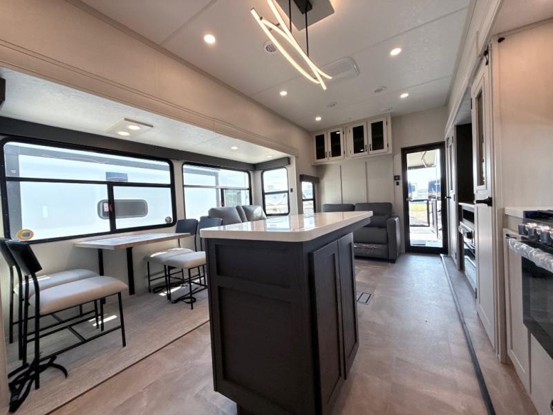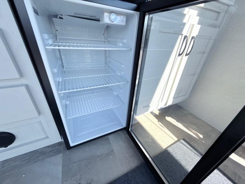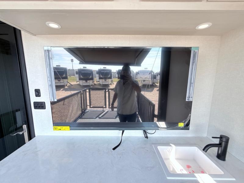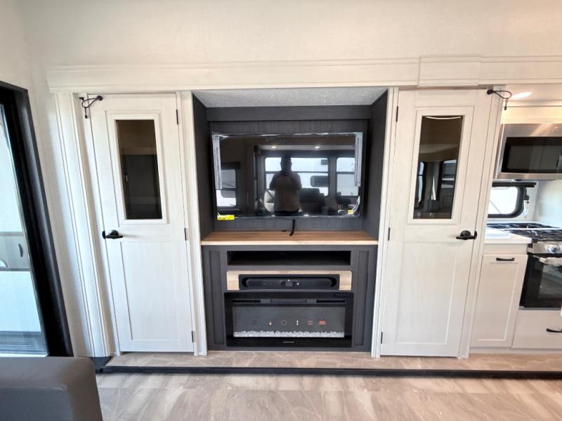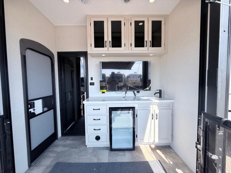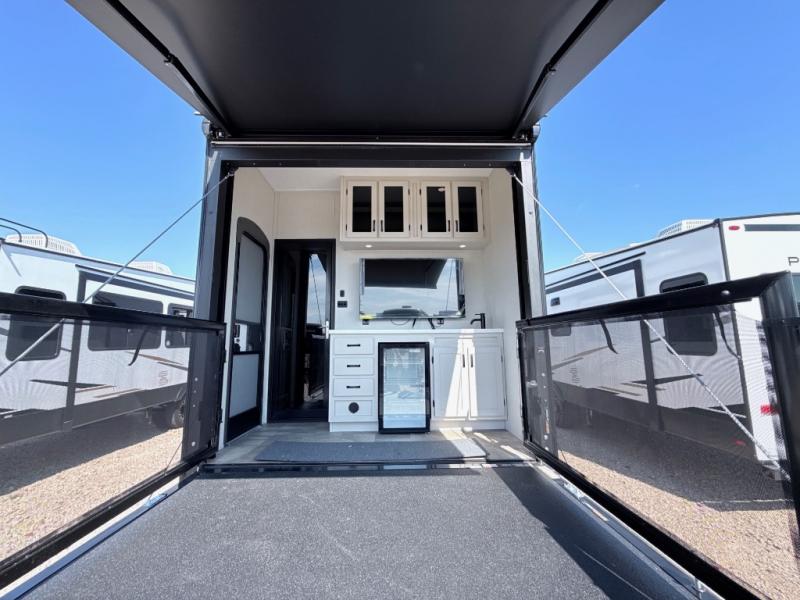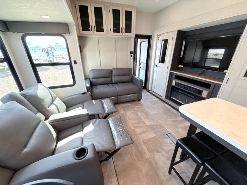 This fifth wheel will feel just like home with its rear fold down patio with a mini refrigerator, sink, and counter space so you can visit with campground neighbors. The combined kitchen and living area is made open thanks to the dual opposing slides, and here you'll enjoy theater seating across from the TV and fireplace, a free-standing table, and a kitchen island with two stools. There is also a 65" tri-fold sofa where guests can sleep! A spacious full bath includes a shower with a seat and dual bath sinks so you both can get ready for bed at the same time. And you will love having your own bedroom up front, complete with a king bed slide out, a dresser, plus a front wardrobe with washer and dryer prep!