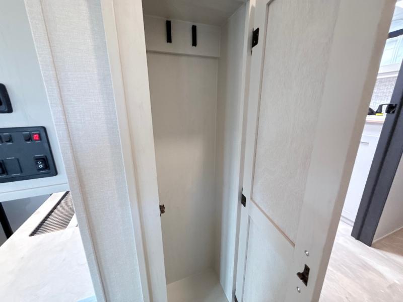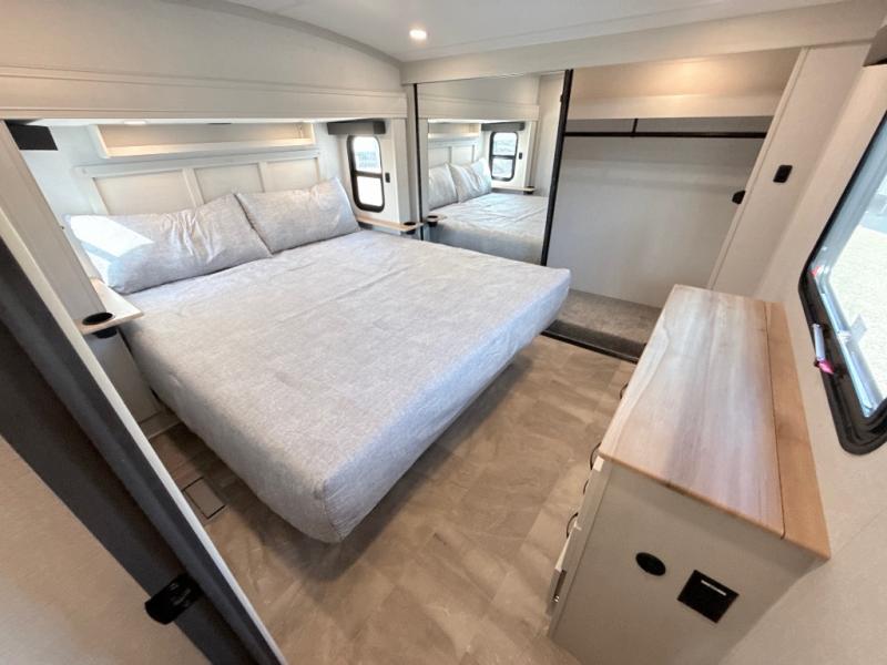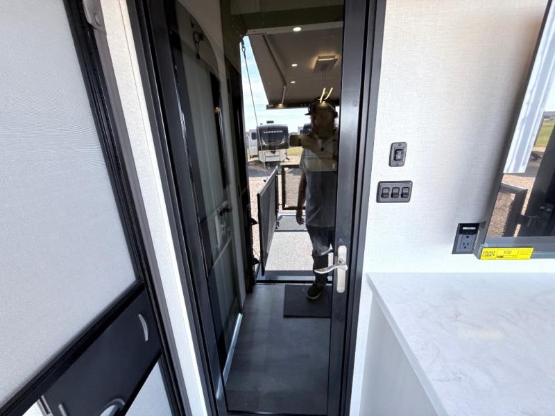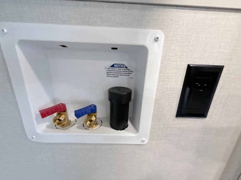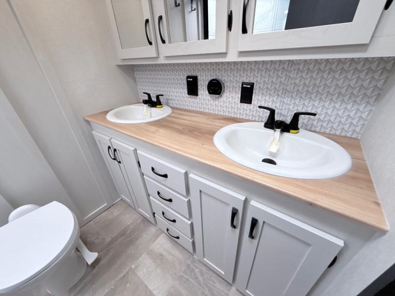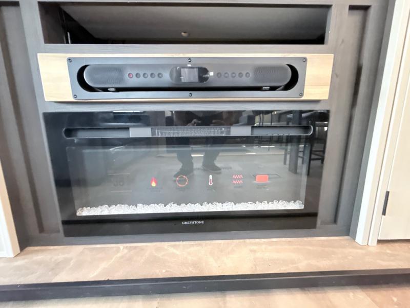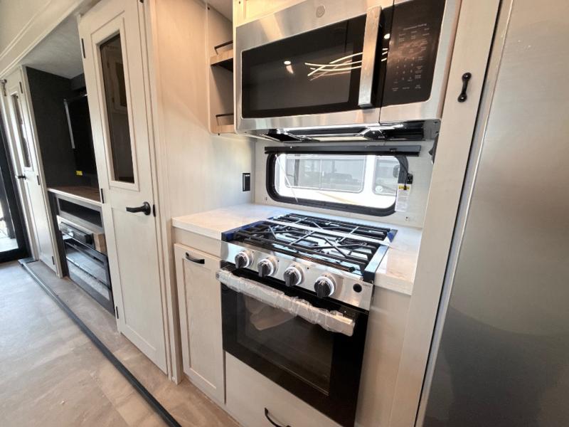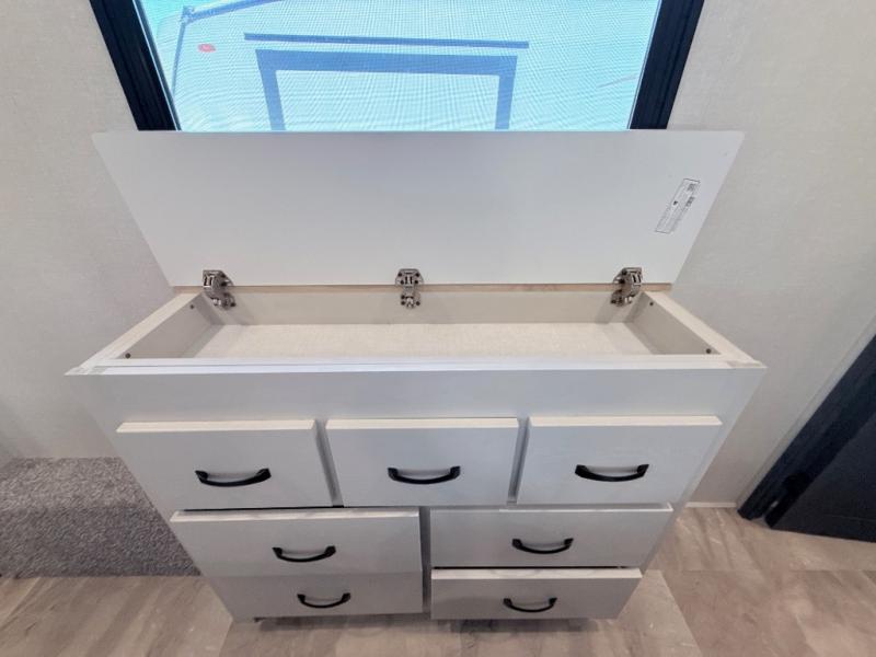 This fifth wheel will feel just like home with its rear fold down patio with a mini refrigerator, sink, and counter space so you can visit with campground neighbors. The combined kitchen and living area is made open thanks to the dual opposing slides, and here you'll enjoy theater seating across from the TV and fireplace, a free-standing table, and a kitchen island with two stools. There is also a 65" tri-fold sofa where guests can sleep! A spacious full bath includes a shower with a seat and dual bath sinks so you both can get ready for bed at the same time. And you will love having your own bedroom up front, complete with a king bed slide out, a dresser, plus a front wardrobe with washer and dryer prep!