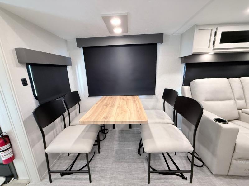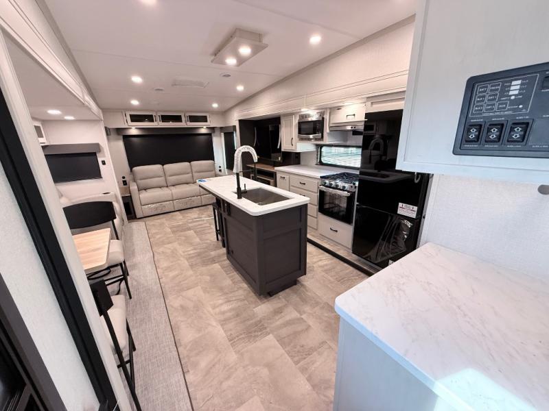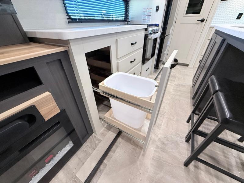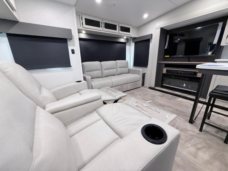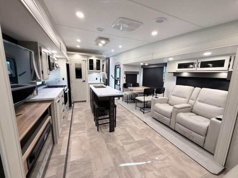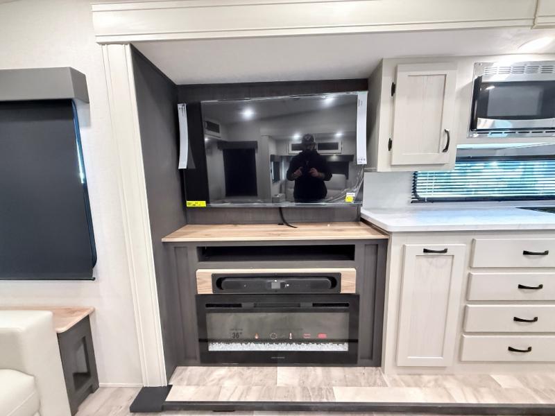 Start camping in true luxury with this fifth wheel! The chef will appreciate having a kitchen island with two barstools to sit at while they prepare dinner. Eat your meals and play card games at the table and chairs, then relax in the rear living area on either the 78" tri-fold hide-a-bed sofa or theater seating across from the fireplace and TV. The dual entry bathroom has a radius shower to freshen up in and leads directly into the front private bedroom with a queen bed and wardrobe/linen closet slide to keep your items looking their best!