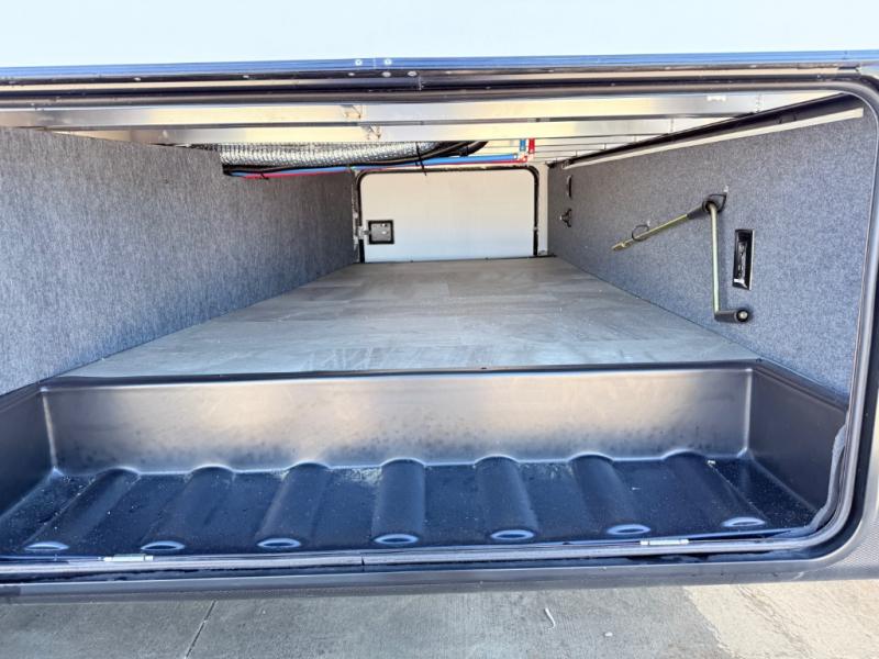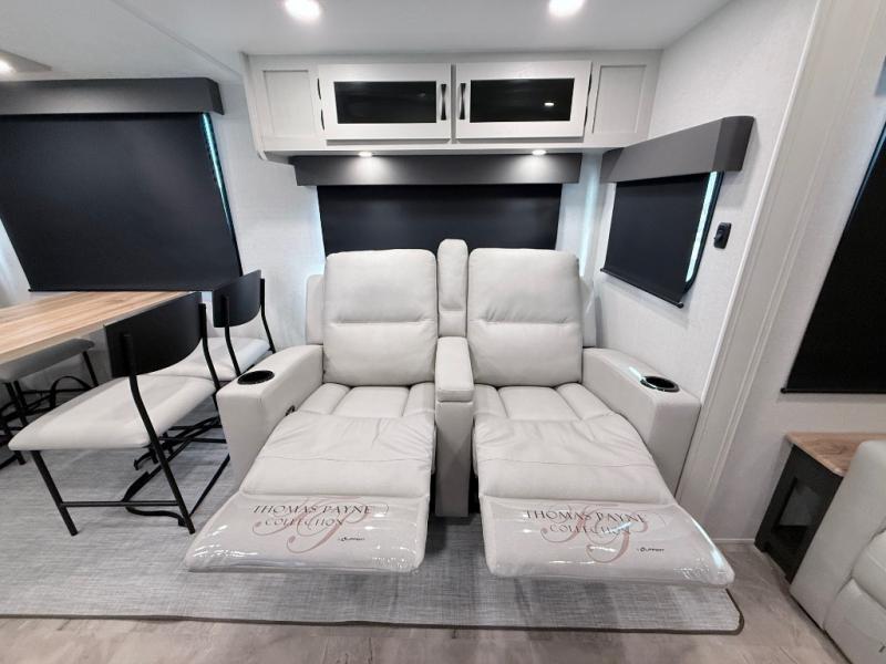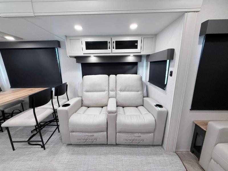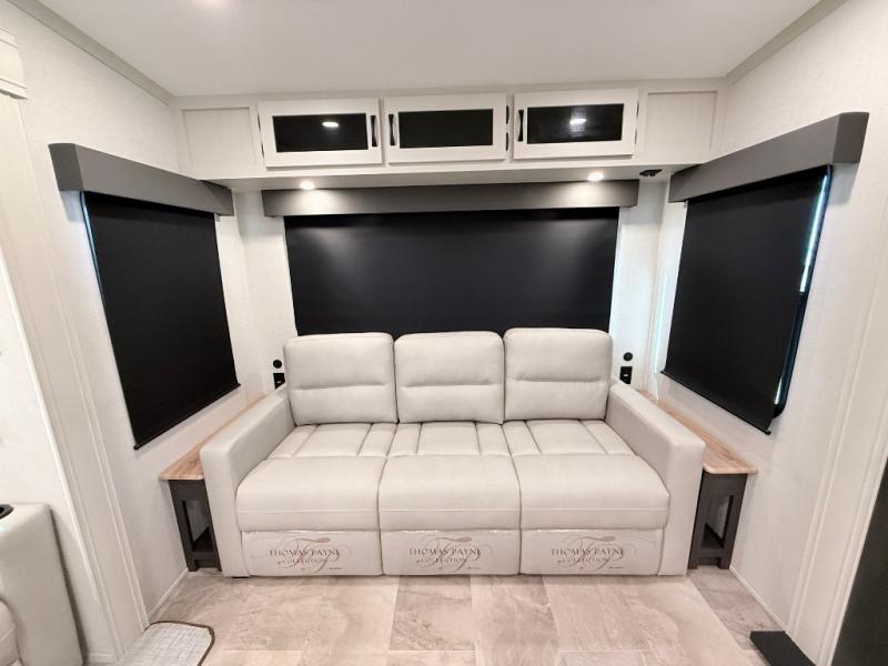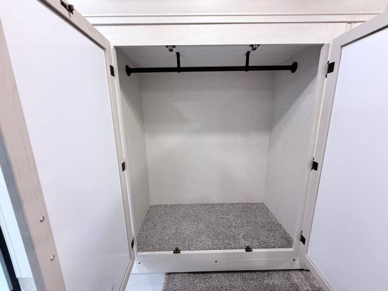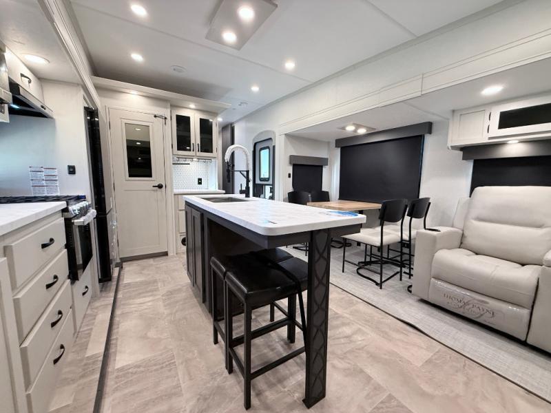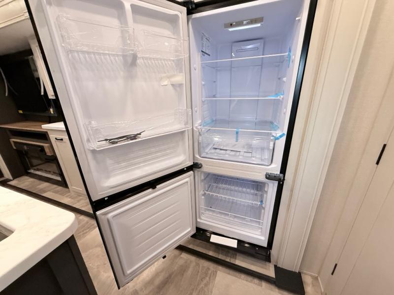 Start camping in true luxury with this fifth wheel! The chef will appreciate having a kitchen island with two barstools to sit at while they prepare dinner. Eat your meals and play card games at the table and chairs, then relax in the rear living area on either the 78" tri-fold hide-a-bed sofa or theater seating across from the fireplace and TV. The dual entry bathroom has a radius shower to freshen up in and leads directly into the front private bedroom with a queen bed and wardrobe/linen closet slide to keep your items looking their best!