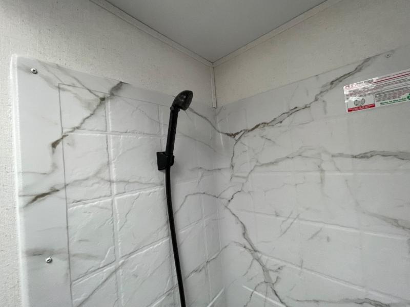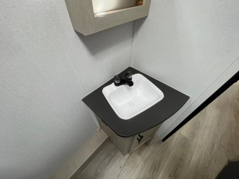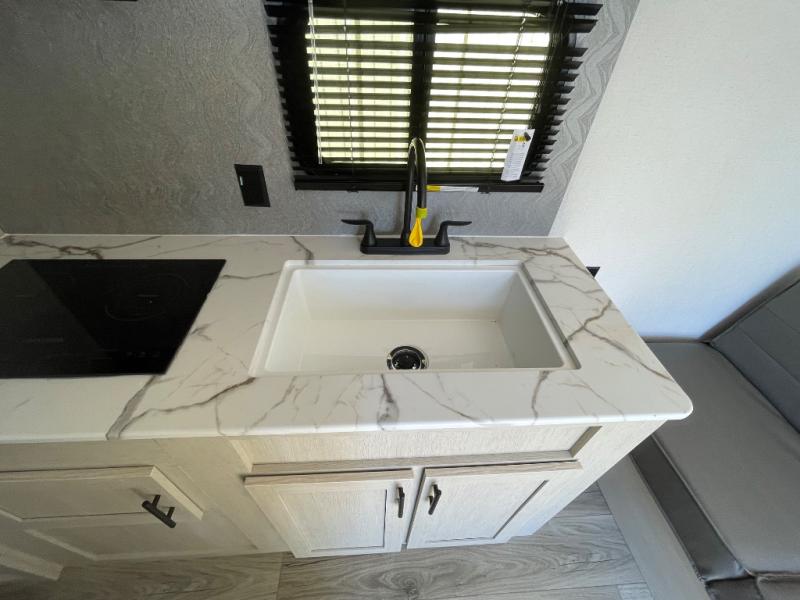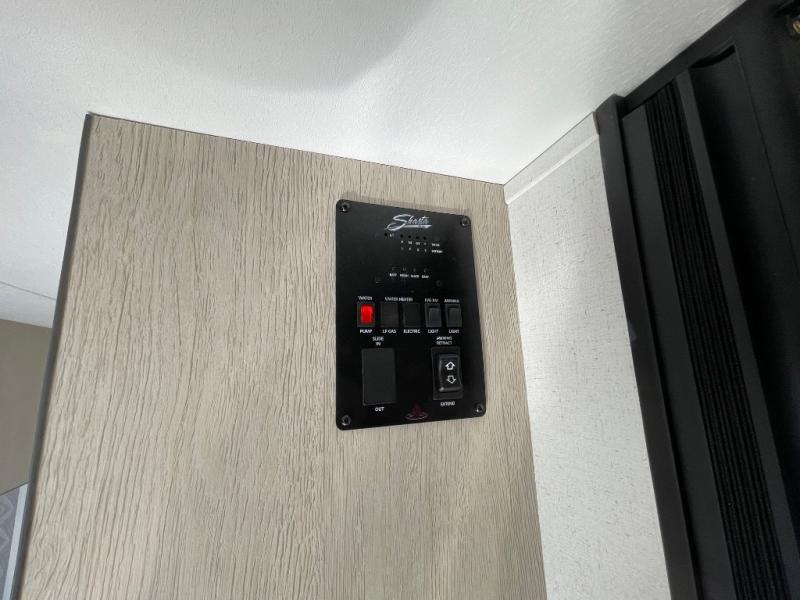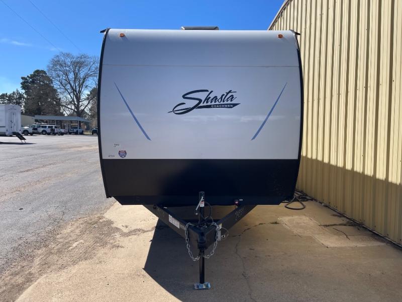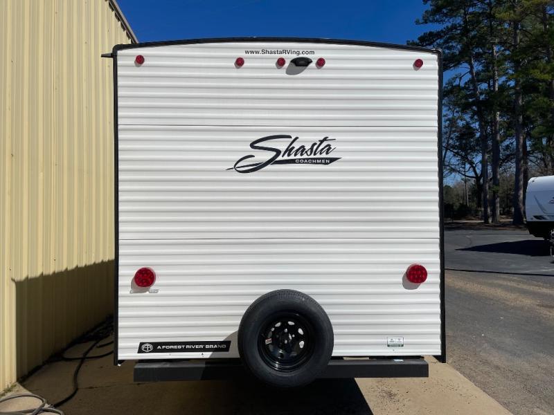 With each Shasta travel trailer by Shasta RVs, premium construction products are used such as 2x2 wood studs 16" on center or less, tinted black-framed radius safety glass windows, and full pass-through storage. Also included is an aerodynamic radius front profile, a front-colored rock guard to protect against road debris, a straight axle with electric breaks, and a power tongue jack for easy setup. The interior offers pocket-bored and screwed cabinets, USB charging stations, a pull-down faucet, and more providing value and convenience. The 200W solar panel comes with a 30-amp controller, and the tankless water heater will provide endless hot showers.