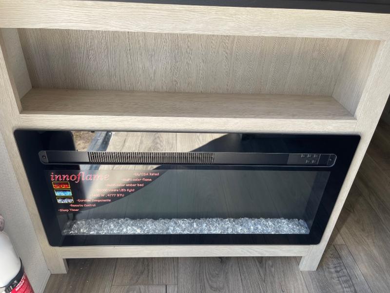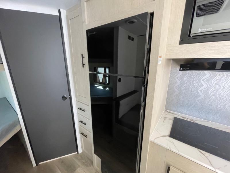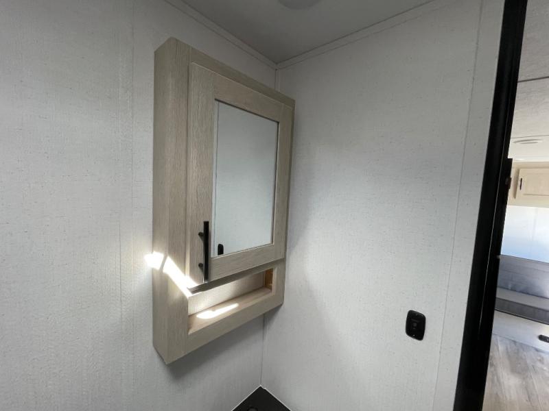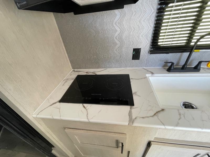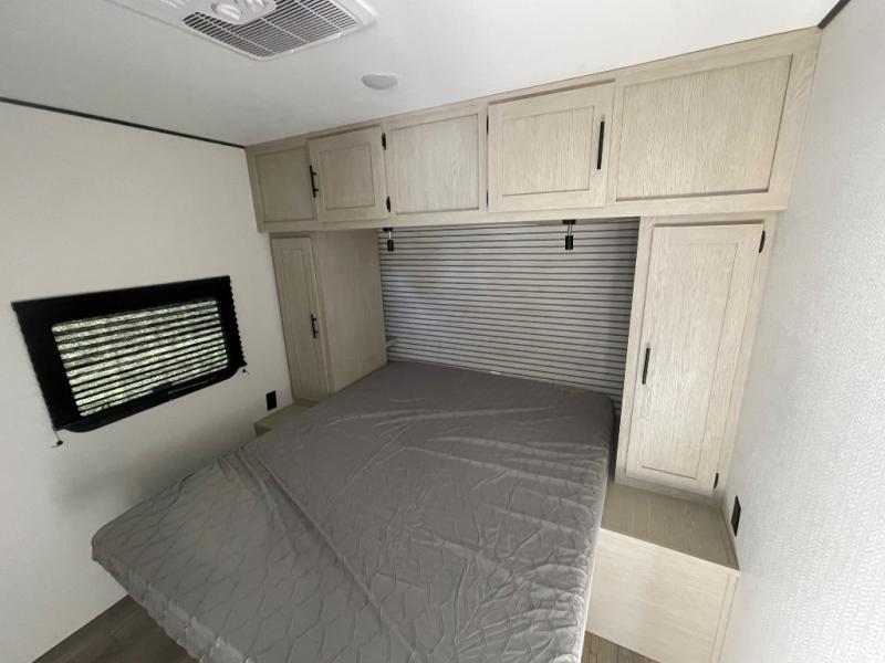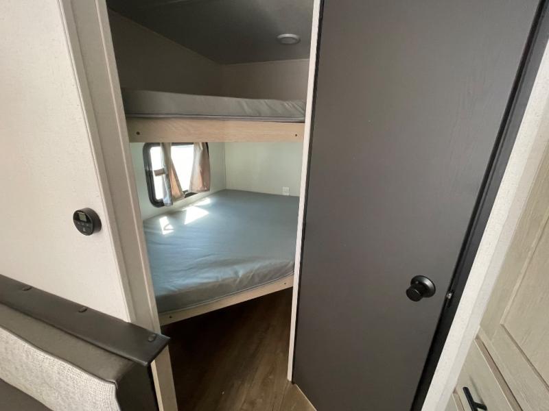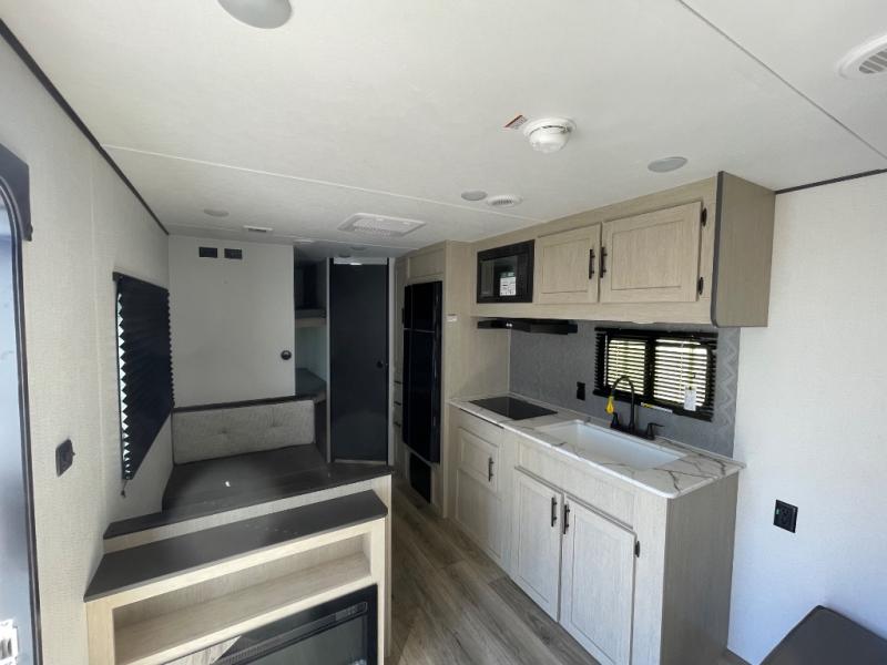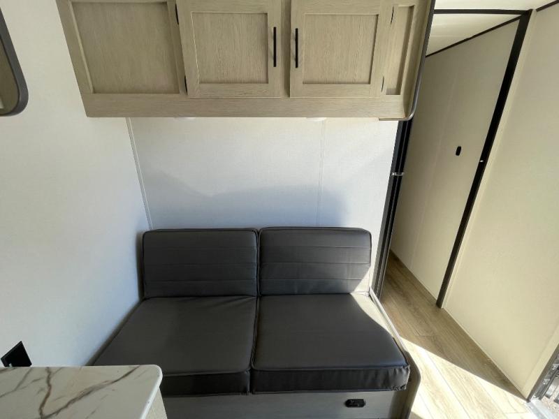 Each camping trip in this travel trailer will be time well spent! Once you arrive at your site, you can unload the exterior storage, then stretch your legs on a hike. The two-burner cooktop will let you make lunch for your crew when you return, and there is a rear corner full bath to freshen up. Adjacent to the bath are a set of double-size bunk beds for your guests or little ones. You'll have the front bedroom to yourselves with a walk-around queen bed, dual bedside wardrobes and shelves, and a privacy curtain. The booth dinette provides a place to dine together while the jackknife sofa gives you a space to unwind, and both of these pieces of furniture can double as additional sleeping space for guests!