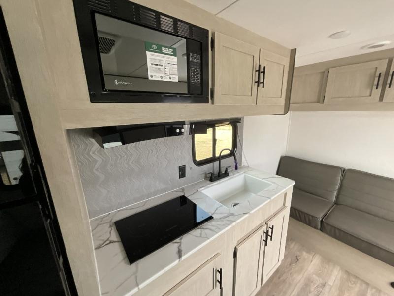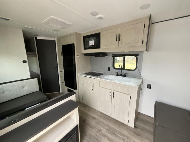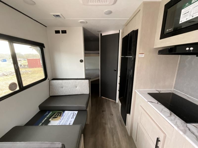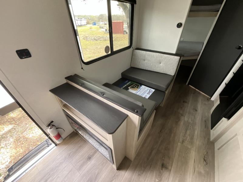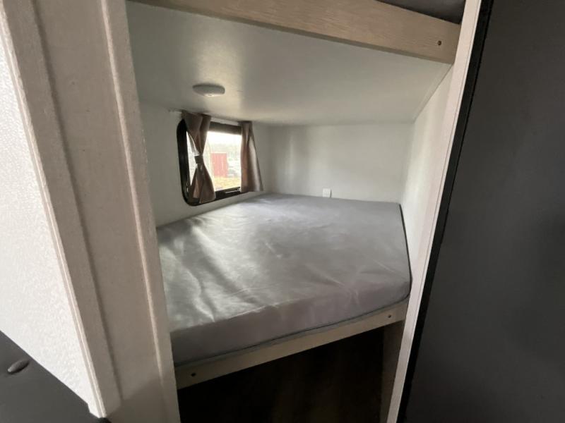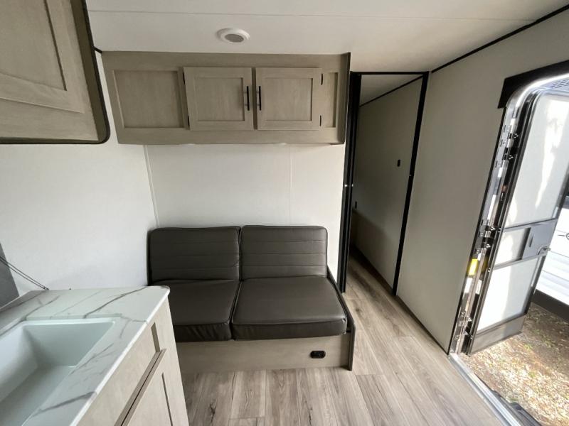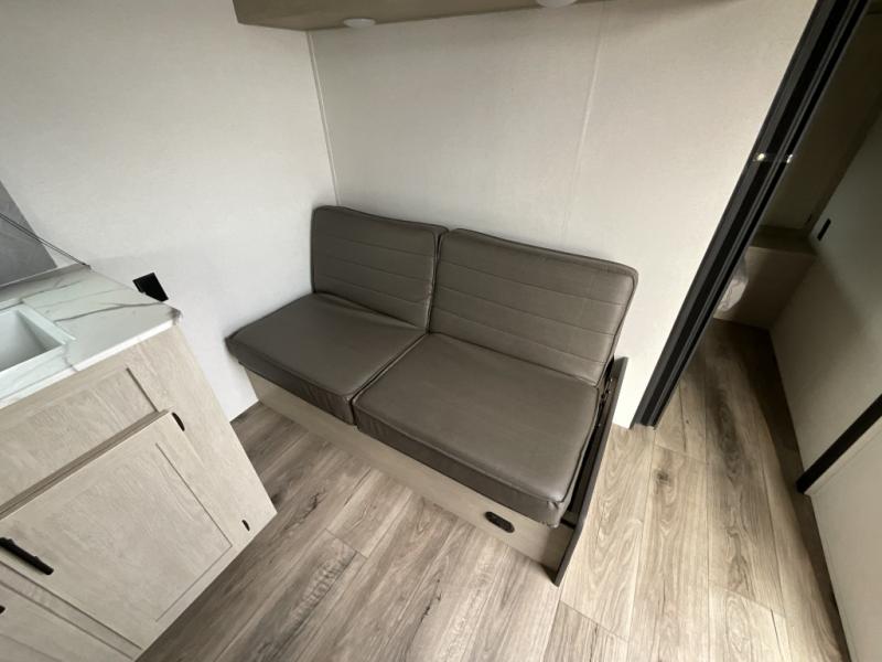 Each camping trip in this travel trailer will be time well spent! Once you arrive at your site, you can unload the exterior storage, then stretch your legs on a hike. The two-burner cooktop will let you make lunch for your crew when you return, and there is a rear corner full bath to freshen up. Adjacent to the bath are a set of double-size bunk beds for your guests or little ones. You'll have the front bedroom to yourselves with a walk-around queen bed, dual bedside wardrobes and shelves, and a privacy curtain. The booth dinette provides a place to dine together while the jackknife sofa gives you a space to unwind, and both of these pieces of furniture can double as additional sleeping space for guests!