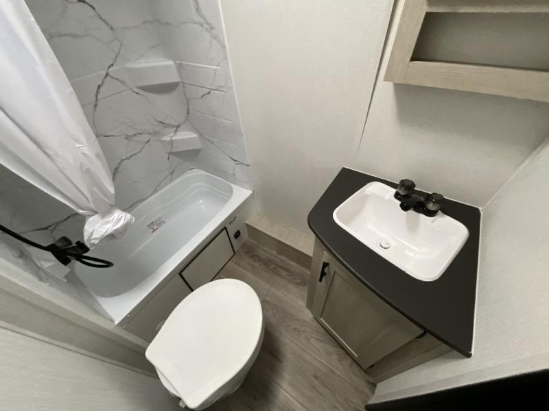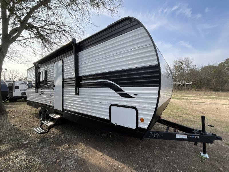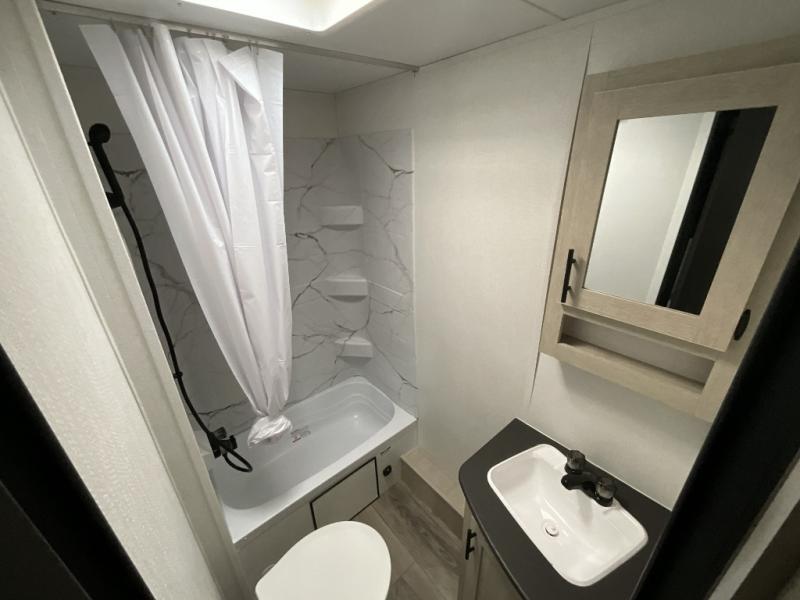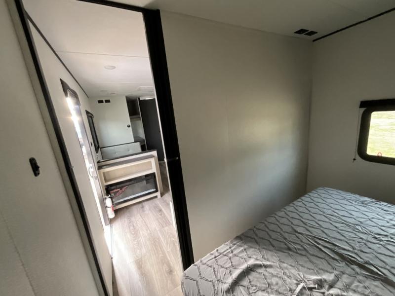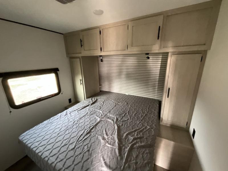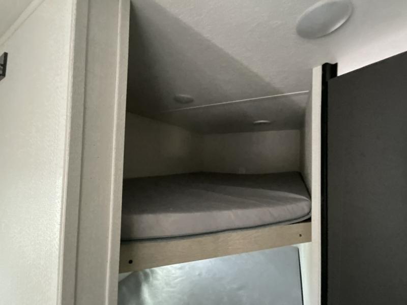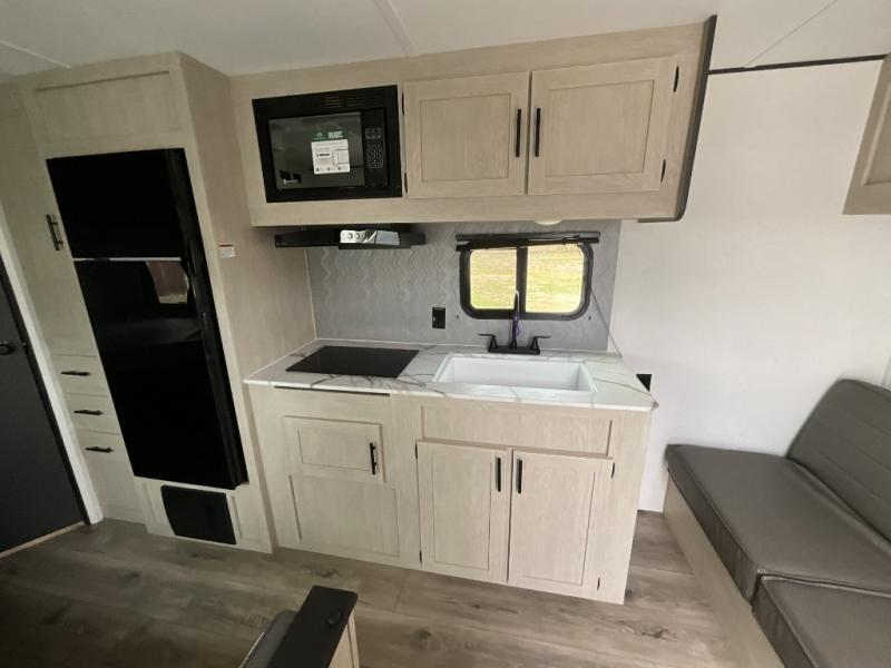Each camping trip in this travel trailer will be time well spent! Once you arrive at your site, you can unload the exterior storage, then stretch your legs on a hike. The two-burner cooktop will let you make lunch for your crew when you return, and there is a rear corner full bath to freshen up. Adjacent to the bath are a set of double-size bunk beds for your guests or little ones. You'll have the front bedroom to yourselves with a walk-around queen bed, dual bedside wardrobes and shelves, and a privacy curtain. The booth dinette provides a place to dine together while the jackknife sofa gives you a space to unwind, and both of these pieces of furniture can double as additional sleeping space for guests!