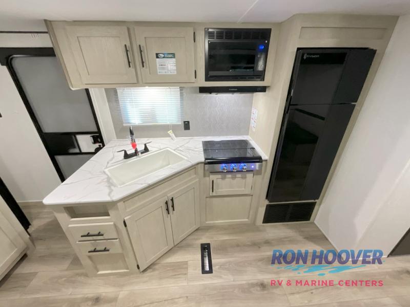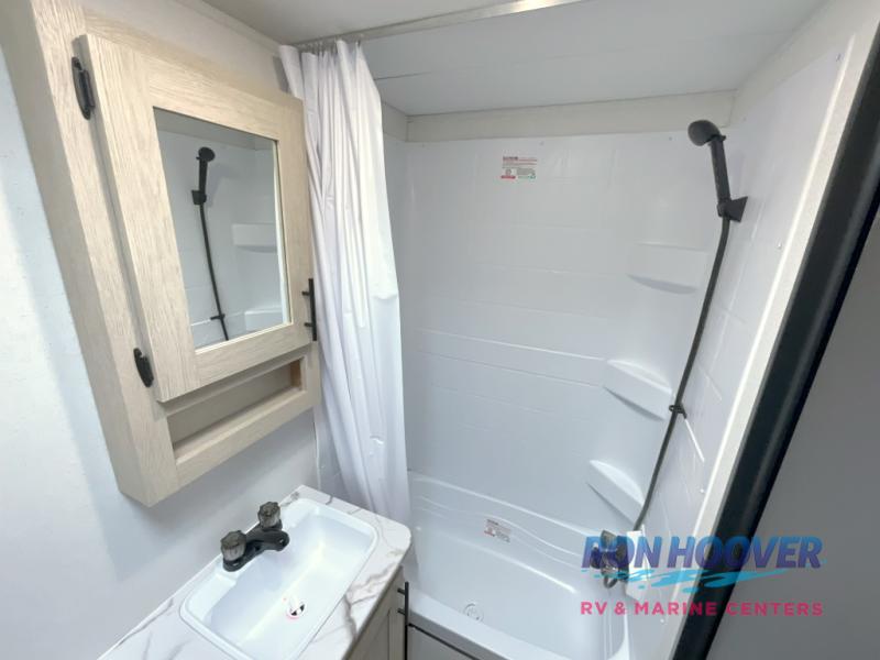 With each Shasta travel trailer by Shasta RVs, premium construction products are used such as 2x2 wood studs 16" on center or less, tinted black-framed radius safety glass windows, and full pass-through storage. Also included is an aerodynamic radius front profile, a front-colored rock guard to protect against road debris, a straight axle with electric breaks, and a power tongue jack for easy setup. The interior offers pocket-bored and screwed cabinets, USB charging stations, a pull-down faucet, and more providing value and convenience. The 200W solar panel comes with a 30-amp controller, and the tankless water heater will provide endless hot showers.