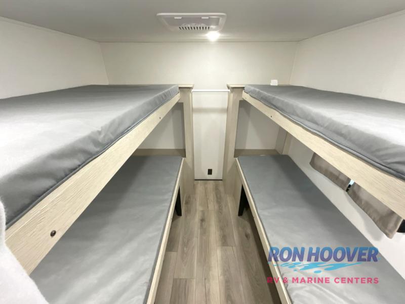 This travel trailer can comfortably sleep eight campers each night, so invite extra friends and family along! Your guests or kids can take the rear bunkhouse with four bunk beds and two linen closets for storage space. You'll have the front bedroom to yourselves with a walk-around queen bed, privacy curtains, plus dual wardrobes and shelves so everything has its place. Everyone can meet in the combined kitchen and living area each morning, which is made spacious thanks to the large slide out. Here, you'll find the booth dinette and jackknife sofa that will serve as dining, relaxing, and sleeping space for additional guests. There are full kitchen amenities that will allow you to make your best meals at the campground, and a full bath means you won't have to leave your camper in the middle of the night. This unit also includes washer and dryer prep if you choose to add those appliances!