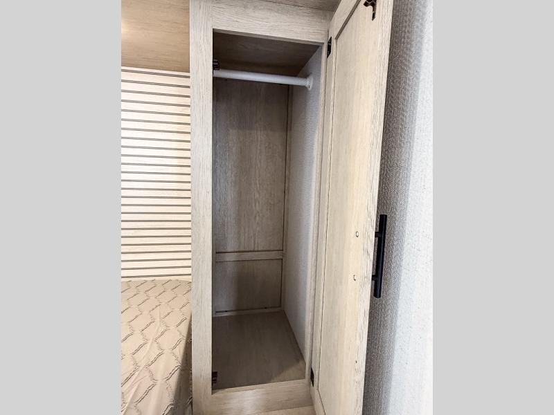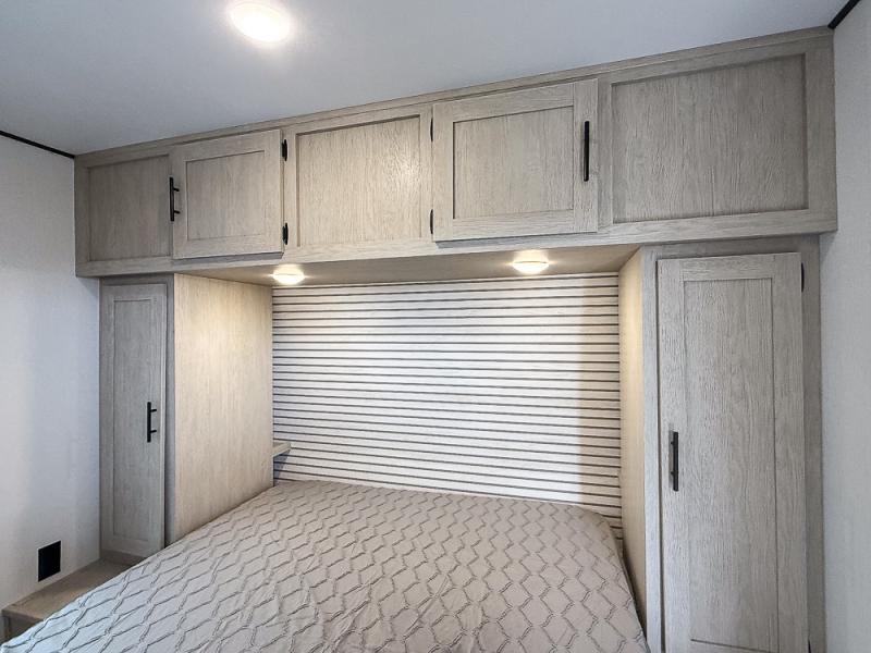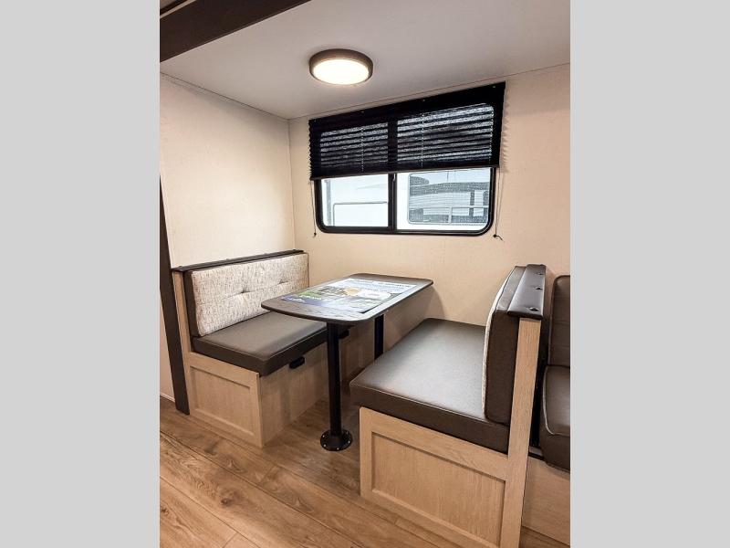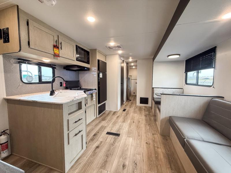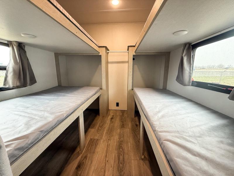 This travel trailer can comfortably sleep eight campers each night, so invite extra friends and family along! Your guests or kids can take the rear bunkhouse with four bunk beds and two linen closets for storage space. You'll have the front bedroom to yourselves with a walk-around queen bed, privacy curtains, plus dual wardrobes and shelves so everything has its place. Everyone can meet in the combined kitchen and living area each morning, which is made spacious thanks to the large slide out. Here, you'll find the booth dinette and jackknife sofa that will serve as dining, relaxing, and sleeping space for additional guests. There are full kitchen amenities that will allow you to make your best meals at the campground, and a full bath means you won't have to leave your camper in the middle of the night. This unit also includes washer and dryer prep if you choose to add those appliances!