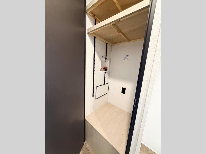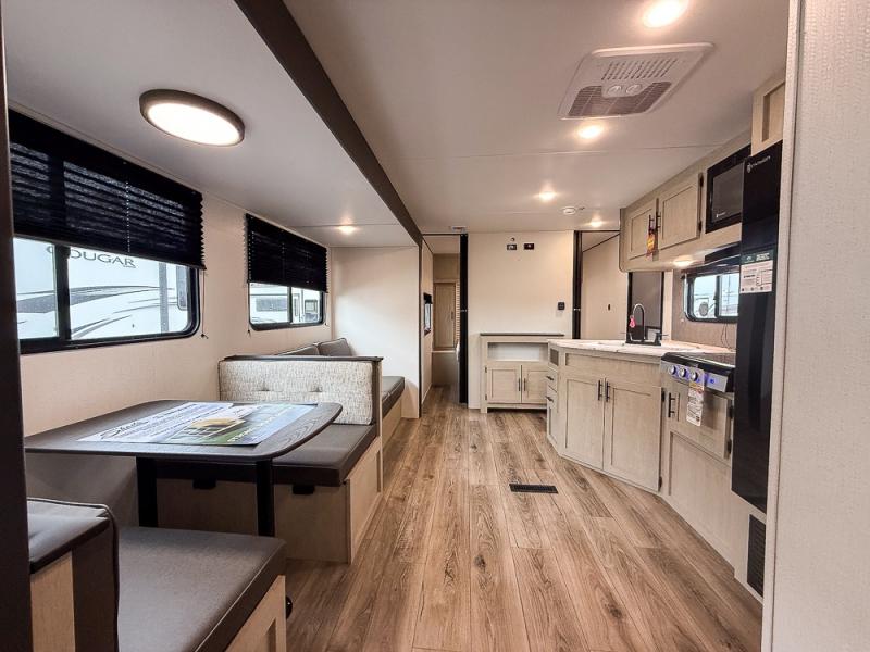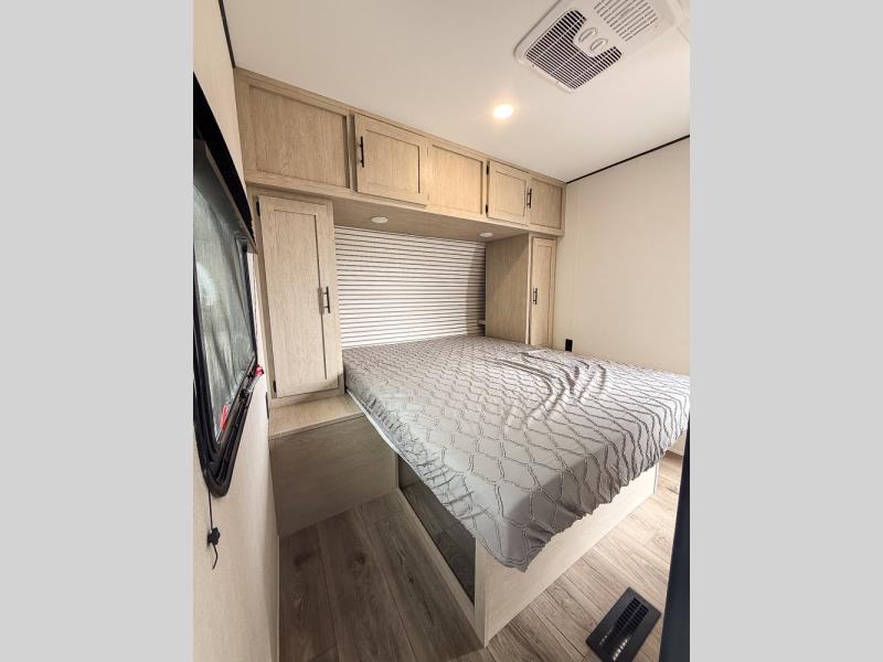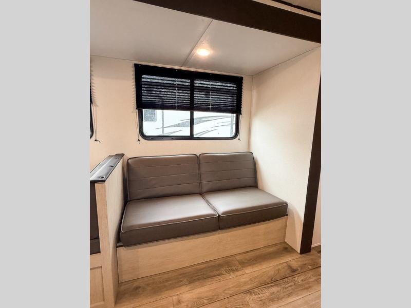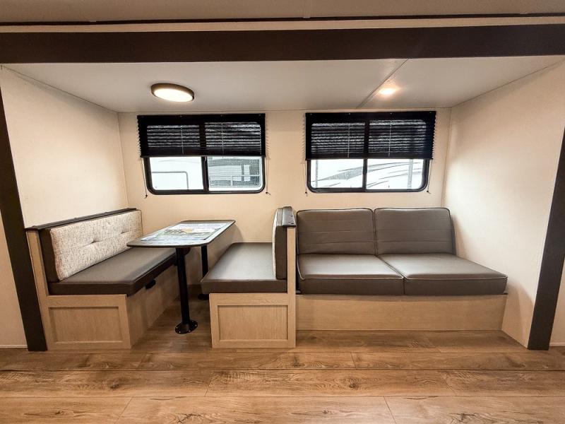 This travel trailer can comfortably sleep eight campers each night, so invite extra friends and family along! Your guests or kids can take the rear bunkhouse with four bunk beds and two linen closets for storage space. You'll have the front bedroom to yourselves with a walk-around queen bed, privacy curtains, plus dual wardrobes and shelves so everything has its place. Everyone can meet in the combined kitchen and living area each morning, which is made spacious thanks to the large slide out. Here, you'll find the booth dinette and jackknife sofa that will serve as dining, relaxing, and sleeping space for additional guests. There are full kitchen amenities that will allow you to make your best meals at the campground, and a full bath means you won't have to leave your camper in the middle of the night. This unit also includes washer and dryer prep if you choose to add those appliances!