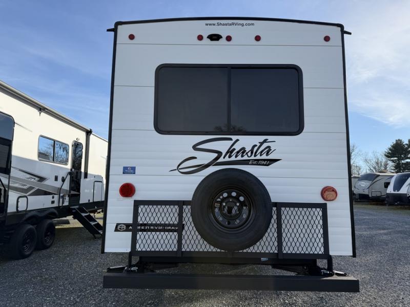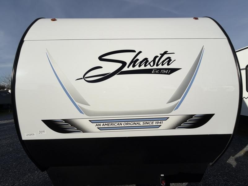 With each Shasta travel trailer by Shasta RVs, premium construction products are used such as 2x2 wood studs 16" on center or less, tinted black-framed radius safety glass windows, and full pass-through storage. Also included is an aerodynamic radius front profile, a front-colored rock guard to protect against road debris, a straight axle with electric breaks, and a power tongue jack for easy setup. The interior offers pocket-bored and screwed cabinets, USB charging stations, an pull down faucet, and more providing value and convenience. The 200W solar panel comes with a 30 amp controller, and the tankless water heater will provide endless hot showers.