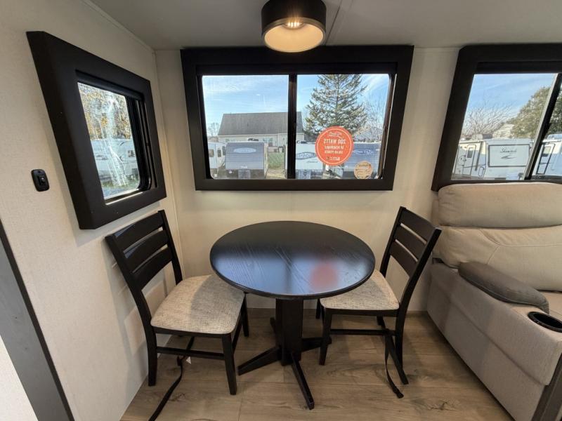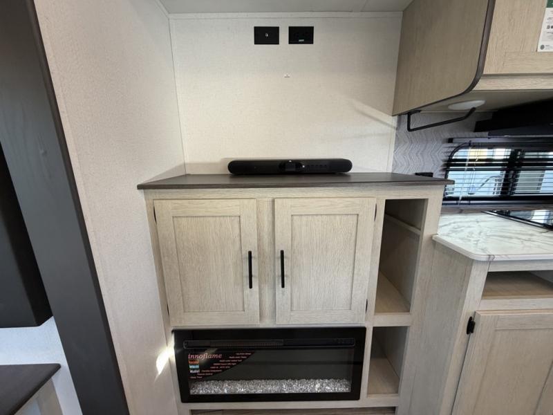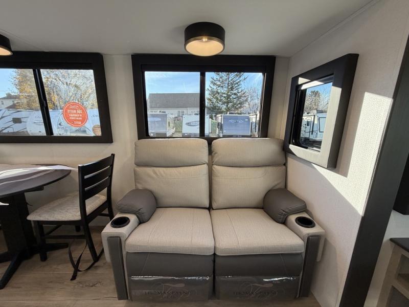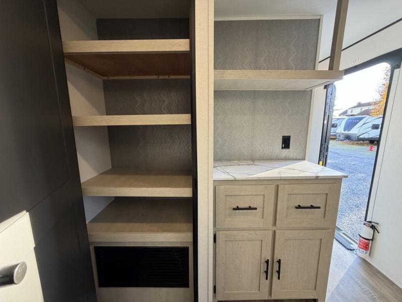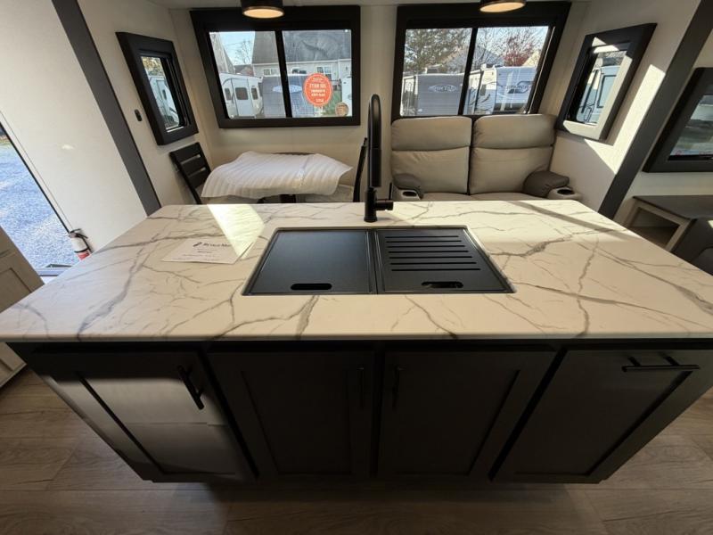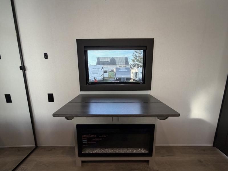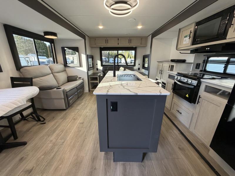 The front of this travel trailer features a spacious main bedroom with a queen bed set in a slide-out to maximize walking space, plus a large wardrobe for storing clothing and essentials; across from the bed, you’ll find TV prep and a convenient flip-up top for keeping important items within reach. Down the hall is a full bathroom equipped with a shower, toilet, and countertop sink so you can skip the campground facilities. At the rear, the kitchen and living area open up with dual opposing slides, creating a roomy, comfortable space to move around. One slide hosts the entertainment center with a fireplace, along with ample countertops, a glass cooktop with oven, overhead cabinets, a 10-cu. ft. refrigerator, and a nearby pantry for dry goods. A center kitchen island with a built-in sink offers even more prep space. Opposite, the second slide provides theater seating for relaxing after a day of adventure, while the 36" round table is perfect for dining or board games, and a rear lounger sofa adds extra seating for guests.