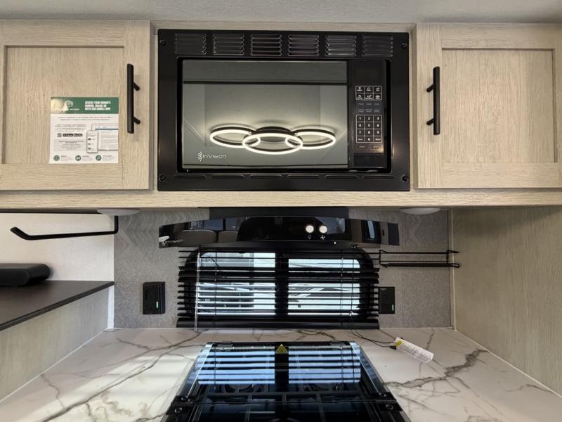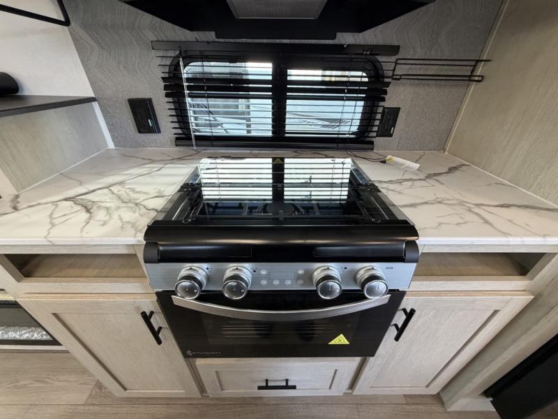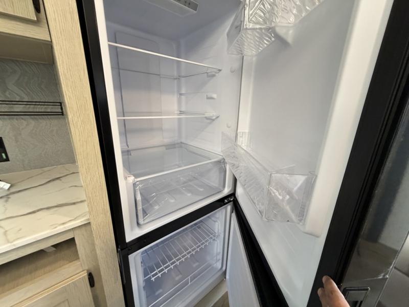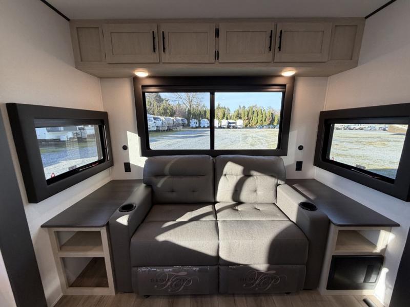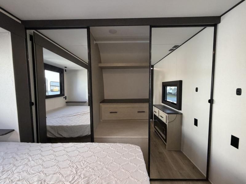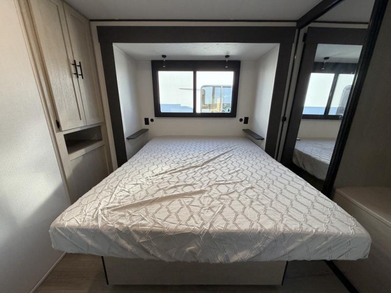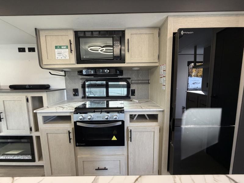 The front of this travel trailer features a spacious main bedroom with a queen bed set in a slide-out to maximize walking space, plus a large wardrobe for storing clothing and essentials; across from the bed, you’ll find TV prep and a convenient flip-up top for keeping important items within reach. Down the hall is a full bathroom equipped with a shower, toilet, and countertop sink so you can skip the campground facilities. At the rear, the kitchen and living area open up with dual opposing slides, creating a roomy, comfortable space to move around. One slide hosts the entertainment center with a fireplace, along with ample countertops, a glass cooktop with oven, overhead cabinets, a 10-cu. ft. refrigerator, and a nearby pantry for dry goods. A center kitchen island with a built-in sink offers even more prep space. Opposite, the second slide provides theater seating for relaxing after a day of adventure, while the 36" round table is perfect for dining or board games, and a rear lounger sofa adds extra seating for guests.