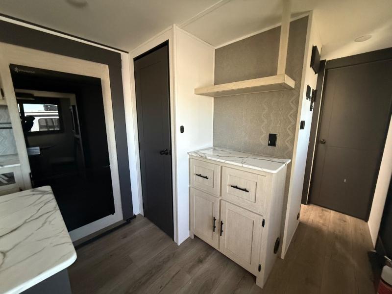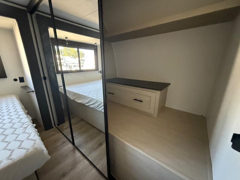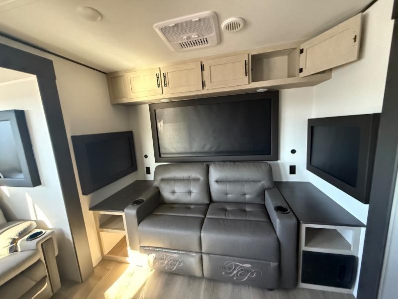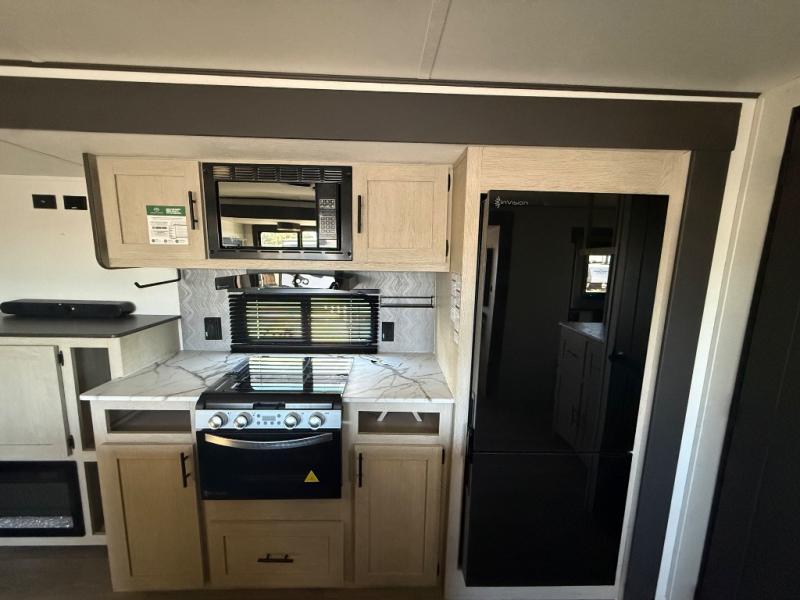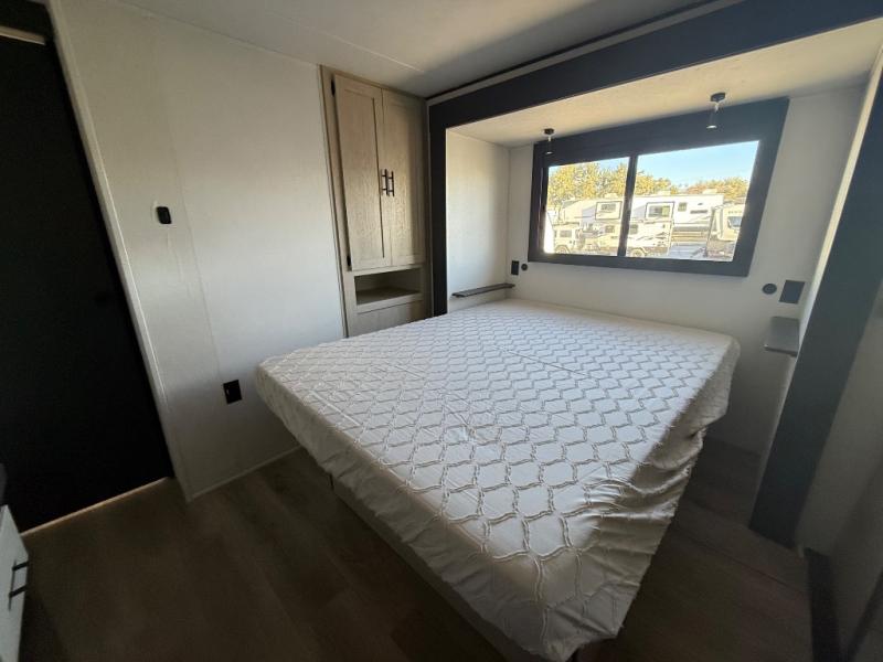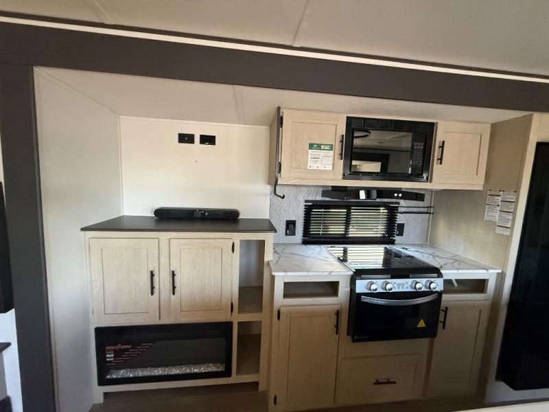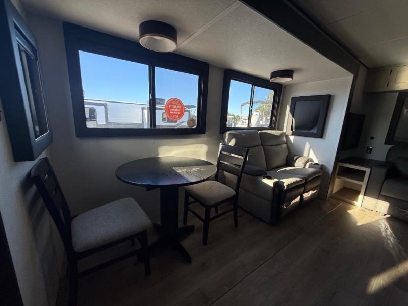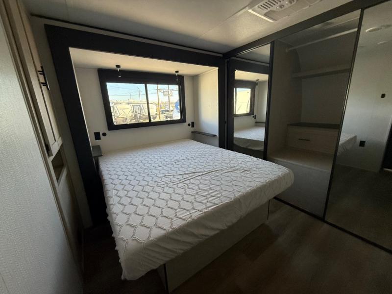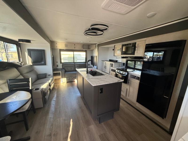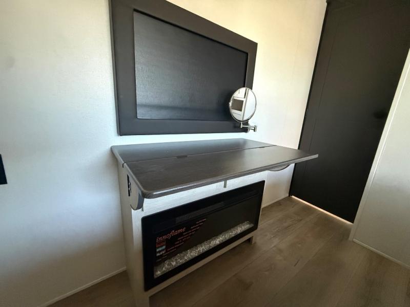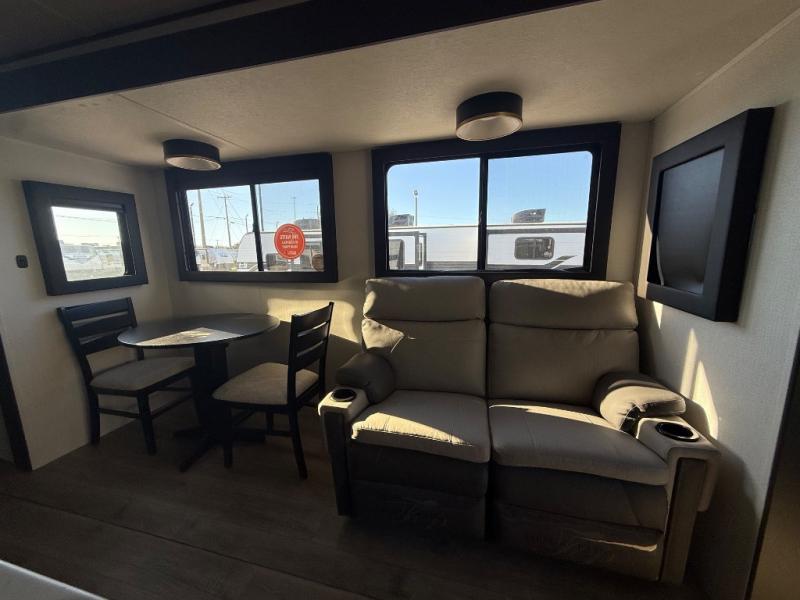 The front of this travel trailer features a spacious main bedroom with a queen bed set in a slide-out to maximize walking space, plus a large wardrobe for storing clothing and essentials; across from the bed, you’ll find TV prep and a convenient flip-up top for keeping important items within reach. Down the hall is a full bathroom equipped with a shower, toilet, and countertop sink so you can skip the campground facilities. At the rear, the kitchen and living area open up with dual opposing slides, creating a roomy, comfortable space to move around. One slide hosts the entertainment center with a fireplace, along with ample countertops, a glass cooktop with oven, overhead cabinets, a 10-cu. ft. refrigerator, and a nearby pantry for dry goods. A center kitchen island with a built-in sink offers even more prep space. Opposite, the second slide provides theater seating for relaxing after a day of adventure, while the 36" round table is perfect for dining or board games, and a rear lounger sofa adds extra seating for guests.