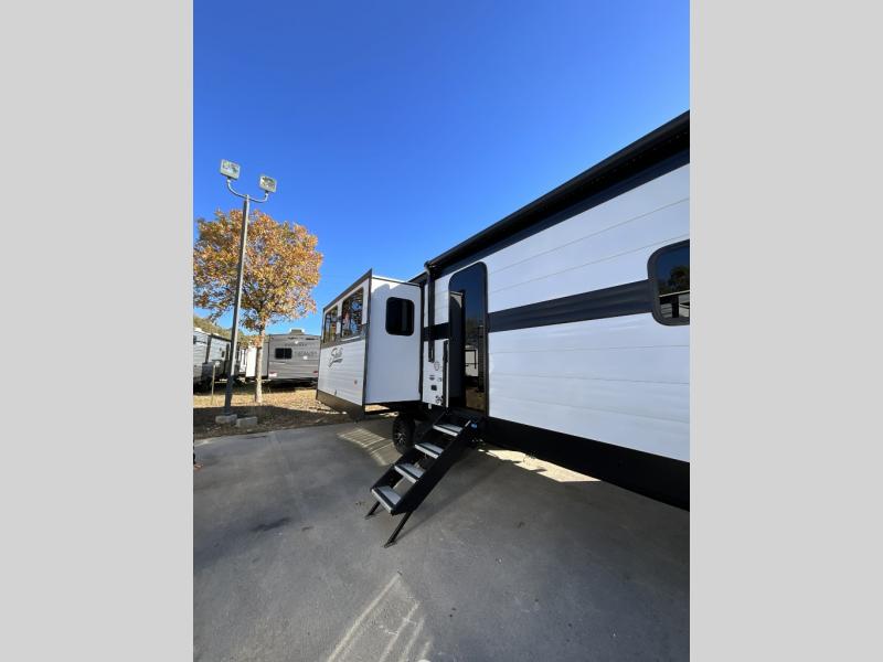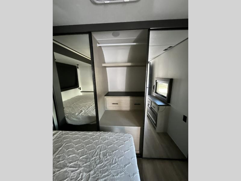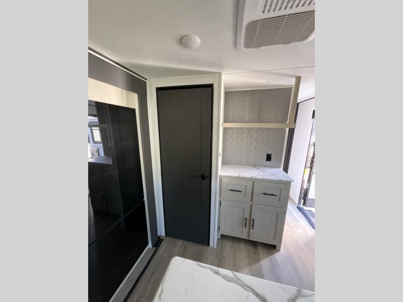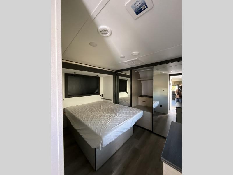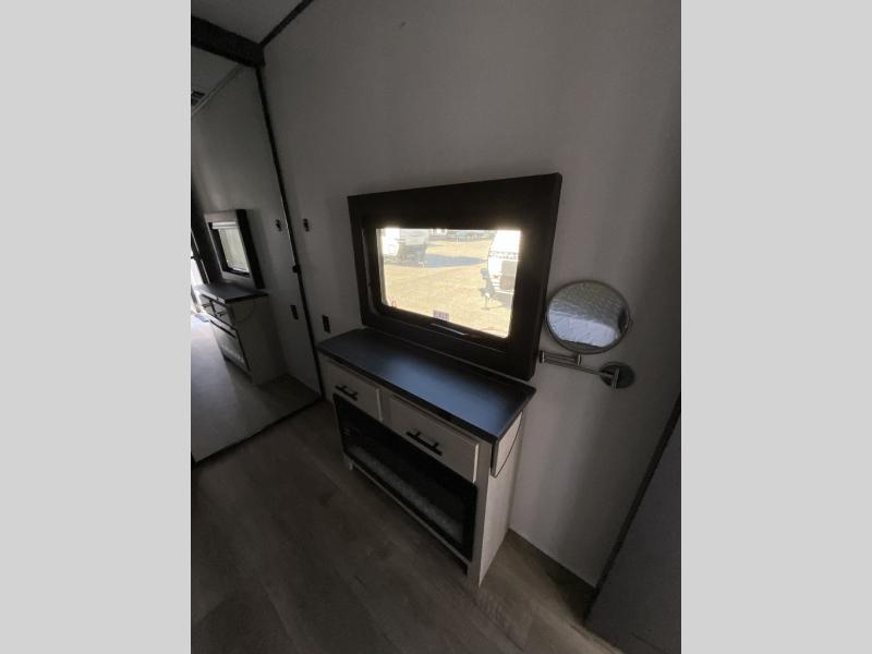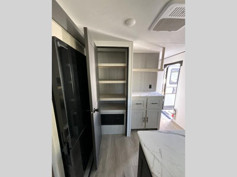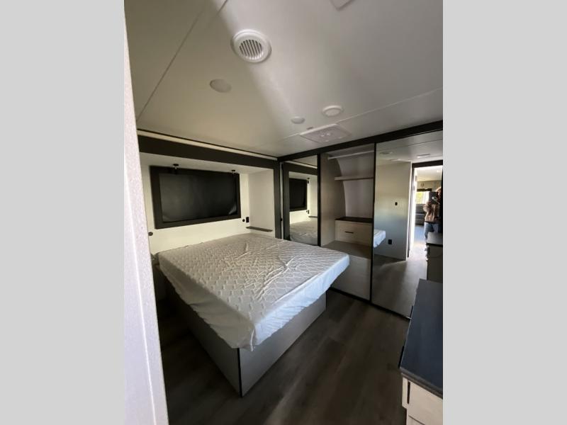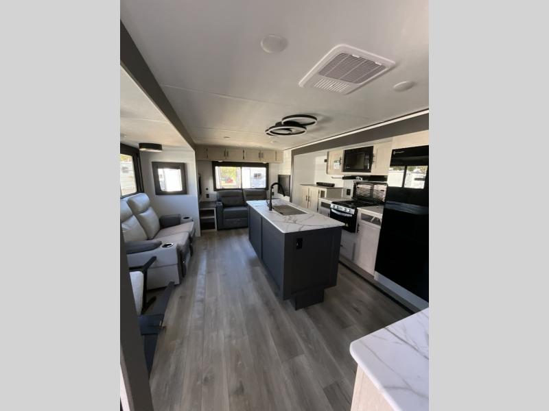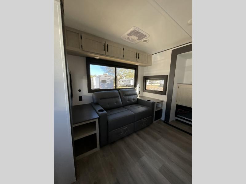 The front of this travel trailer features a spacious main bedroom with a queen bed set in a slide-out to maximize walking space, plus a large wardrobe for storing clothing and essentials; across from the bed, you’ll find TV prep and a convenient flip-up top for keeping important items within reach. Down the hall is a full bathroom equipped with a shower, toilet, and countertop sink so you can skip the campground facilities. At the rear, the kitchen and living area open up with dual opposing slides, creating a roomy, comfortable space to move around. One slide hosts the entertainment center with a fireplace, along with ample countertops, a glass cooktop with oven, overhead cabinets, a 10-cu. ft. refrigerator, and a nearby pantry for dry goods. A center kitchen island with a built-in sink offers even more prep space. Opposite, the second slide provides theater seating for relaxing after a day of adventure, while the 36" round table is perfect for dining or board games, and a rear lounger sofa adds extra seating for guests.
