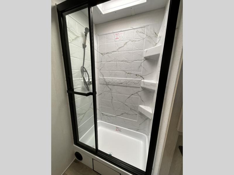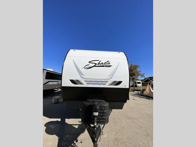With each Shasta travel trailer by Shasta RVs, premium construction products are used such as 2x2 wood studs 16" on center or less, tinted black-framed radius safety glass windows, and full pass-through storage. Also included is an aerodynamic radius front profile, a front-colored rock guard to protect against road debris, a straight axle with electric breaks, and a power tongue jack for easy setup. The interior offers pocket-bored and screwed cabinets, USB charging stations, an pull down faucet, and more providing value and convenience. The 200W solar panel comes with a 30 amp controller, and the tankless water heater will provide endless hot showers.