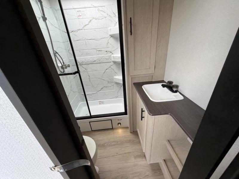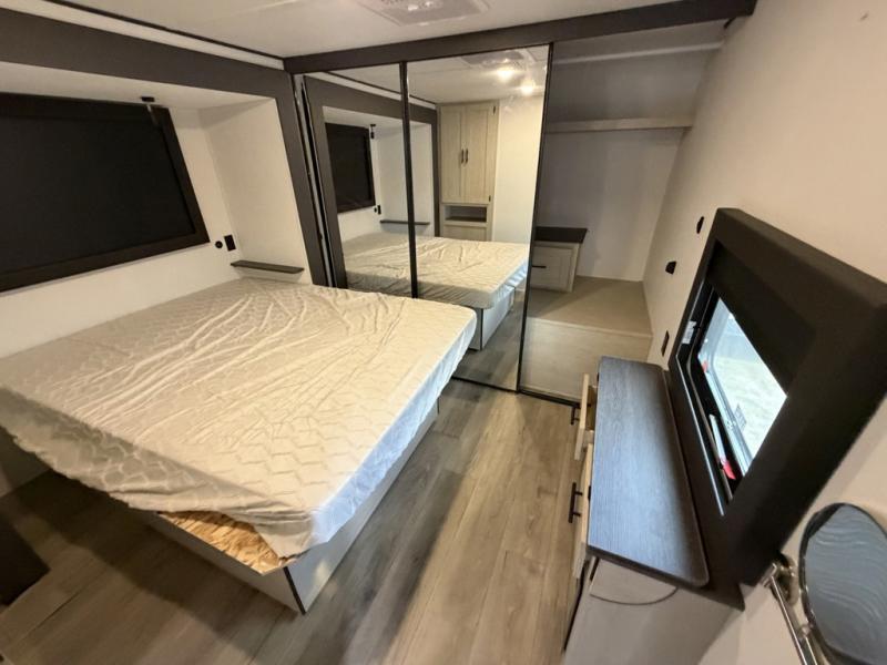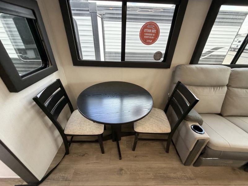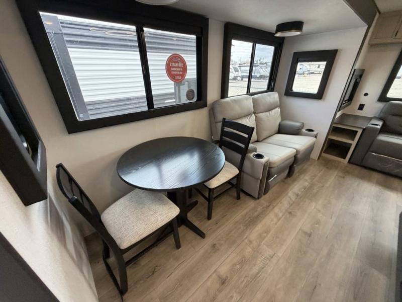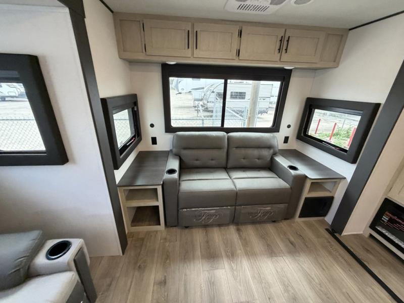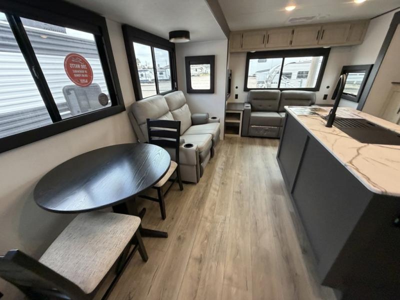 The front of this travel trailer features a spacious main bedroom with a queen bed set in a slide-out to maximize walking space, plus a large wardrobe for storing clothing and essentials; across from the bed, you’ll find TV prep and a convenient flip-up top for keeping important items within reach. Down the hall is a full bathroom equipped with a shower, toilet, and countertop sink so you can skip the campground facilities. At the rear, the kitchen and living area open up with dual opposing slides, creating a roomy, comfortable space to move around. One slide hosts the entertainment center with a fireplace, along with ample countertops, a glass cooktop with oven, overhead cabinets, a 10-cu. ft. refrigerator, and a nearby pantry for dry goods. A center kitchen island with a built-in sink offers even more prep space. Opposite, the second slide provides theater seating for relaxing after a day of adventure, while the 36" round table is perfect for dining or board games, and a rear lounger sofa adds extra seating for guests.