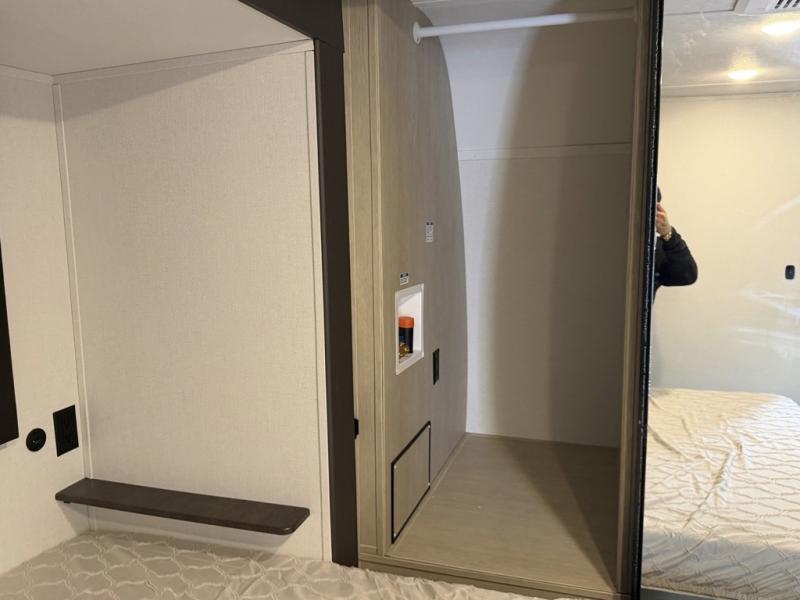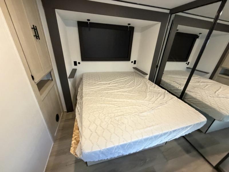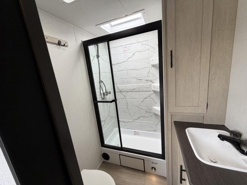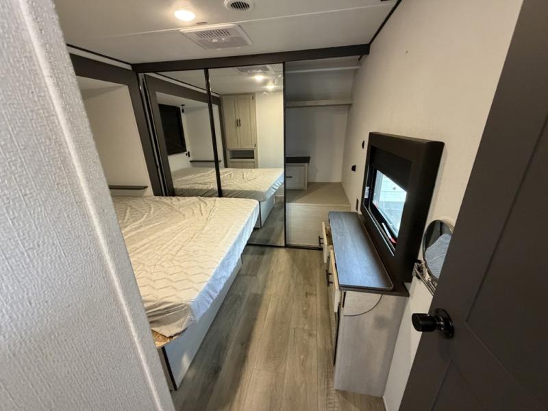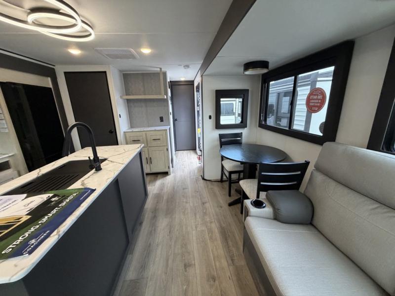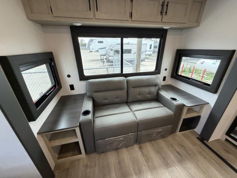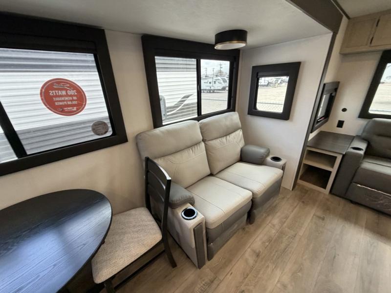 The front of this travel trailer features a spacious main bedroom with a queen bed set in a slide-out to maximize walking space, plus a large wardrobe for storing clothing and essentials; across from the bed, you’ll find TV prep and a convenient flip-up top for keeping important items within reach. Down the hall is a full bathroom equipped with a shower, toilet, and countertop sink so you can skip the campground facilities. At the rear, the kitchen and living area open up with dual opposing slides, creating a roomy, comfortable space to move around. One slide hosts the entertainment center with a fireplace, along with ample countertops, a glass cooktop with oven, overhead cabinets, a 10-cu. ft. refrigerator, and a nearby pantry for dry goods. A center kitchen island with a built-in sink offers even more prep space. Opposite, the second slide provides theater seating for relaxing after a day of adventure, while the 36" round table is perfect for dining or board games, and a rear lounger sofa adds extra seating for guests.