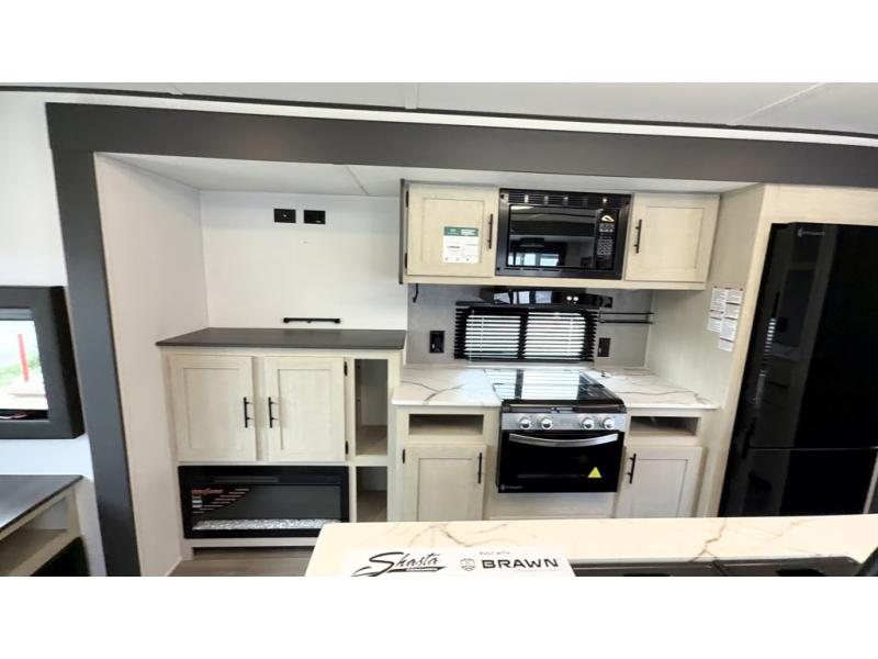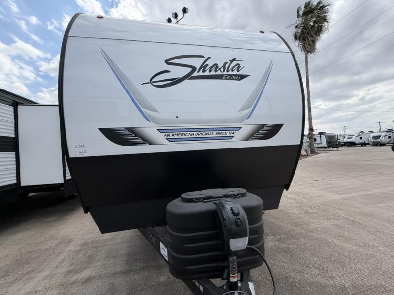 With each Shasta travel trailer by Shasta RVs, premium construction products are used such as 2x2 wood studs 16" on center or less, tinted black-framed radius safety glass windows, and full pass-through storage. Also included is an aerodynamic radius front profile, a front-colored rock guard to protect against road debris, a straight axle with electric breaks, and a power tongue jack for easy setup. The interior offers pocket-bored and screwed cabinets, USB charging stations, an pull down faucet, and more providing value and convenience. The 200W solar panel comes with a 30 amp controller, and the tankless water heater will provide endless hot showers.