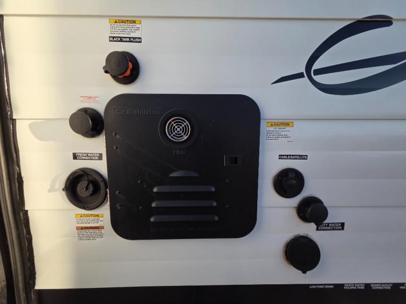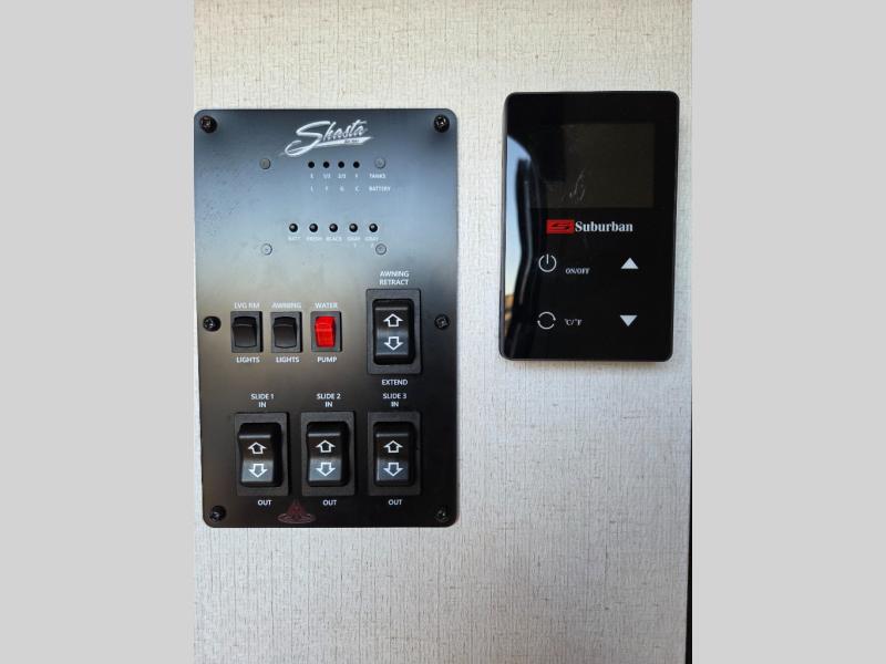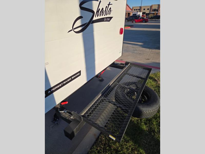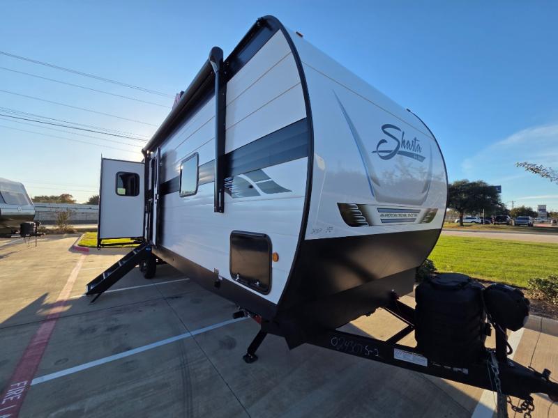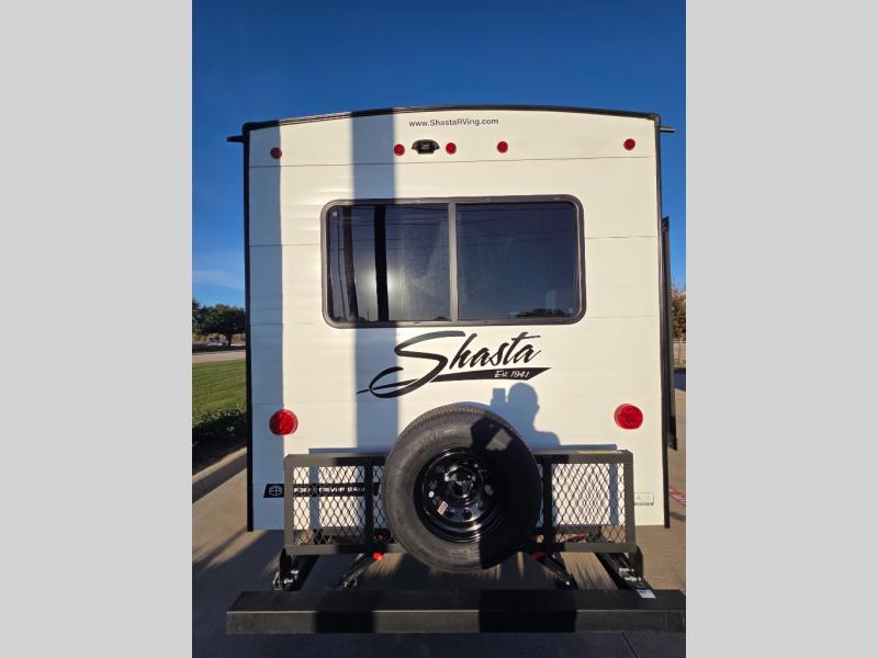 With each Shasta travel trailer by Shasta RVs, premium construction products are used such as 2x2 wood studs 16" on center or less, tinted black-framed radius safety glass windows, and full pass-through storage. Also included is an aerodynamic radius front profile, a front-colored rock guard to protect against road debris, a straight axle with electric breaks, and a power tongue jack for easy setup. The interior offers pocket-bored and screwed cabinets, USB charging stations, an pull down faucet, and more providing value and convenience. The 200W solar panel comes with a 30 amp controller, and the tankless water heater will provide endless hot showers.
