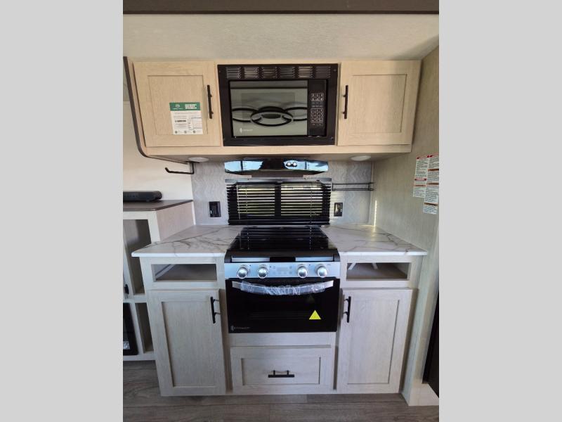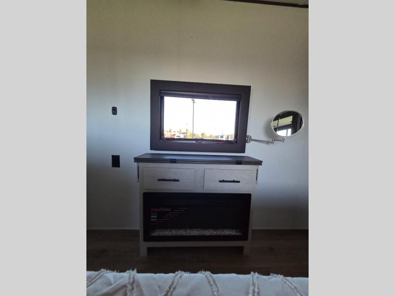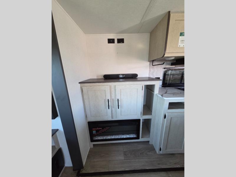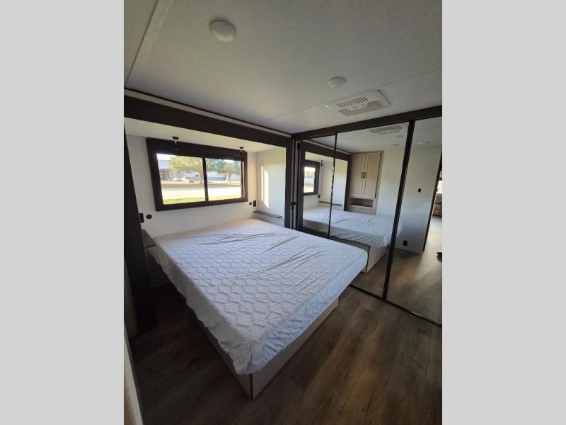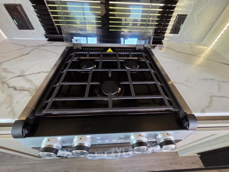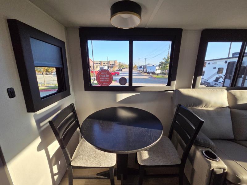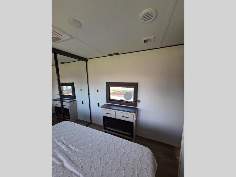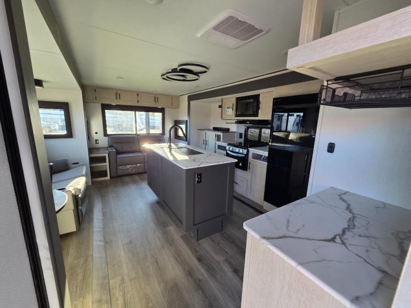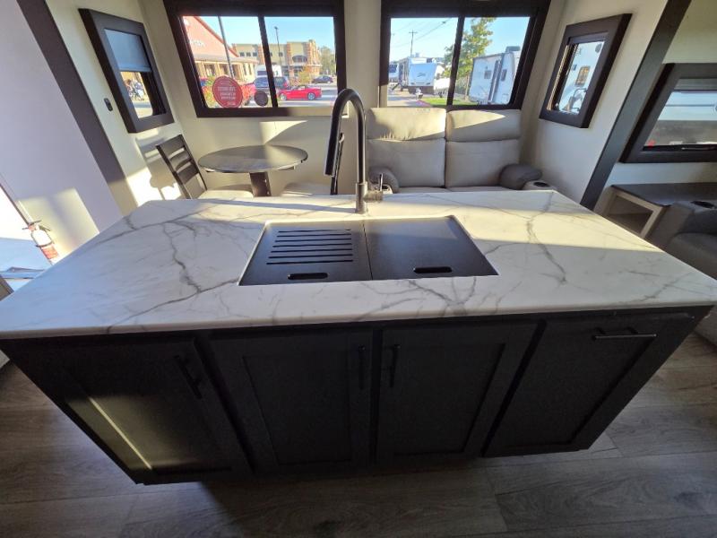 The front of this travel trailer features a spacious main bedroom with a queen bed set in a slide-out to maximize walking space, plus a large wardrobe for storing clothing and essentials; across from the bed, you’ll find TV prep and a convenient flip-up top for keeping important items within reach. Down the hall is a full bathroom equipped with a shower, toilet, and countertop sink so you can skip the campground facilities. At the rear, the kitchen and living area open up with dual opposing slides, creating a roomy, comfortable space to move around. One slide hosts the entertainment center with a fireplace, along with ample countertops, a glass cooktop with oven, overhead cabinets, a 10-cu. ft. refrigerator, and a nearby pantry for dry goods. A center kitchen island with a built-in sink offers even more prep space. Opposite, the second slide provides theater seating for relaxing after a day of adventure, while the 36" round table is perfect for dining or board games, and a rear lounger sofa adds extra seating for guests.