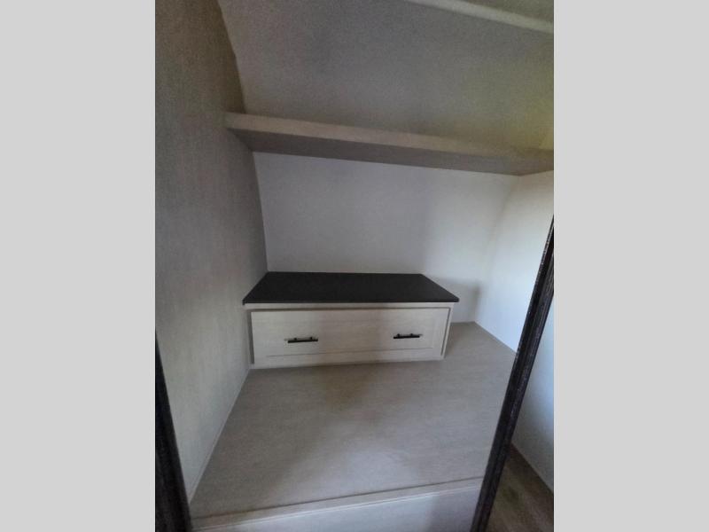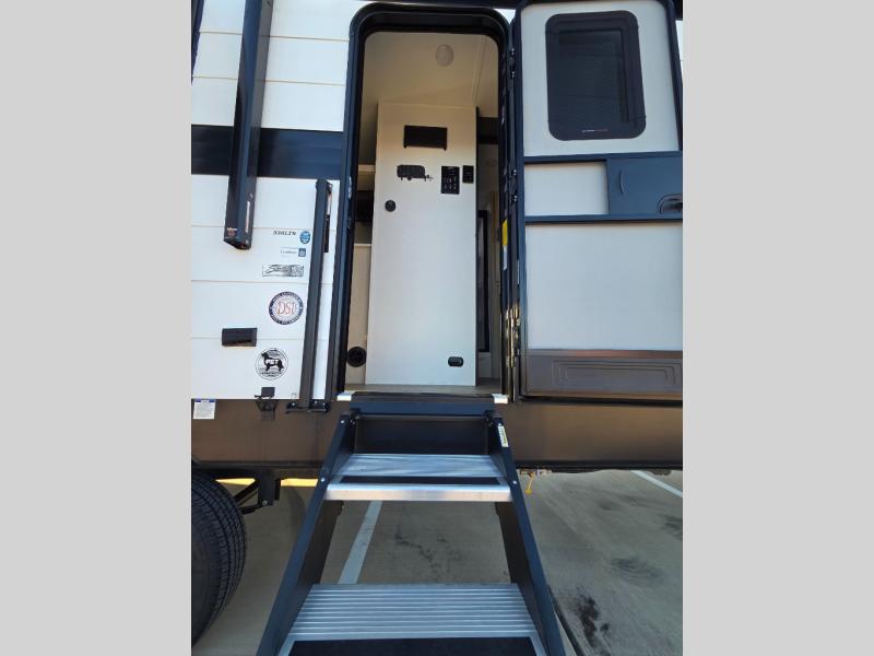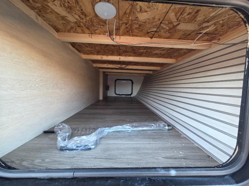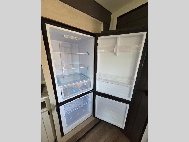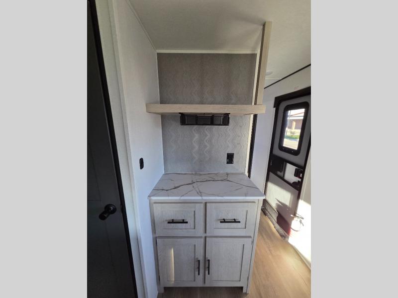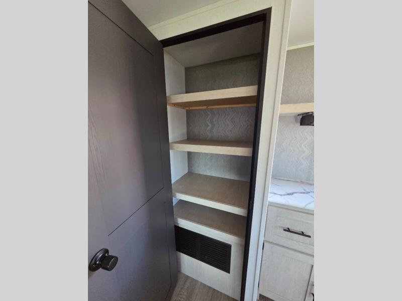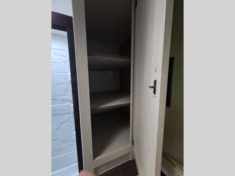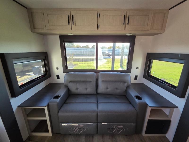 The front of this travel trailer features a spacious main bedroom with a queen bed set in a slide-out to maximize walking space, plus a large wardrobe for storing clothing and essentials; across from the bed, you’ll find TV prep and a convenient flip-up top for keeping important items within reach. Down the hall is a full bathroom equipped with a shower, toilet, and countertop sink so you can skip the campground facilities. At the rear, the kitchen and living area open up with dual opposing slides, creating a roomy, comfortable space to move around. One slide hosts the entertainment center with a fireplace, along with ample countertops, a glass cooktop with oven, overhead cabinets, a 10-cu. ft. refrigerator, and a nearby pantry for dry goods. A center kitchen island with a built-in sink offers even more prep space. Opposite, the second slide provides theater seating for relaxing after a day of adventure, while the 36" round table is perfect for dining or board games, and a rear lounger sofa adds extra seating for guests.