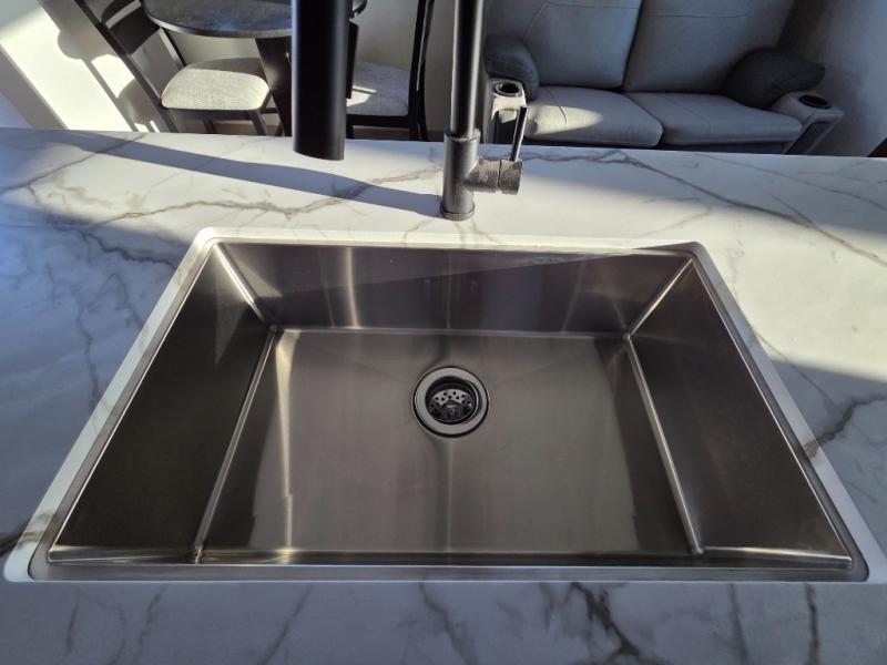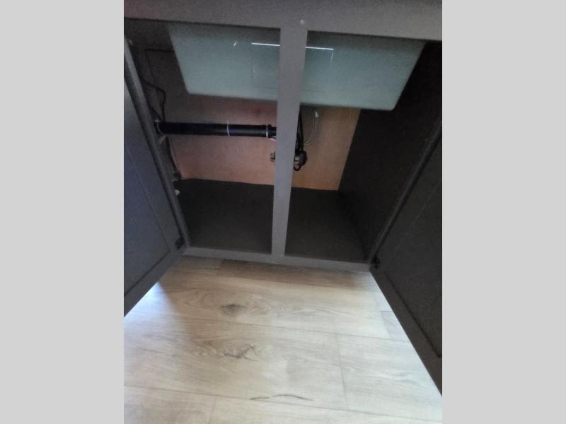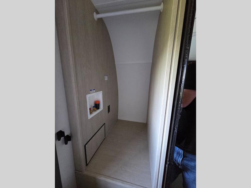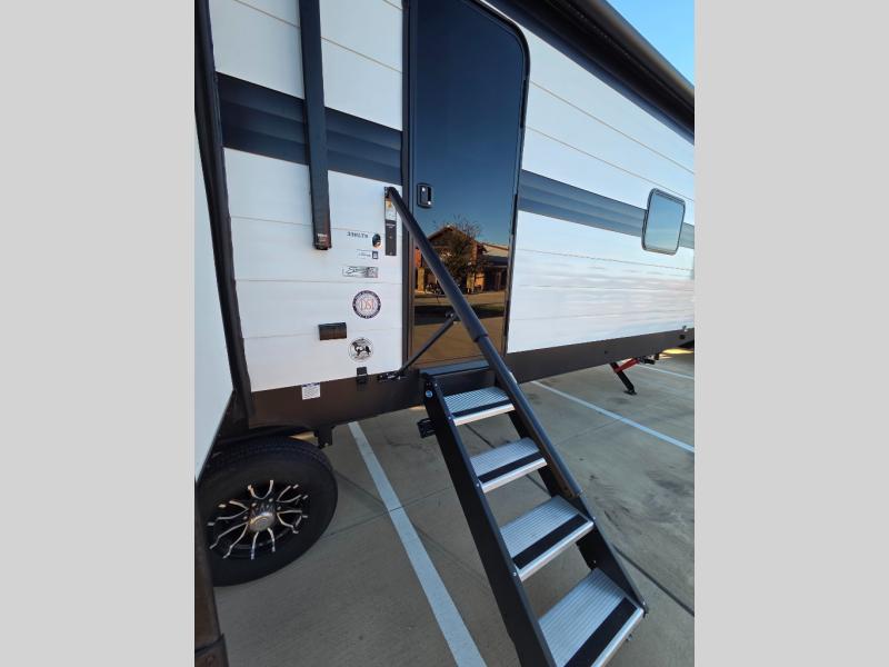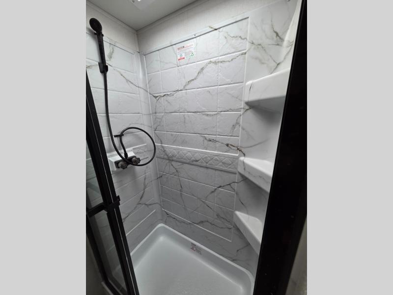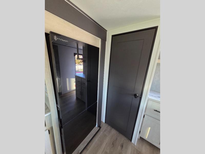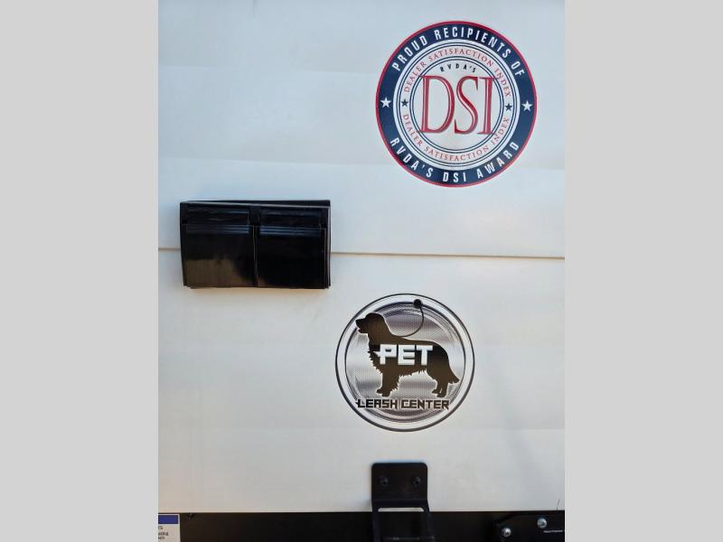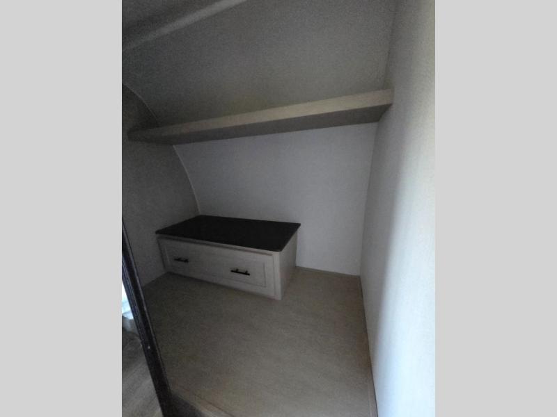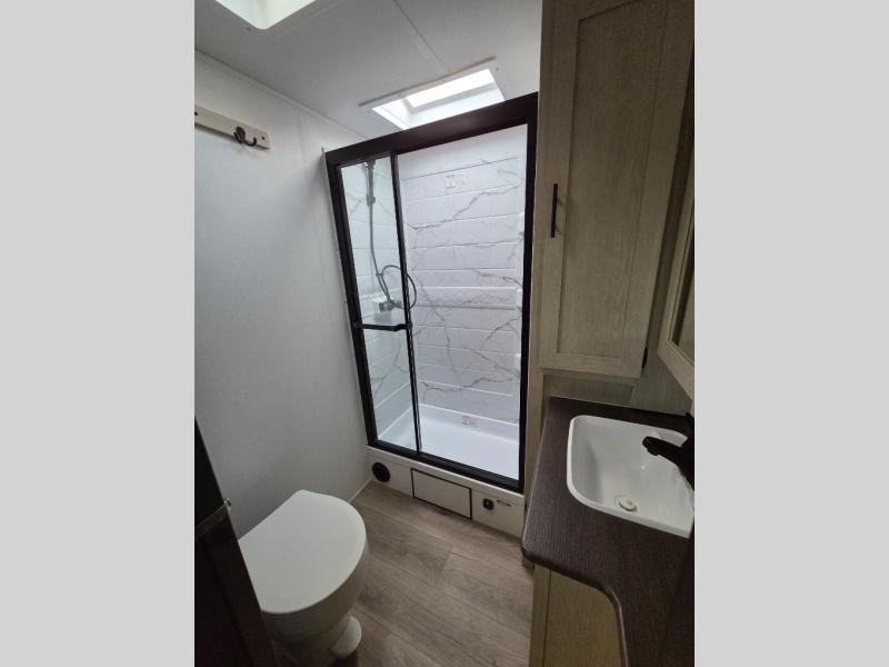 The front of this travel trailer features a spacious main bedroom with a queen bed set in a slide-out to maximize walking space, plus a large wardrobe for storing clothing and essentials; across from the bed, you’ll find TV prep and a convenient flip-up top for keeping important items within reach. Down the hall is a full bathroom equipped with a shower, toilet, and countertop sink so you can skip the campground facilities. At the rear, the kitchen and living area open up with dual opposing slides, creating a roomy, comfortable space to move around. One slide hosts the entertainment center with a fireplace, along with ample countertops, a glass cooktop with oven, overhead cabinets, a 10-cu. ft. refrigerator, and a nearby pantry for dry goods. A center kitchen island with a built-in sink offers even more prep space. Opposite, the second slide provides theater seating for relaxing after a day of adventure, while the 36" round table is perfect for dining or board games, and a rear lounger sofa adds extra seating for guests.