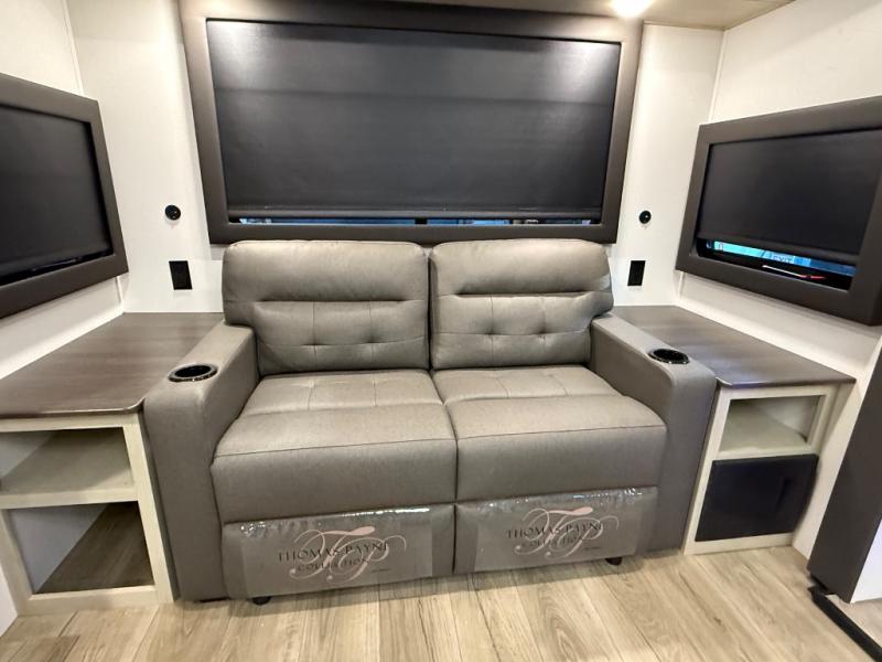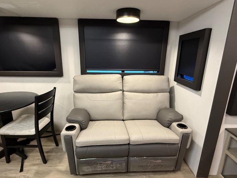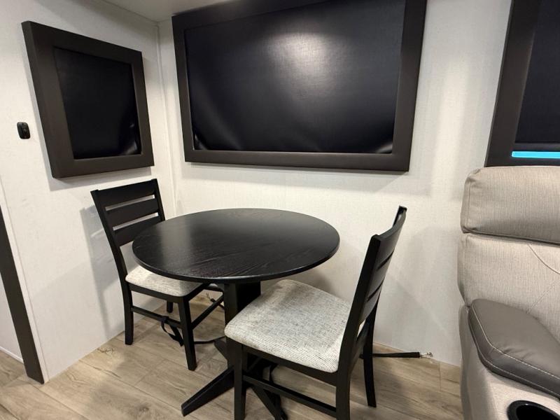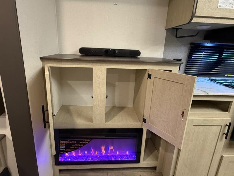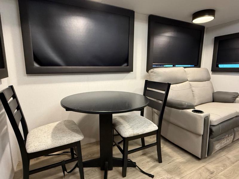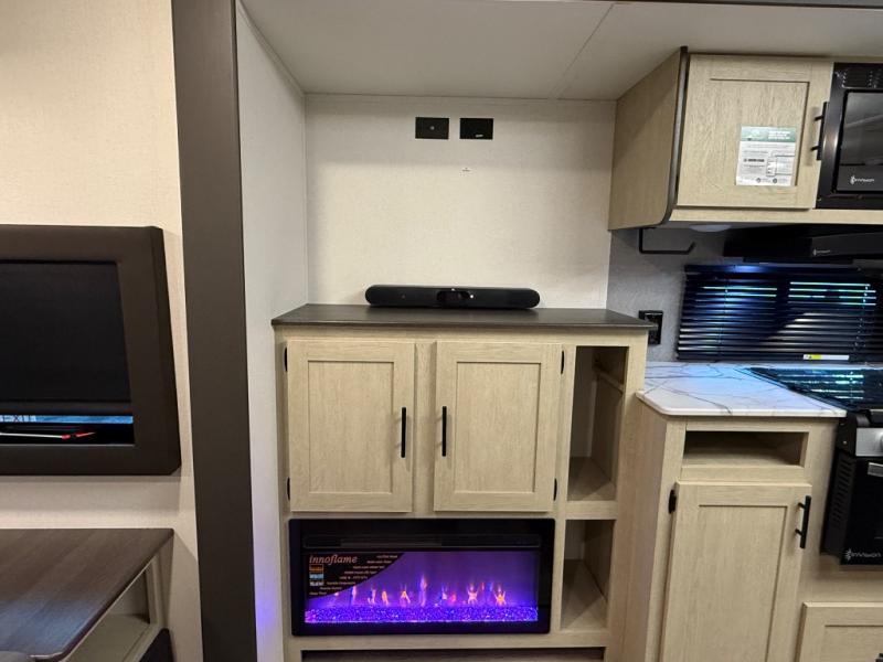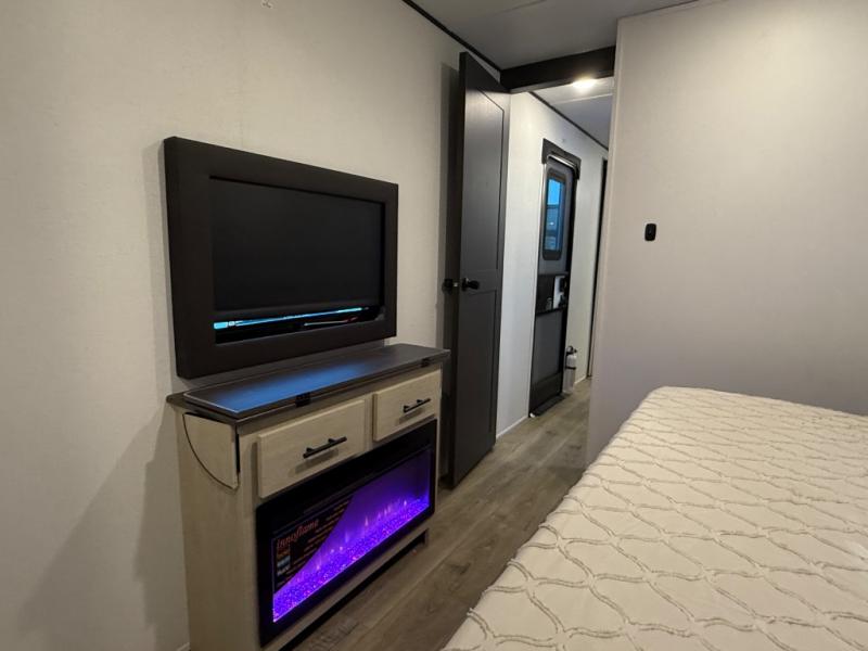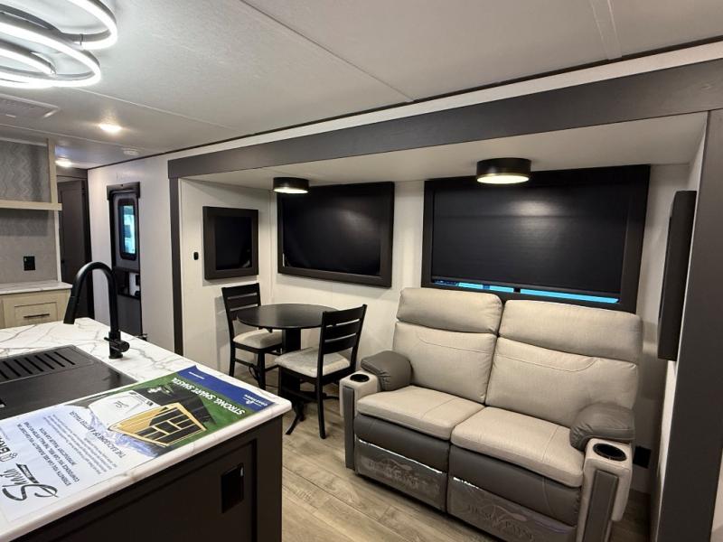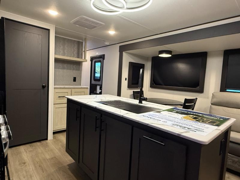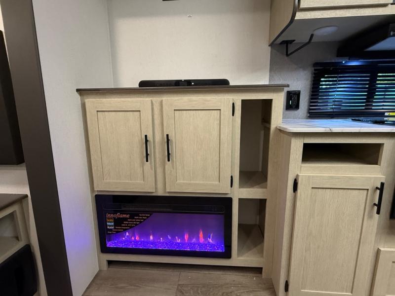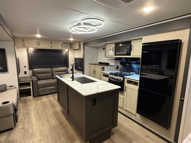The front of this travel trailer features a spacious main bedroom with a queen bed set in a slide-out to maximize walking space, plus a large wardrobe for storing clothing and essentials; across from the bed, you’ll find TV prep and a convenient flip-up top for keeping important items within reach. Down the hall is a full bathroom equipped with a shower, toilet, and countertop sink so you can skip the campground facilities. At the rear, the kitchen and living area open up with dual opposing slides, creating a roomy, comfortable space to move around. One slide hosts the entertainment center with a fireplace, along with ample countertops, a glass cooktop with oven, overhead cabinets, a 10-cu. ft. refrigerator, and a nearby pantry for dry goods. A center kitchen island with a built-in sink offers even more prep space. Opposite, the second slide provides theater seating for relaxing after a day of adventure, while the 36" round table is perfect for dining or board games, and a rear lounger sofa adds extra seating for guests.