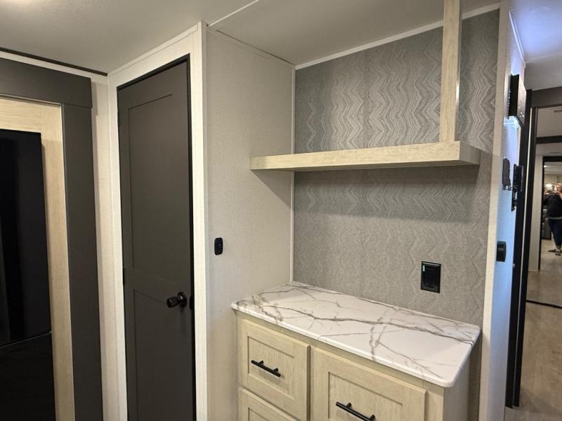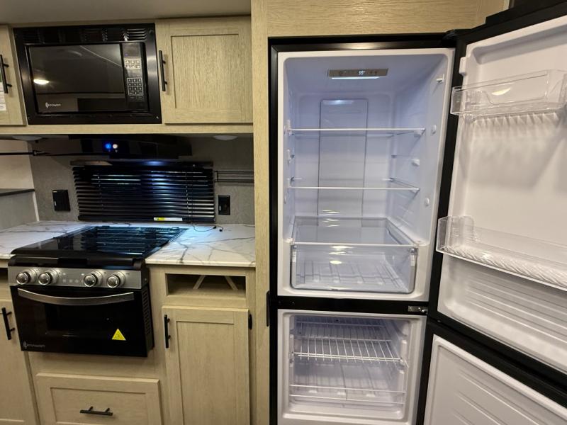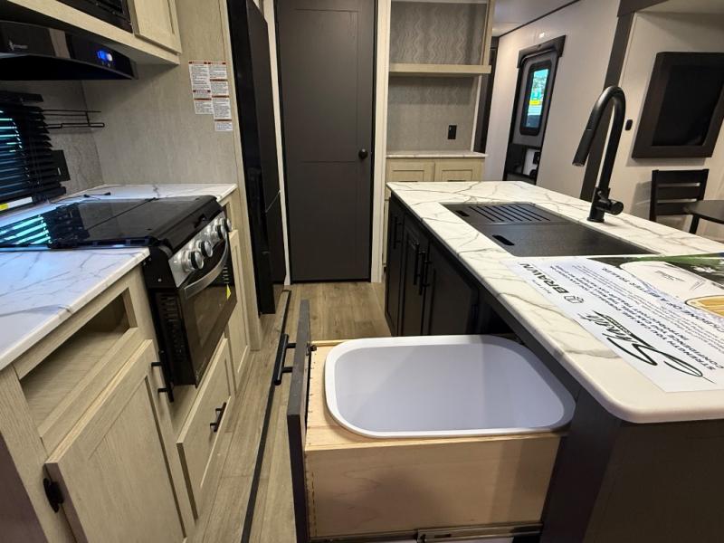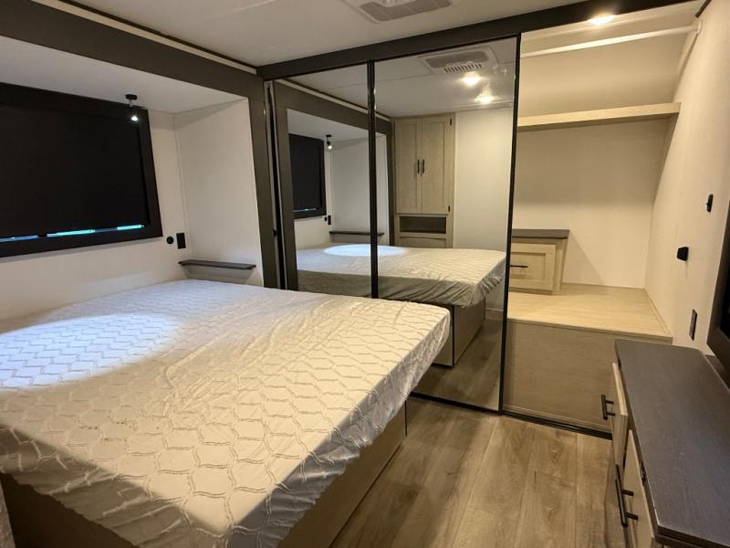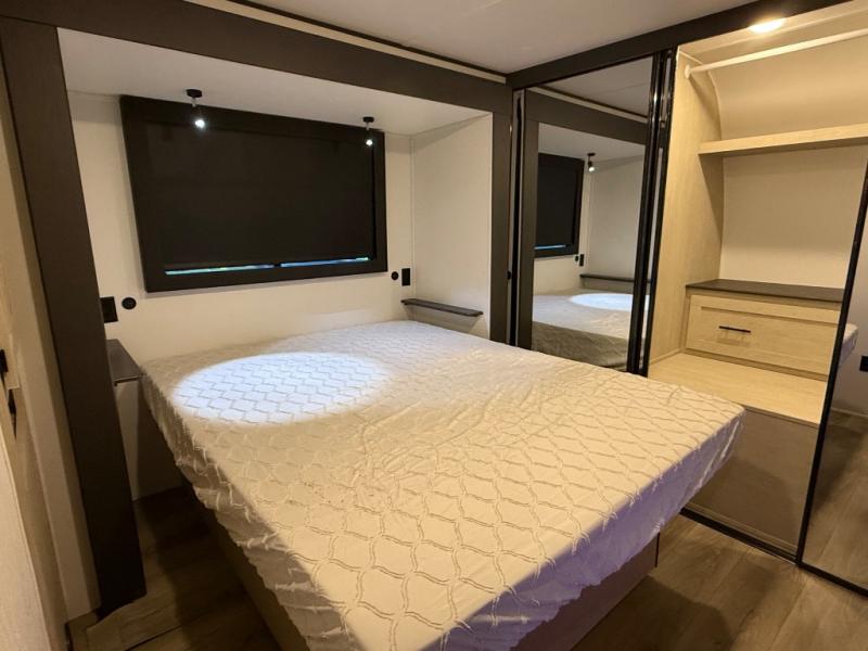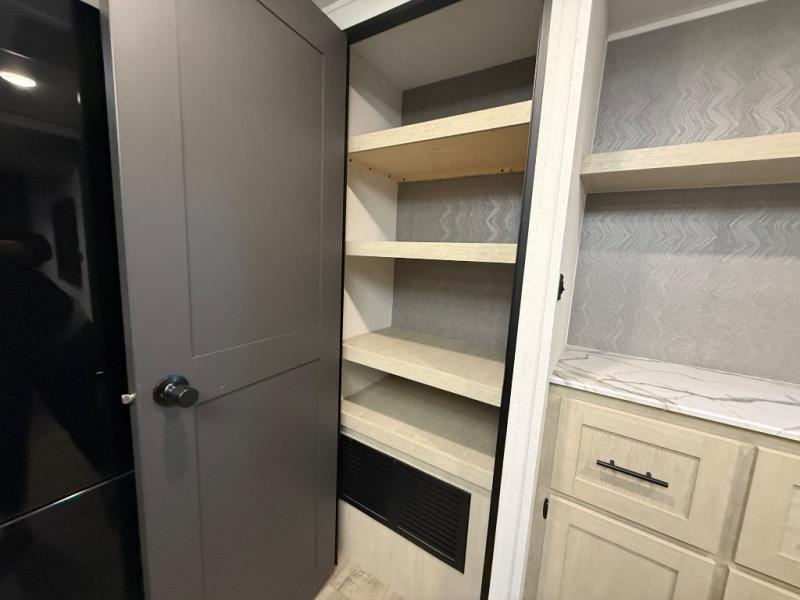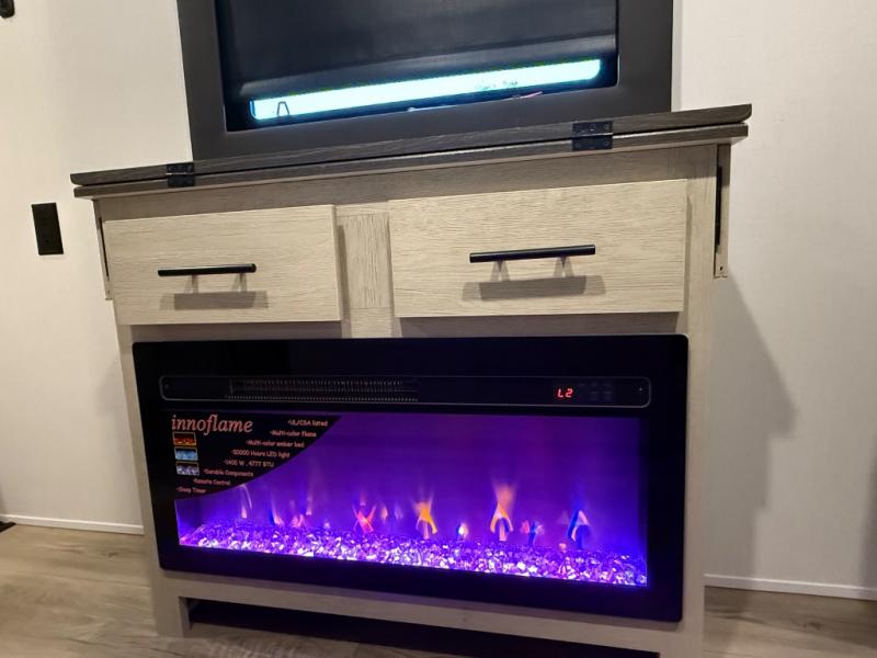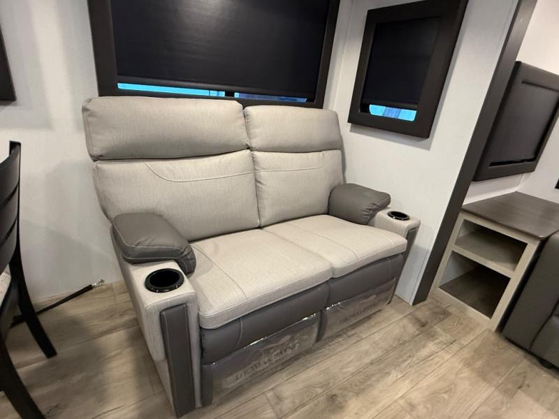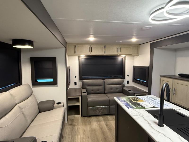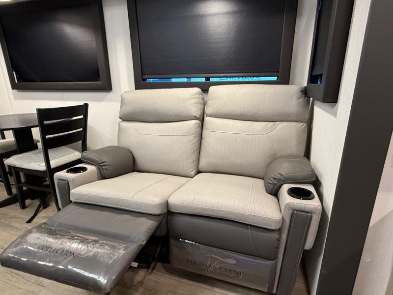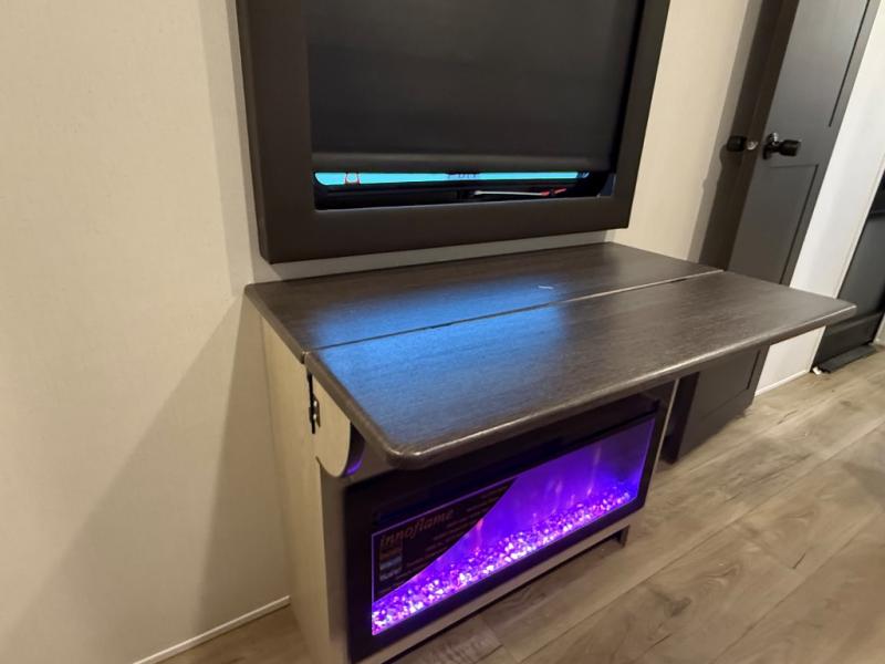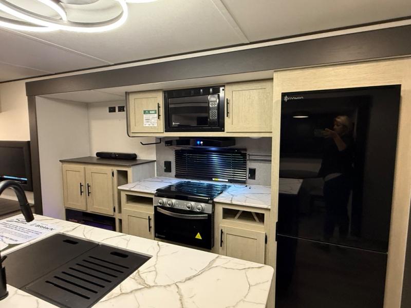 The front of this travel trailer features a spacious main bedroom with a queen bed set in a slide-out to maximize walking space, plus a large wardrobe for storing clothing and essentials; across from the bed, you’ll find TV prep and a convenient flip-up top for keeping important items within reach. Down the hall is a full bathroom equipped with a shower, toilet, and countertop sink so you can skip the campground facilities. At the rear, the kitchen and living area open up with dual opposing slides, creating a roomy, comfortable space to move around. One slide hosts the entertainment center with a fireplace, along with ample countertops, a glass cooktop with oven, overhead cabinets, a 10-cu. ft. refrigerator, and a nearby pantry for dry goods. A center kitchen island with a built-in sink offers even more prep space. Opposite, the second slide provides theater seating for relaxing after a day of adventure, while the 36" round table is perfect for dining or board games, and a rear lounger sofa adds extra seating for guests.
