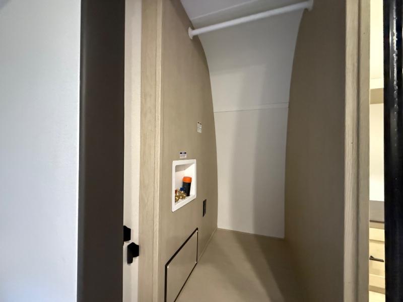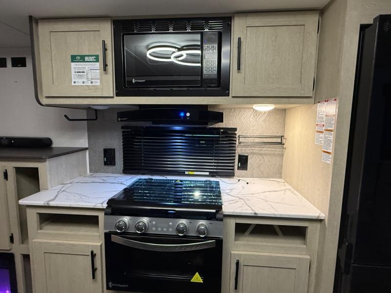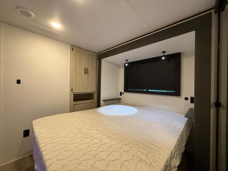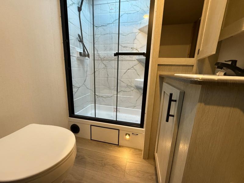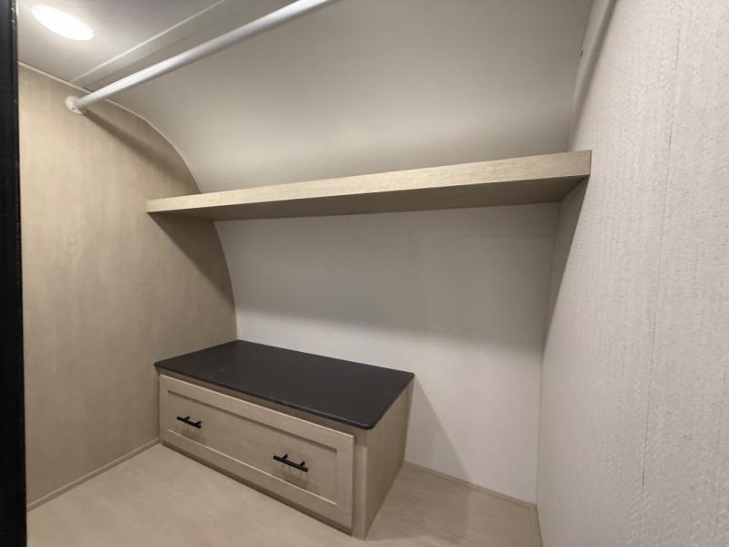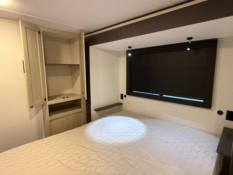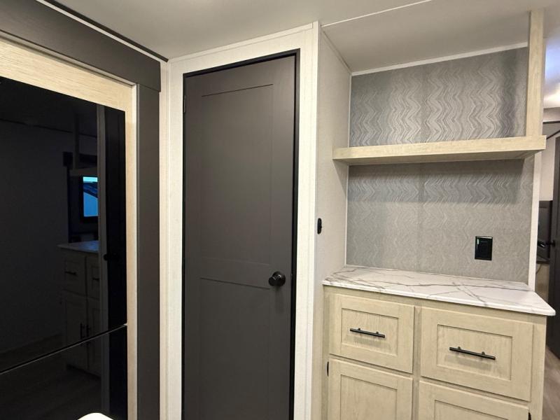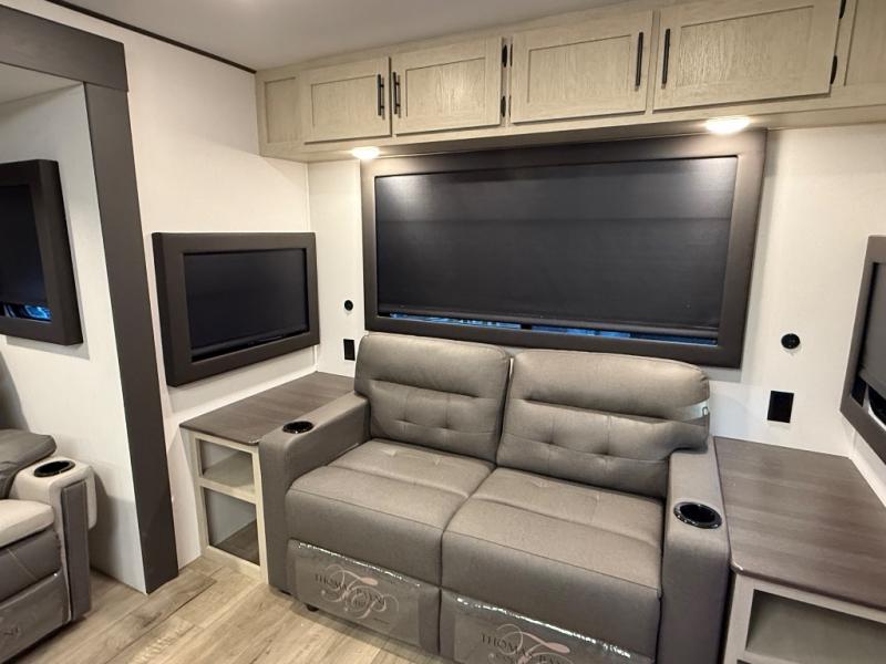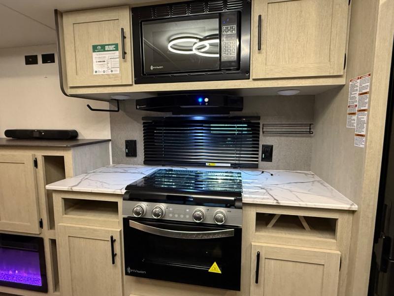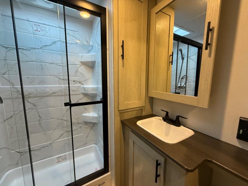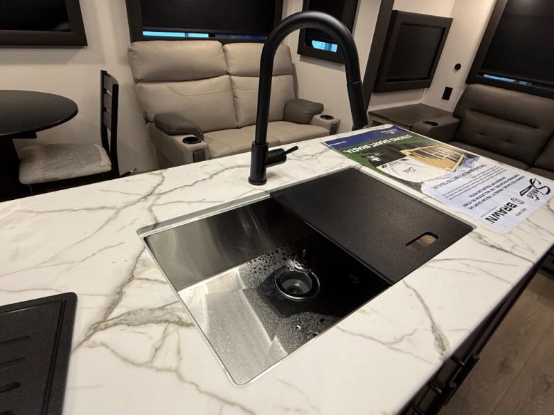 The front of this travel trailer features a spacious main bedroom with a queen bed set in a slide-out to maximize walking space, plus a large wardrobe for storing clothing and essentials; across from the bed, you’ll find TV prep and a convenient flip-up top for keeping important items within reach. Down the hall is a full bathroom equipped with a shower, toilet, and countertop sink so you can skip the campground facilities. At the rear, the kitchen and living area open up with dual opposing slides, creating a roomy, comfortable space to move around. One slide hosts the entertainment center with a fireplace, along with ample countertops, a glass cooktop with oven, overhead cabinets, a 10-cu. ft. refrigerator, and a nearby pantry for dry goods. A center kitchen island with a built-in sink offers even more prep space. Opposite, the second slide provides theater seating for relaxing after a day of adventure, while the 36" round table is perfect for dining or board games, and a rear lounger sofa adds extra seating for guests.