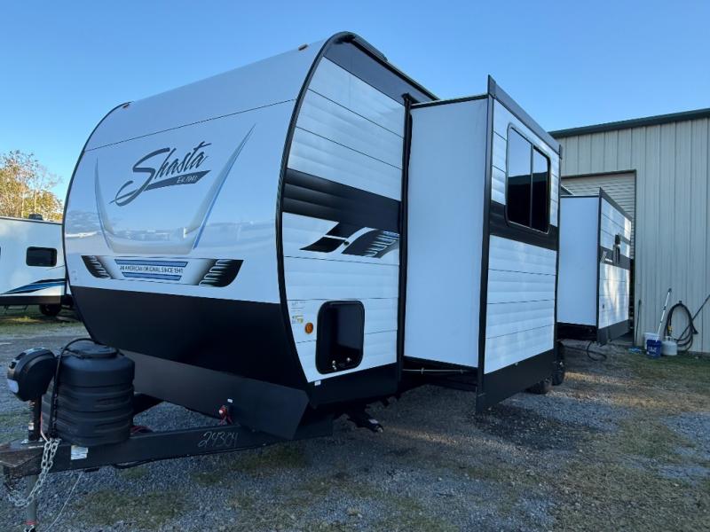 With each Shasta travel trailer by Shasta RVs, premium construction products are used such as 2x2 wood studs 16" on center or less, tinted black-framed radius safety glass windows, and full pass-through storage. Also included is an aerodynamic radius front profile, a front-colored rock guard to protect against road debris, a straight axle with electric breaks, and a power tongue jack for easy setup. The interior offers pocket-bored and screwed cabinets, USB charging stations, an pull down faucet, and more providing value and convenience. The 200W solar panel comes with a 30 amp controller, and the tankless water heater will provide endless hot showers.