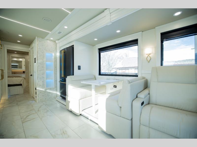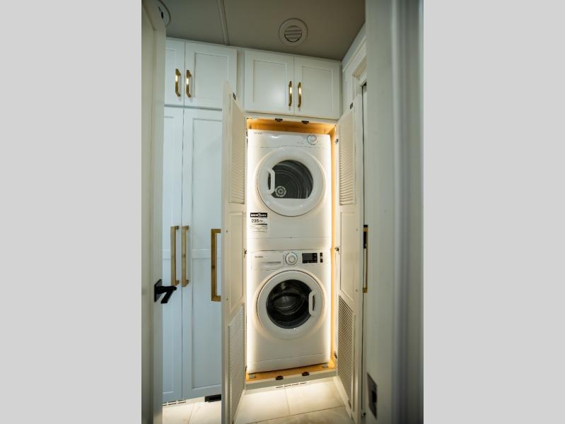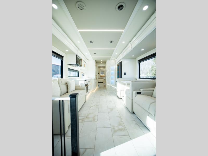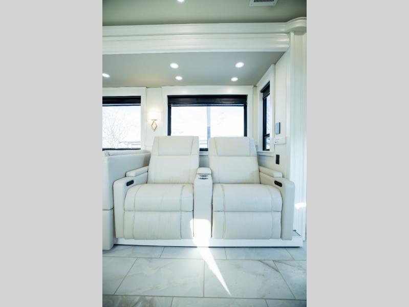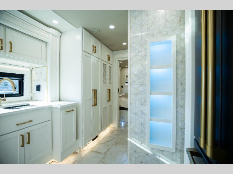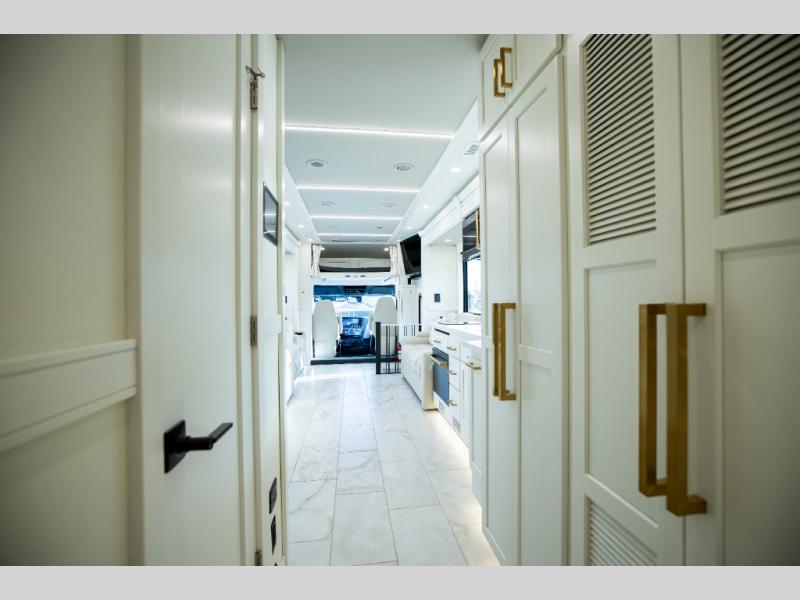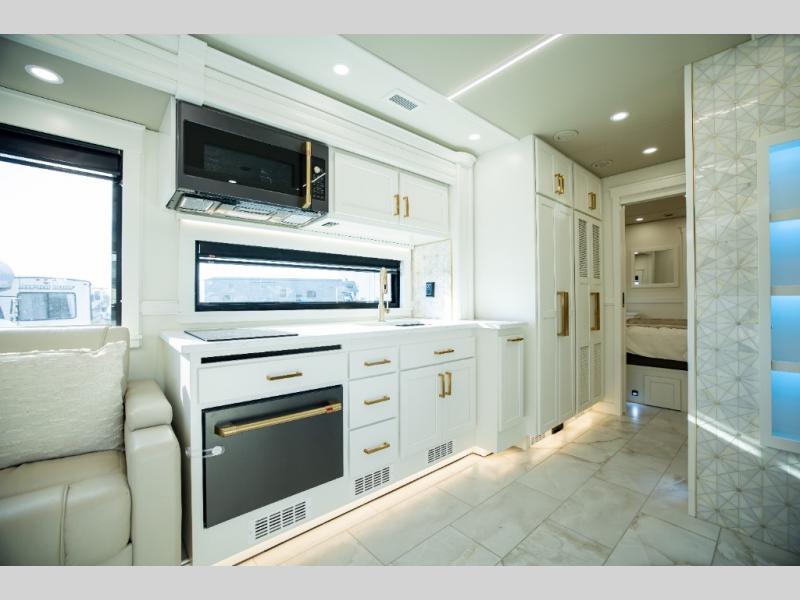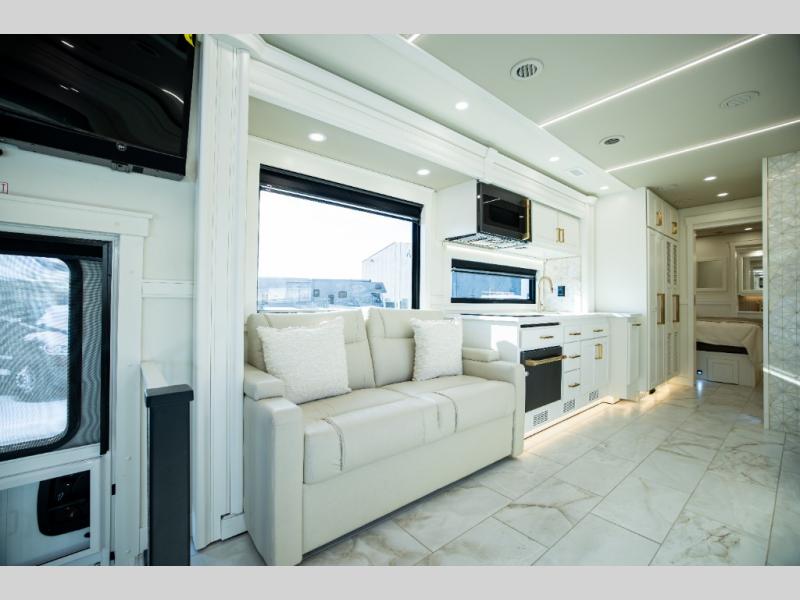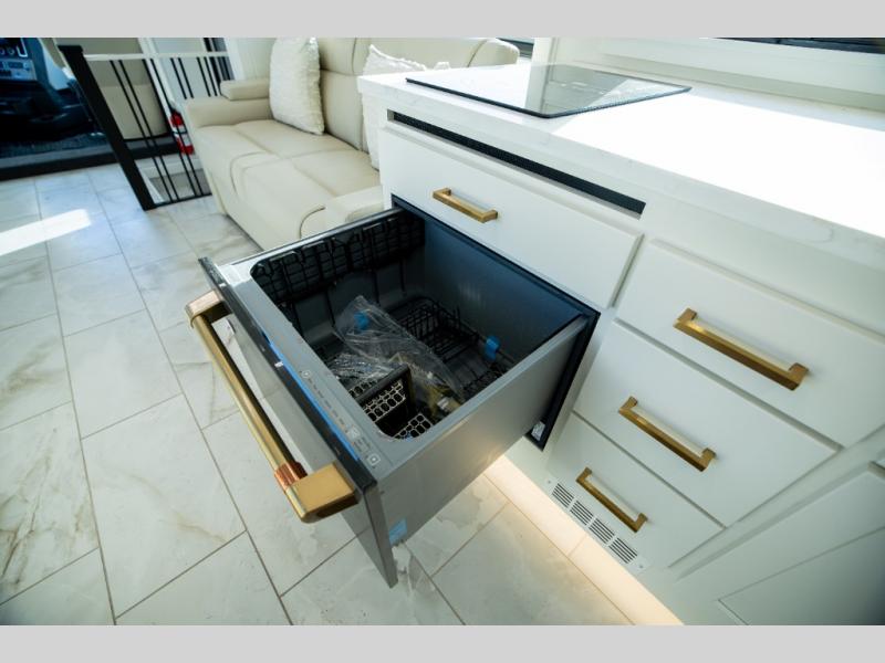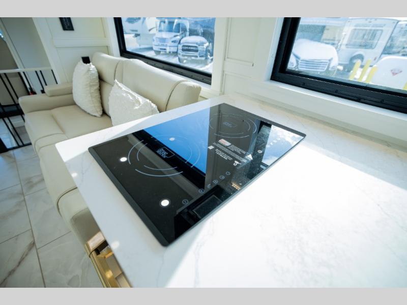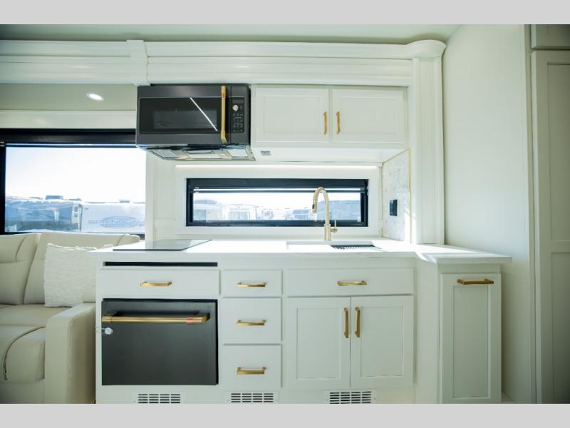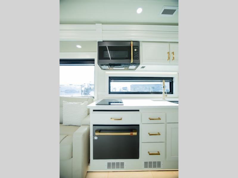Expect to find comfort and space at every turn in this coach with four slides, a bath a half, plus a flip-up bed or storage in the cab! Once you park for the day, you can make lunch for everyone on the two-burner induction cooktop or in the over-the-range convection microwave, and there is a GE Cafe refrigerator to keep your food fresh. Your crew can dine at the booth dinette, then relax on the Villa theater seating and Villa hide-a-bed sofa once you've cleaned up. A half bath is right off of the kitchen for quick and easy access, and you'll find the full bath in the back, creating a master bedroom you are sure to love. Here, a mini king bed slide provides a great night's rest, and there is a large closet slide to keep your things organized. This coach also features washer and dryer prep if you plan to add these appliances!