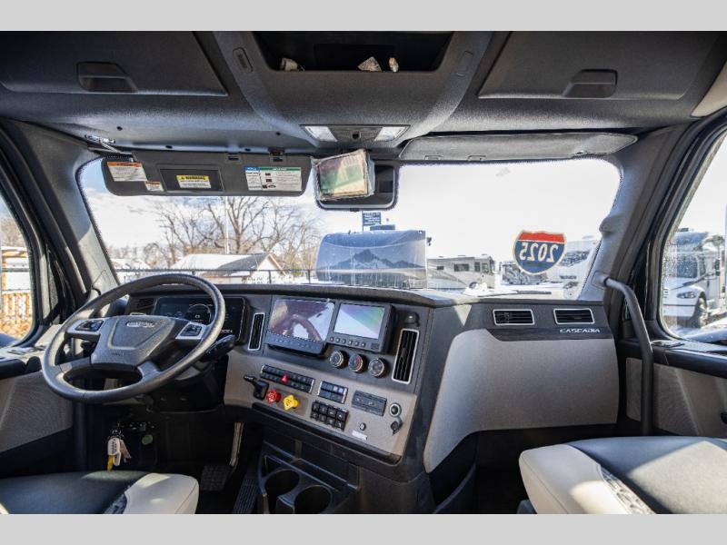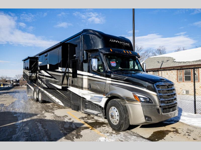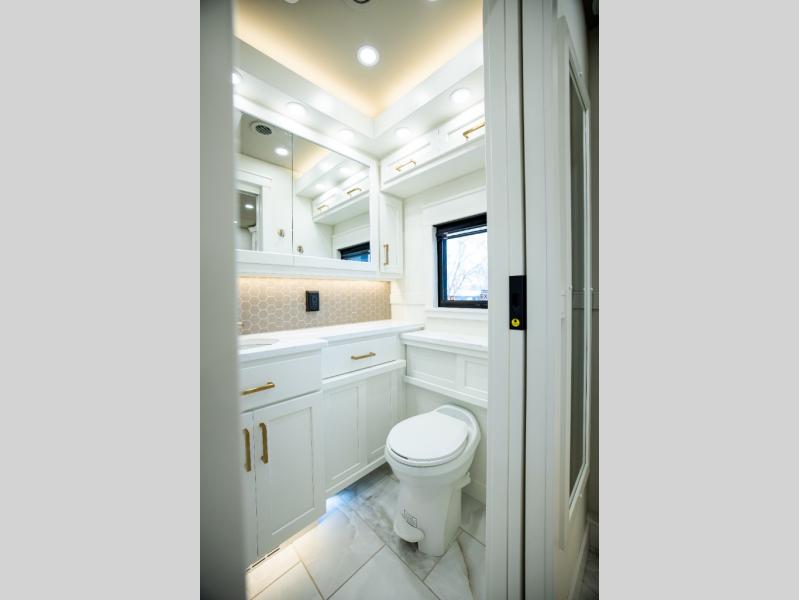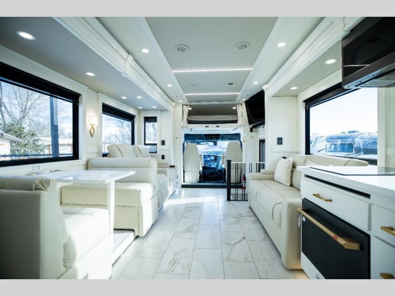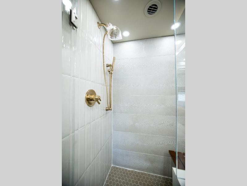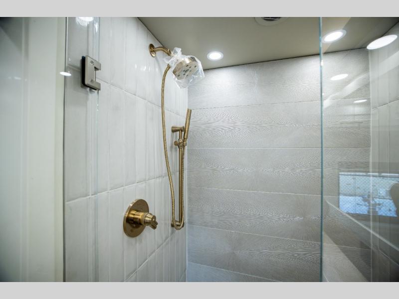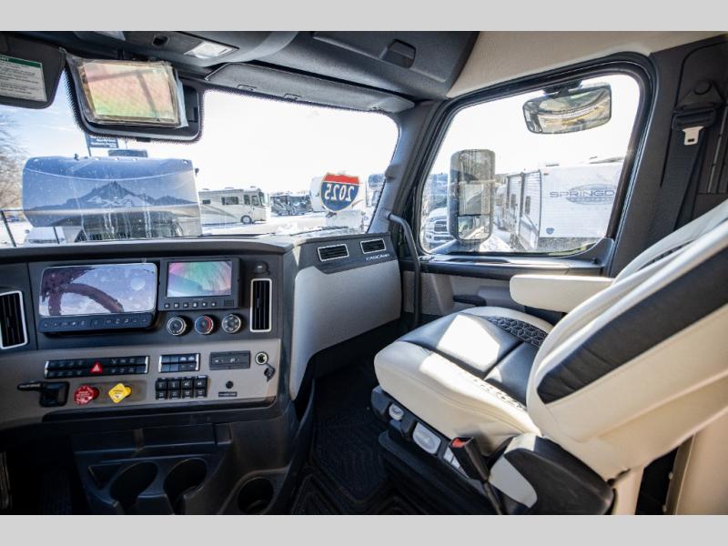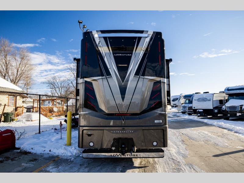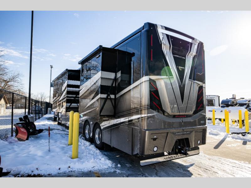 With any Adventure Super C diesel motorhome by ShowHauler, you will find a durable coach made to last thanks to the all-steel cage construction, insulated walls, floors, and ceilings, plus the one-piece 100% walk-on roof! There are lighted storage compartments outside to keep your gear secure, along with a lighted grab handle, and exterior hot/cold shower in the wet bay. You can keep your excursions powered up with the 12.5W Onan diesel generator, 1200W solar package, and Battleborn lithium battery pack. There is also a 360-degree camera/monitor for easy maneuvering and a Firefly Multi-Plex lighting control system for added convenience. You will fall in love with the interior of the Adventure with hardwood cabinets and drawers, porcelain heated tile throughout, Quartz countertops with backsplash in the kitchen, and a tiled shower with a glass door in the bath!