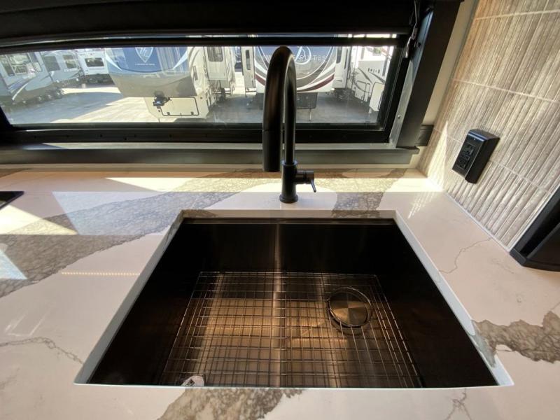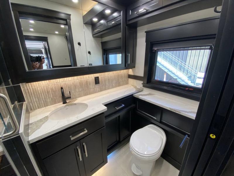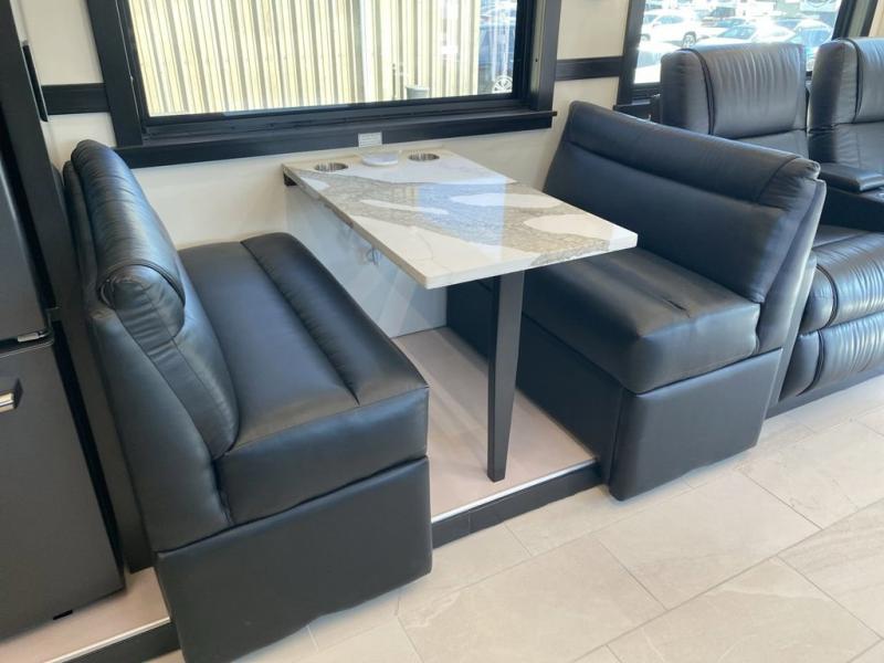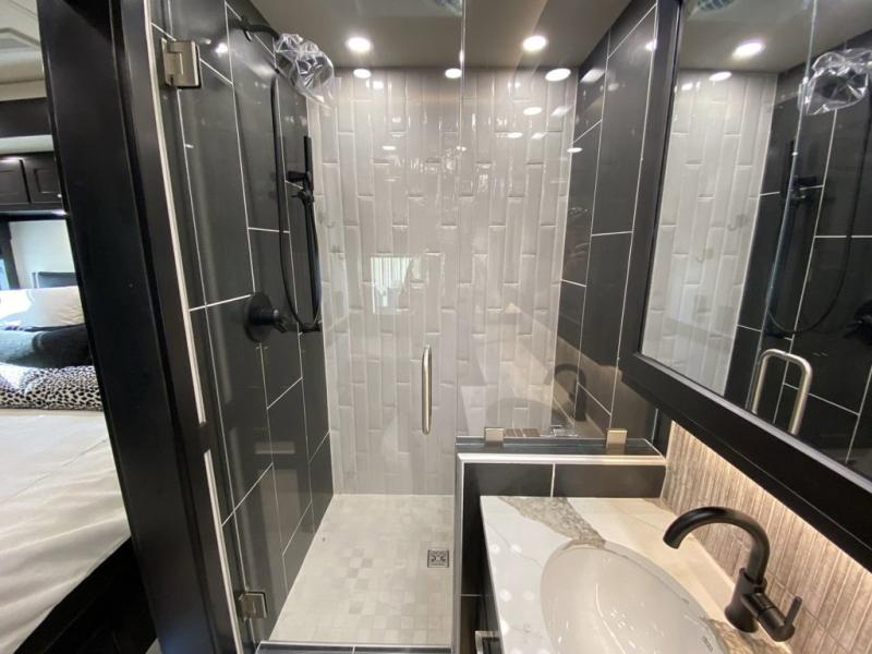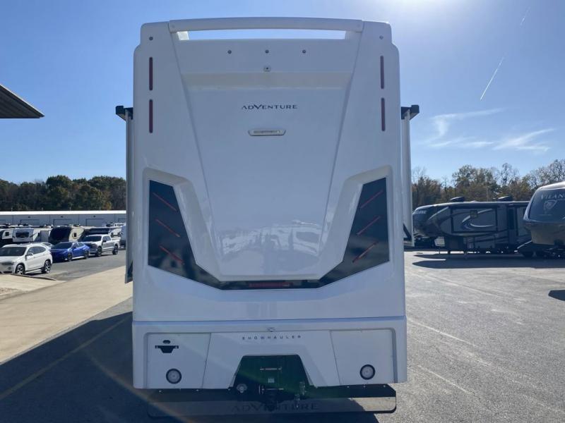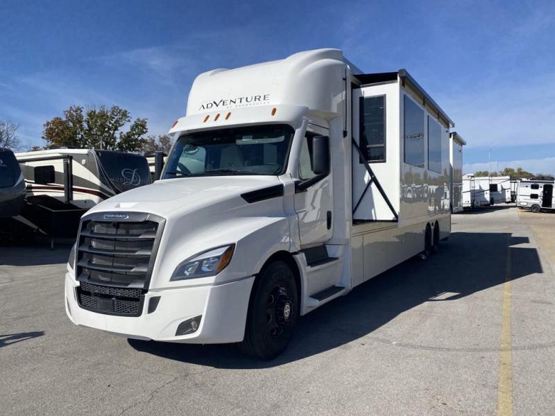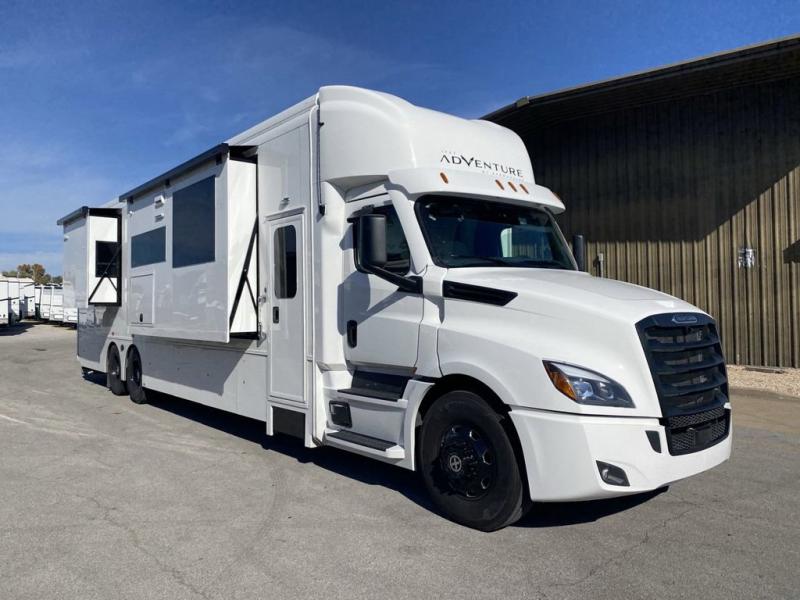 With any Adventure Super C diesel motorhome by ShowHauler, you will find a durable coach made to last thanks to the all-steel cage construction, insulated walls, floors, and ceilings, plus the one-piece 100% walk-on roof! There are lighted storage compartments outside to keep your gear secure, along with a lighted grab handle, and exterior hot/cold shower in the wet bay. You can keep your excursions powered up with the 12.5W Onan diesel generator, 1200W solar package, and Battleborn lithium battery pack. There is also a 360-degree camera/monitor for easy maneuvering and a Firefly Multi-Plex lighting control system for added convenience. You will fall in love with the interior of the Adventure with hardwood cabinets and drawers, porcelain heated tile throughout, Quartz countertops with backsplash in the kitchen, and a tiled shower with a glass door in the bath!